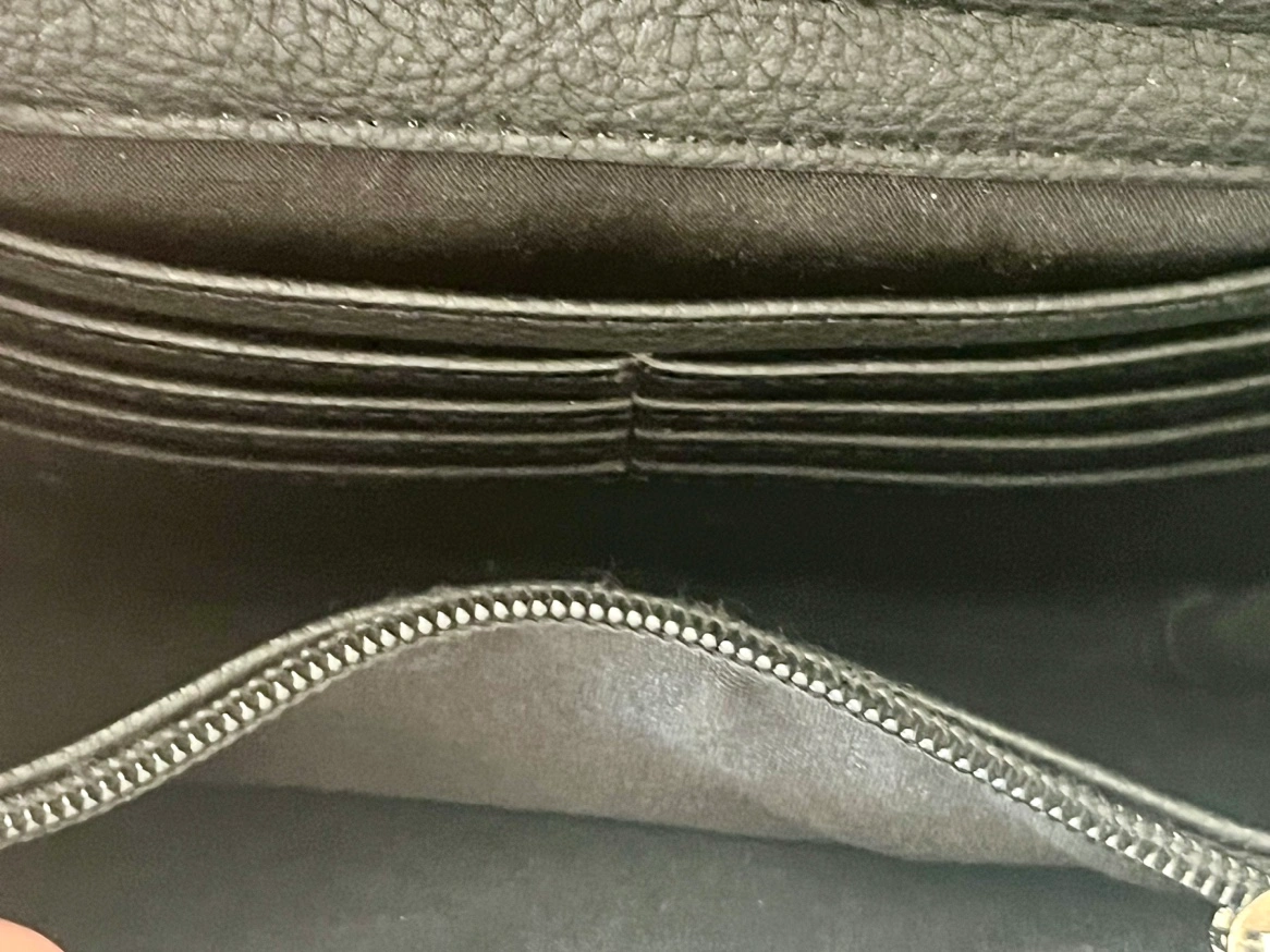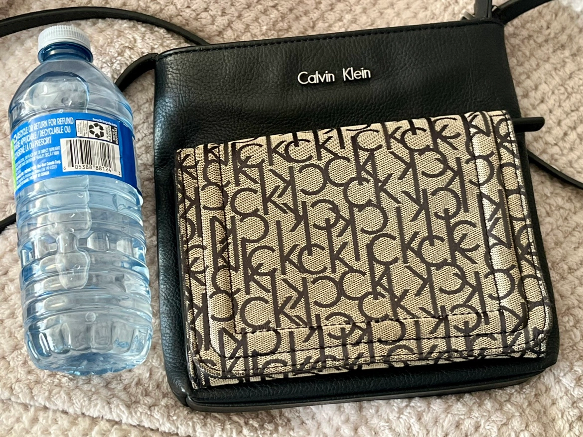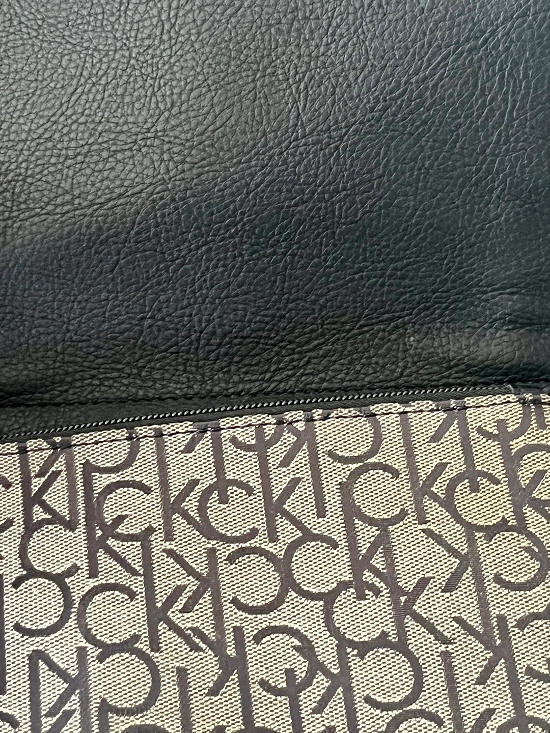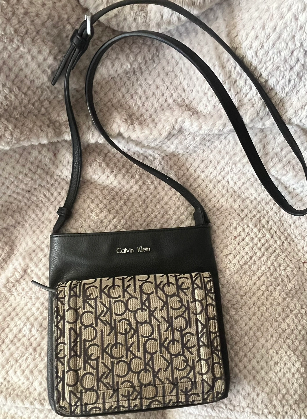 Small black crossbody bag with a beige and brown Calvin Klein logo pattern on the front flap. It has a zipper closure and a long adjustable strap.