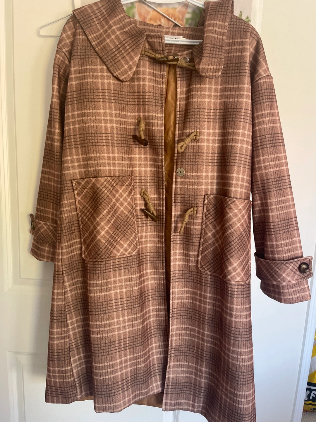 Long, brown coat .Features two large pockets at the front. Size M.