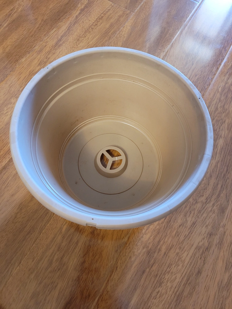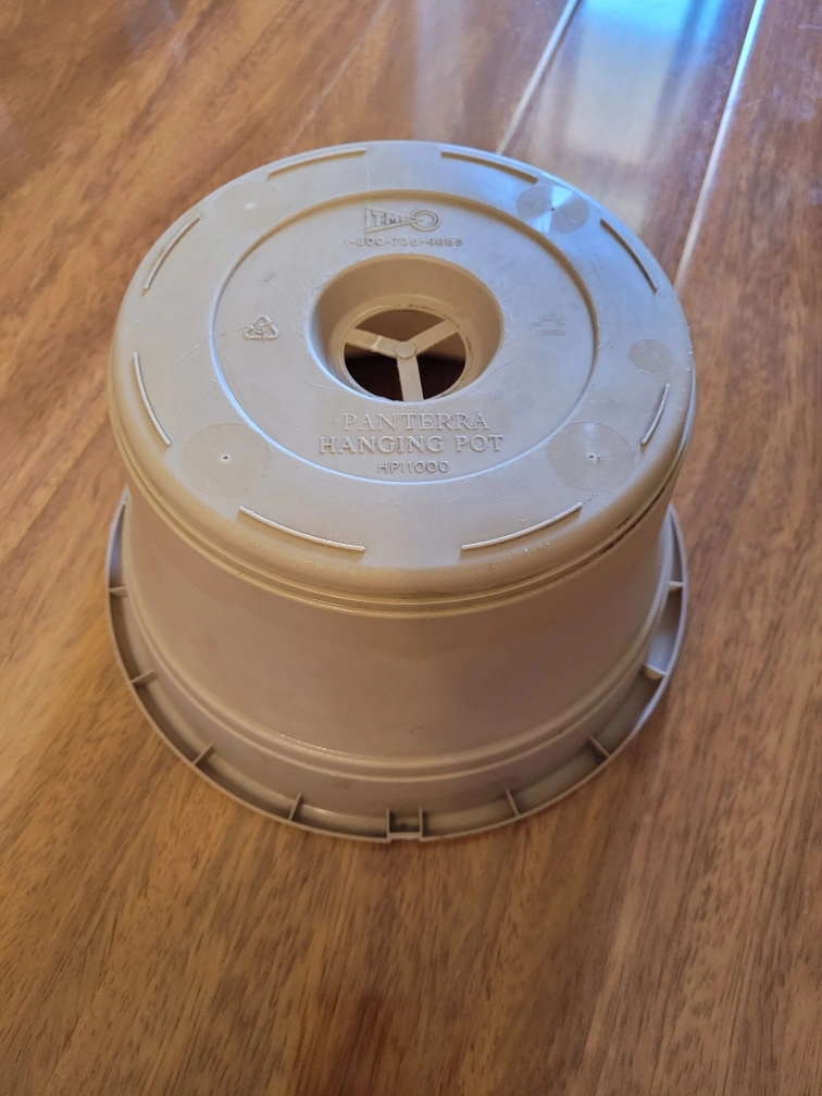 Beige plastic hanging pot. Has a drainage hole. Approx 10 inches in diameter.