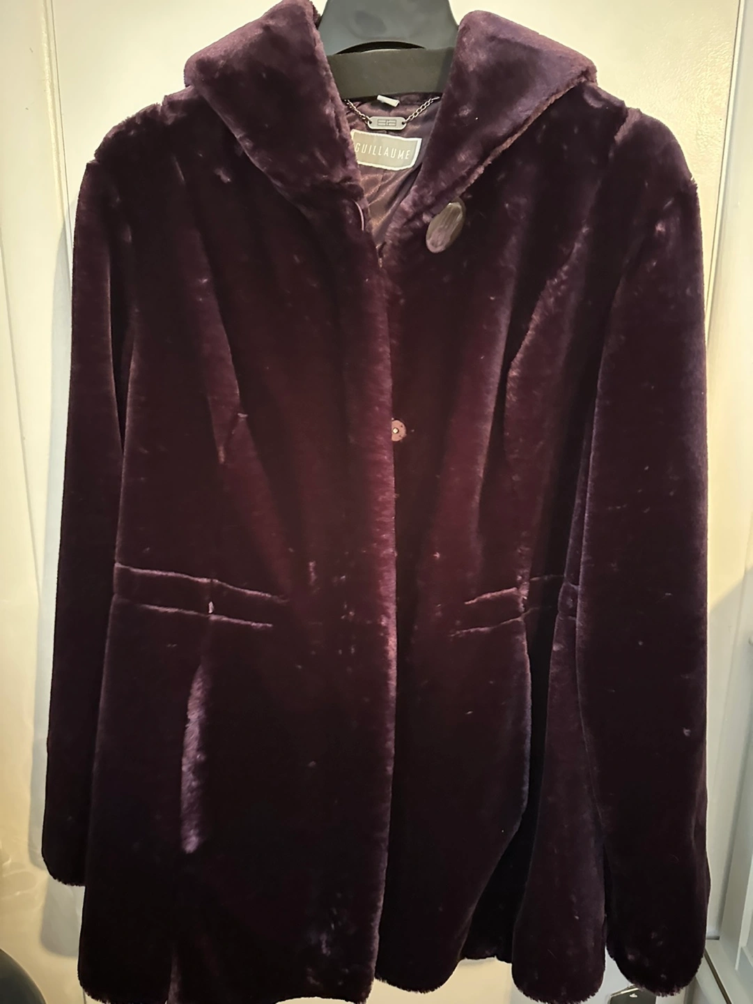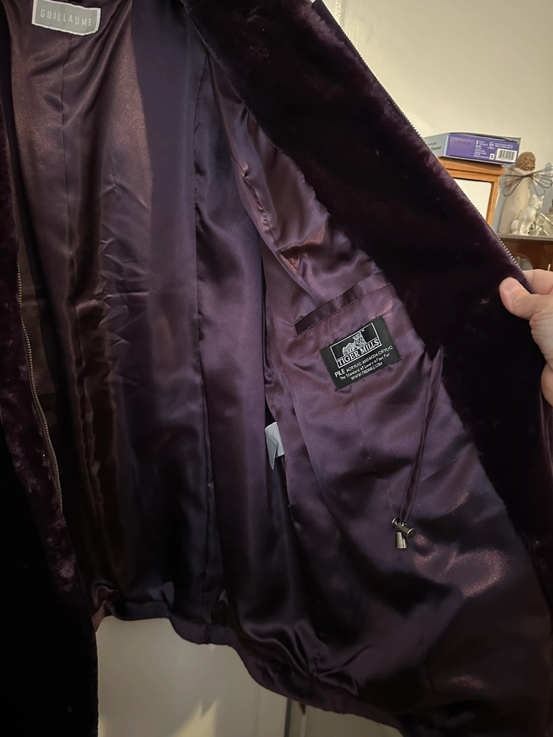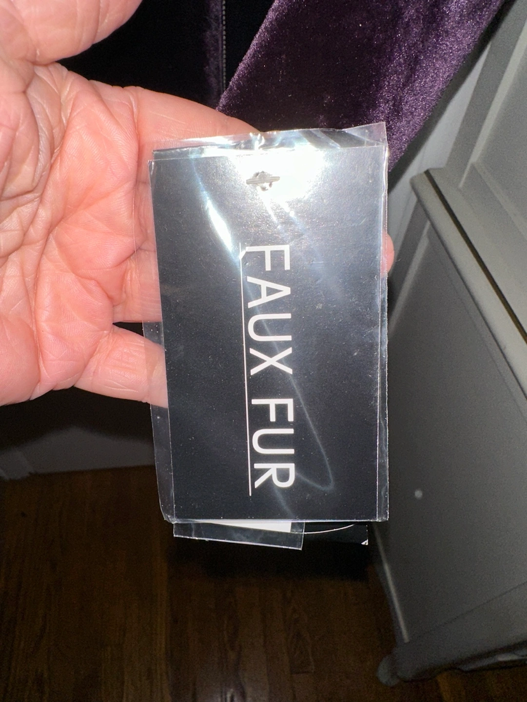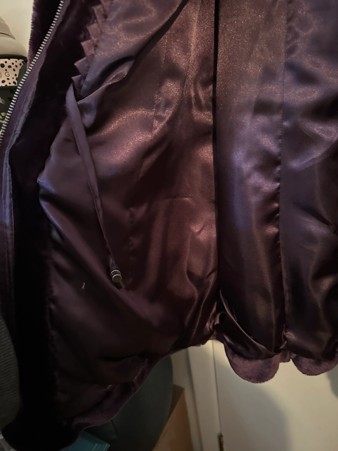 Purple faux fur coat with a hood. It has a satin lining. The coat is in mint condition. It has two pockets on the front and an interior pocket. Zipper closure with snap buttons. Interior lining is perfect no rips or loose threads, zipper works and snap buttons are secure, comes with extra buttons. Brand new with tags, never worn, smoke free home.