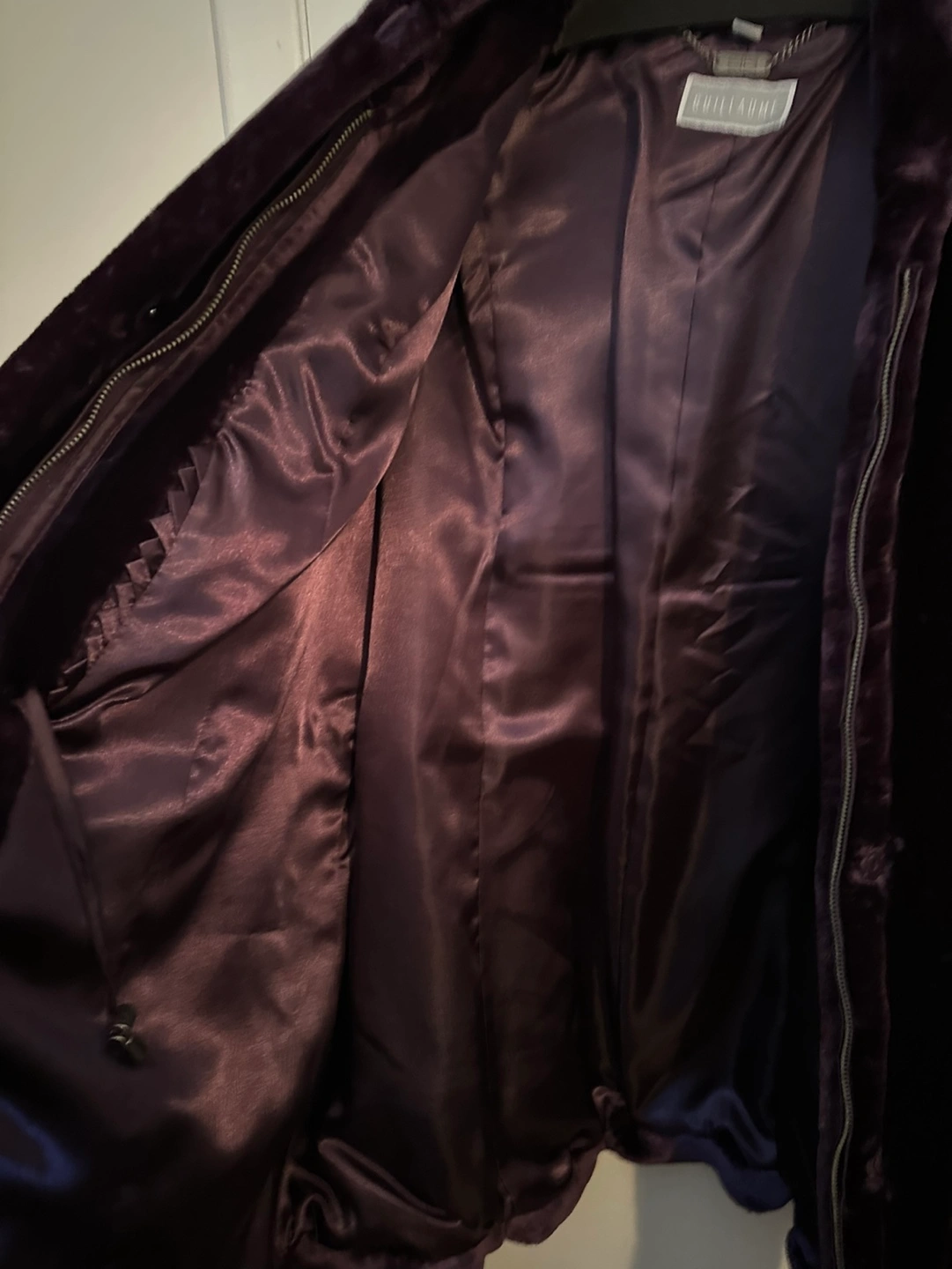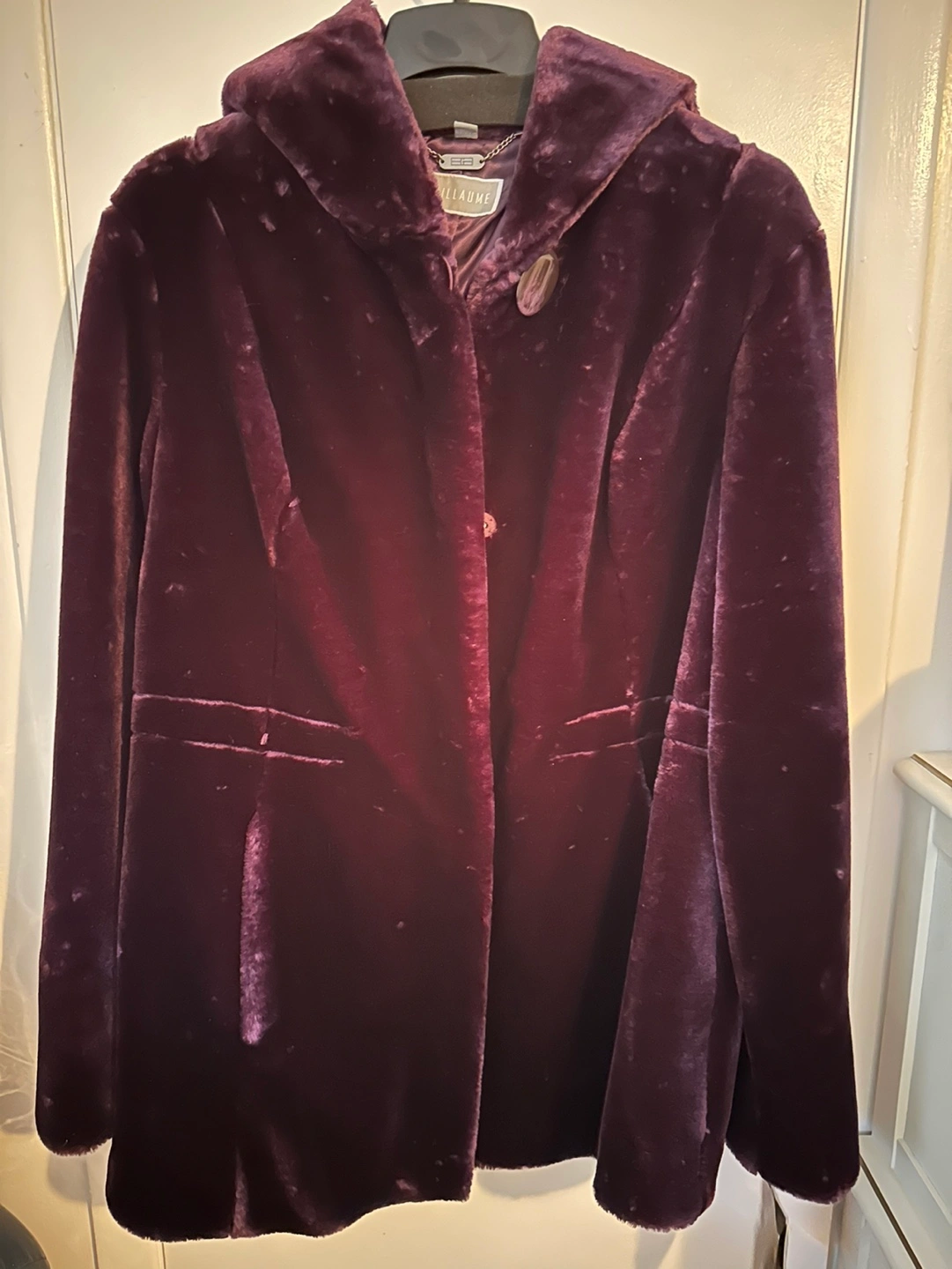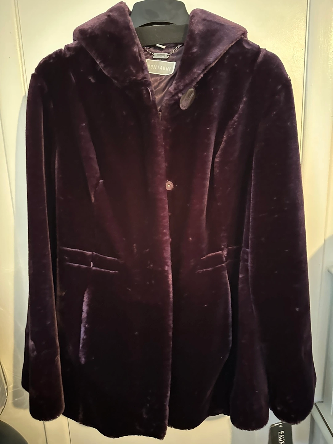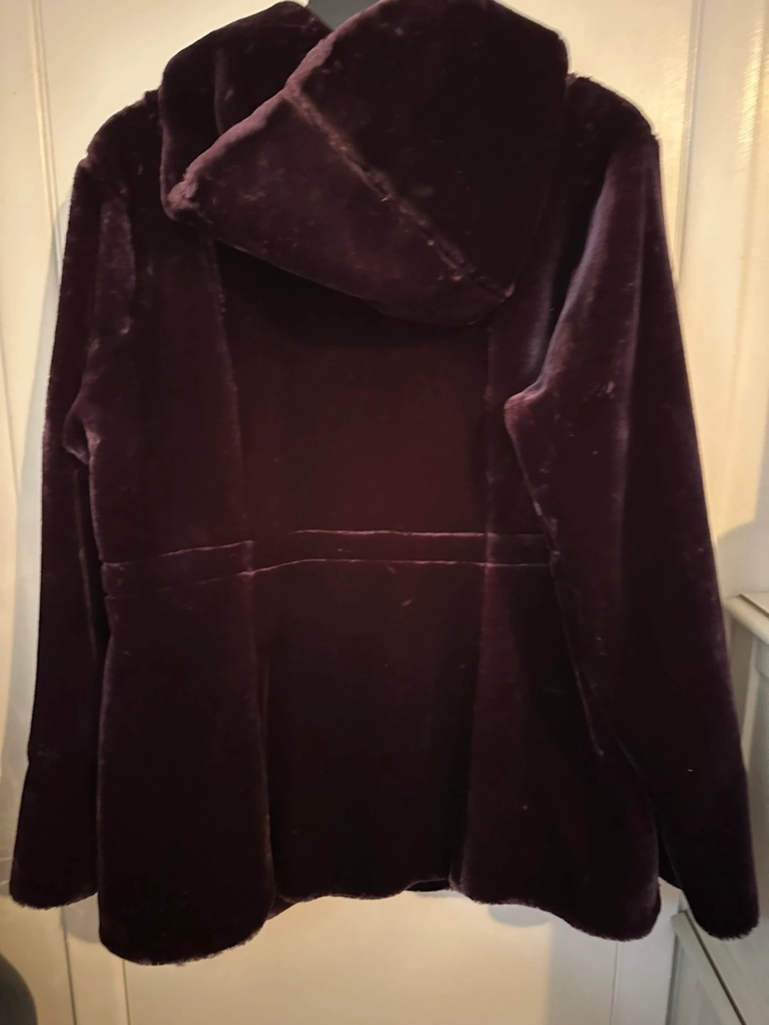 Purple faux fur coat with a hood. It has a satin lining. The coat is in mint condition. It has two pockets on the front and an interior pocket. Zipper closure with snap buttons. Interior lining is perfect no rips or loose threads, zipper works and snap buttons are secure, comes with extra buttons. Brand new with tags, never worn, smoke free home.