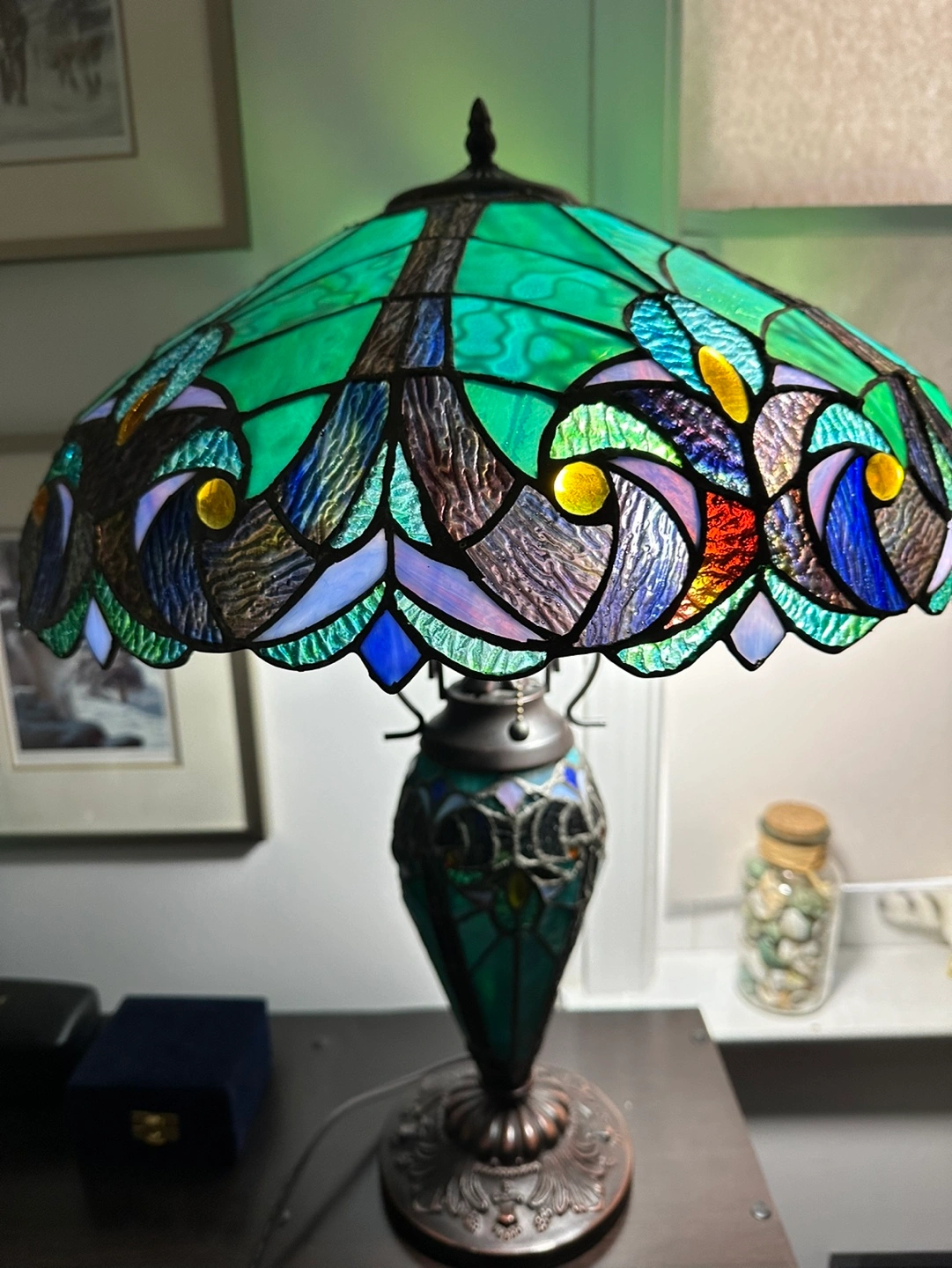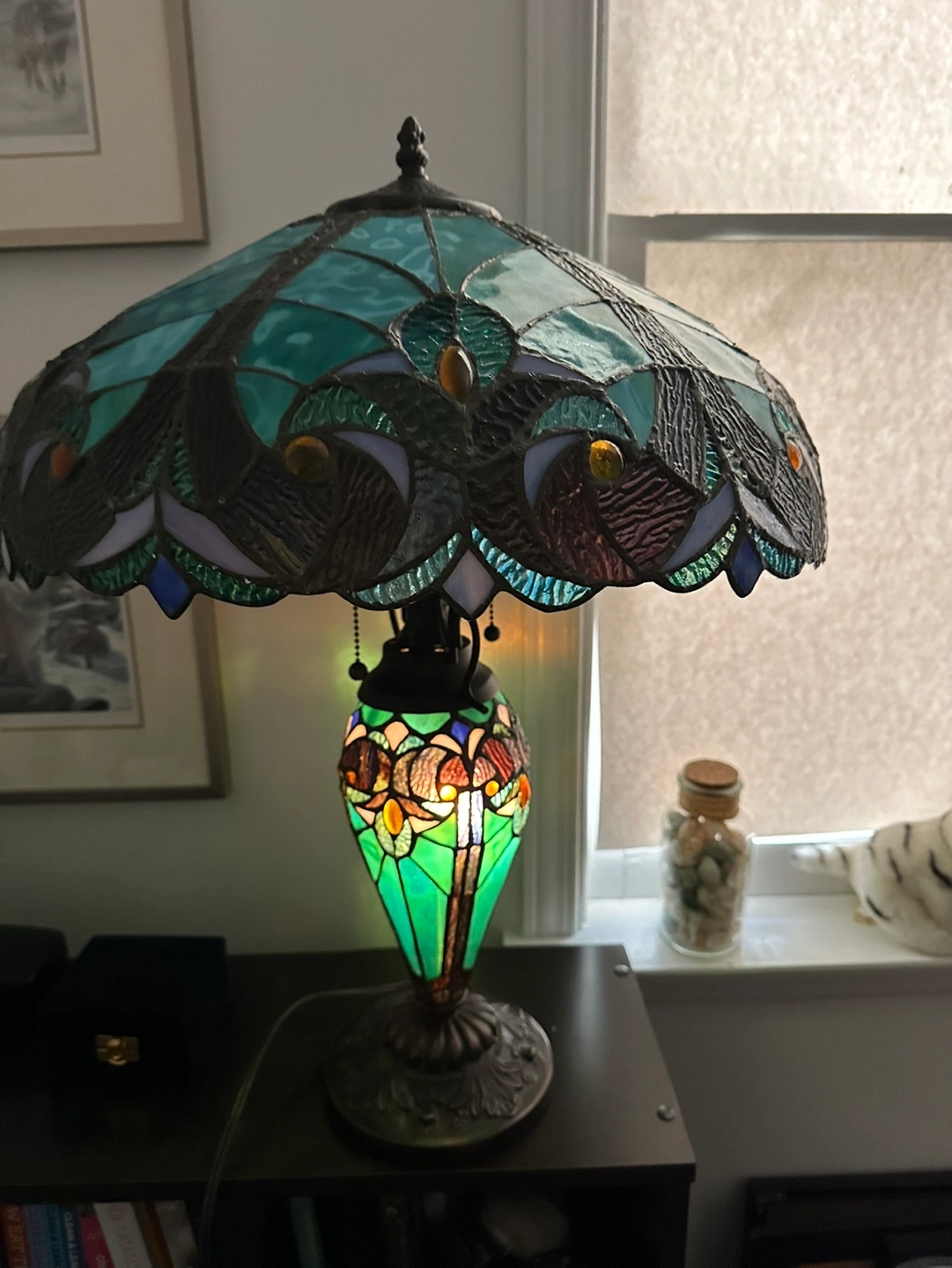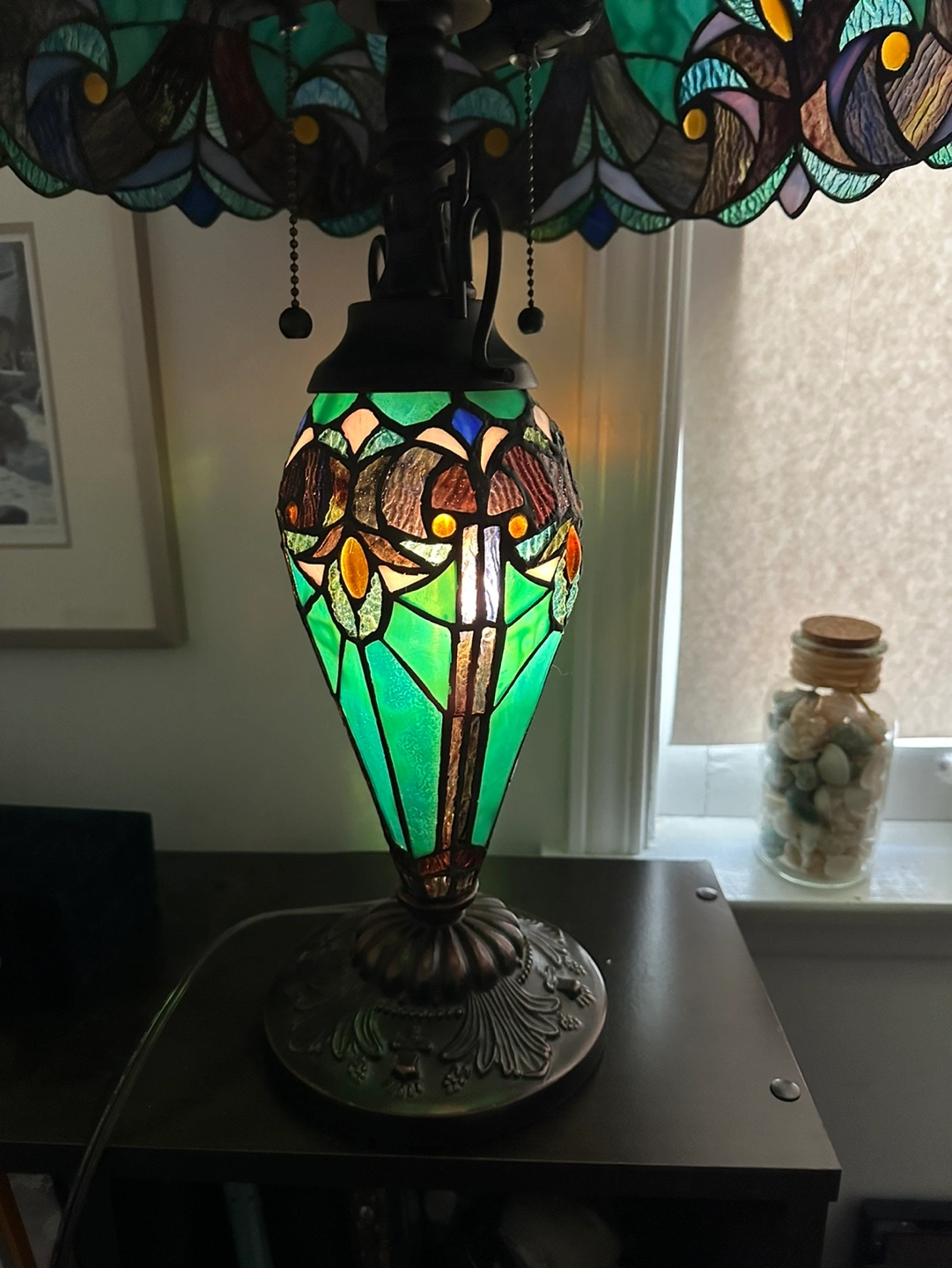 Beautiful Large Tiffany style stained glass table lamp with a green, blue, and purple floral pattern. Features a round base with a bulbous shaped shade and bronze base. The lamp has a chain pull for turning the light on and off or can use the switch on the cord. No chips or cracks in the glass cord has some slight damage see photo 8 but lamp is fully functional. Takes two light bulbs but can use one only depending on wattage, one brand new 40 watt bulb included. Retails for over $300. Smoke free home.