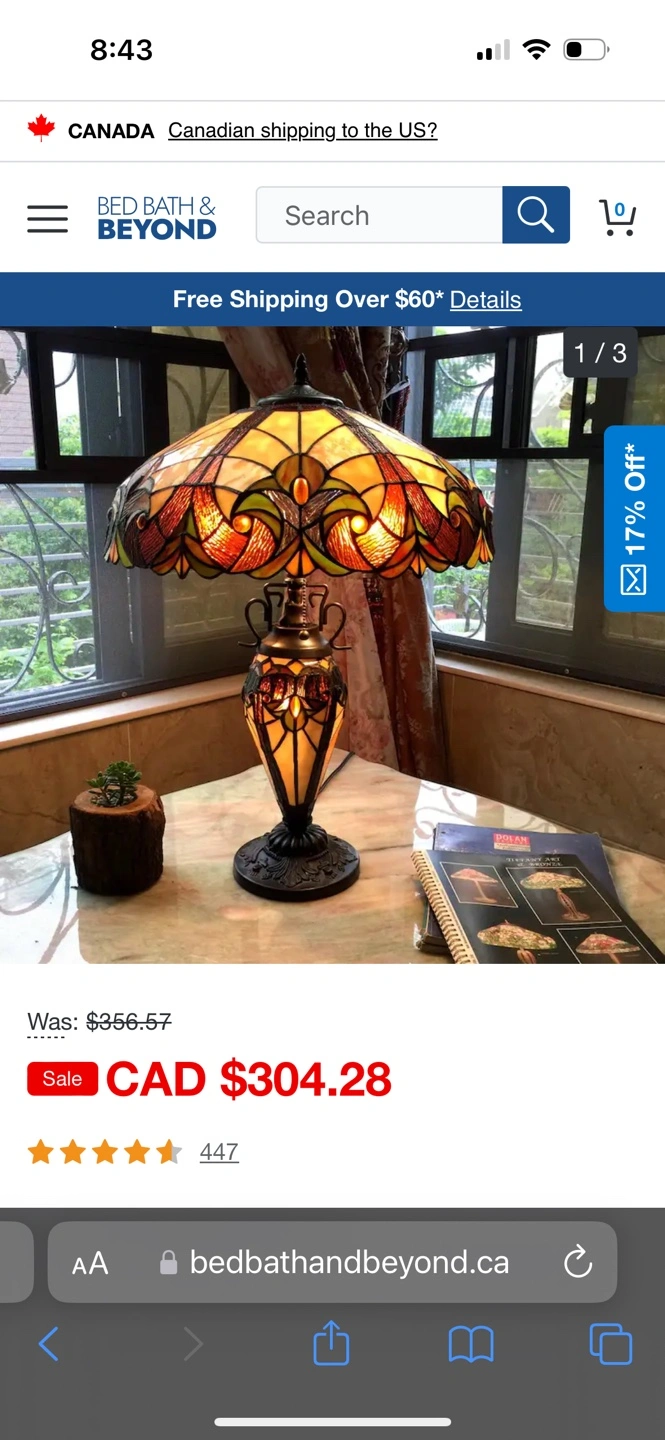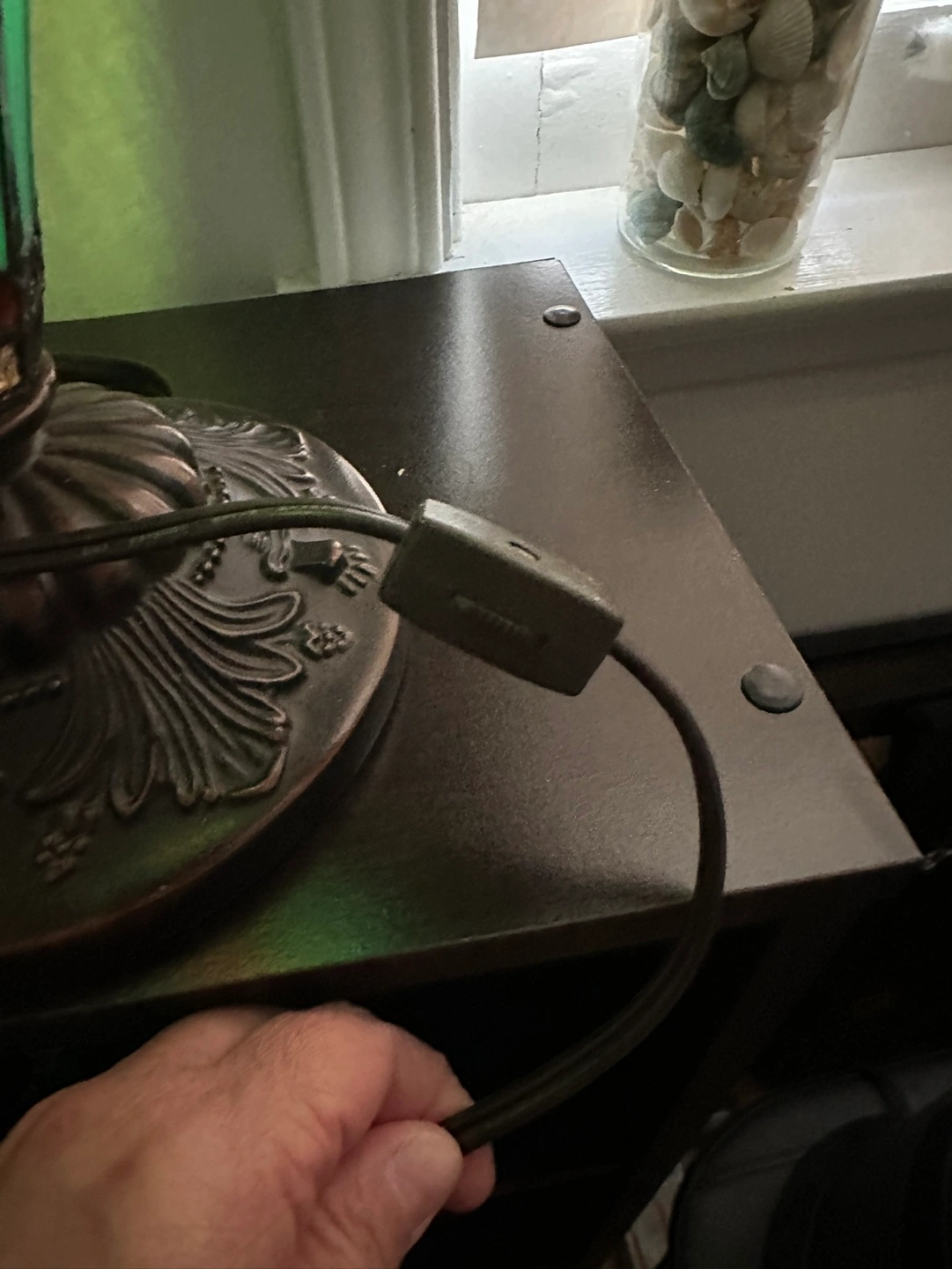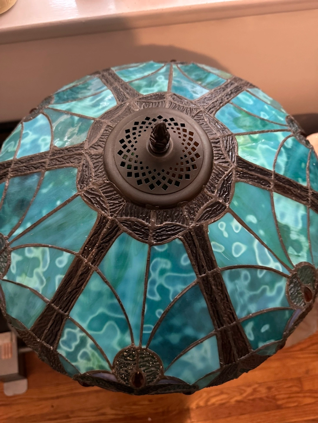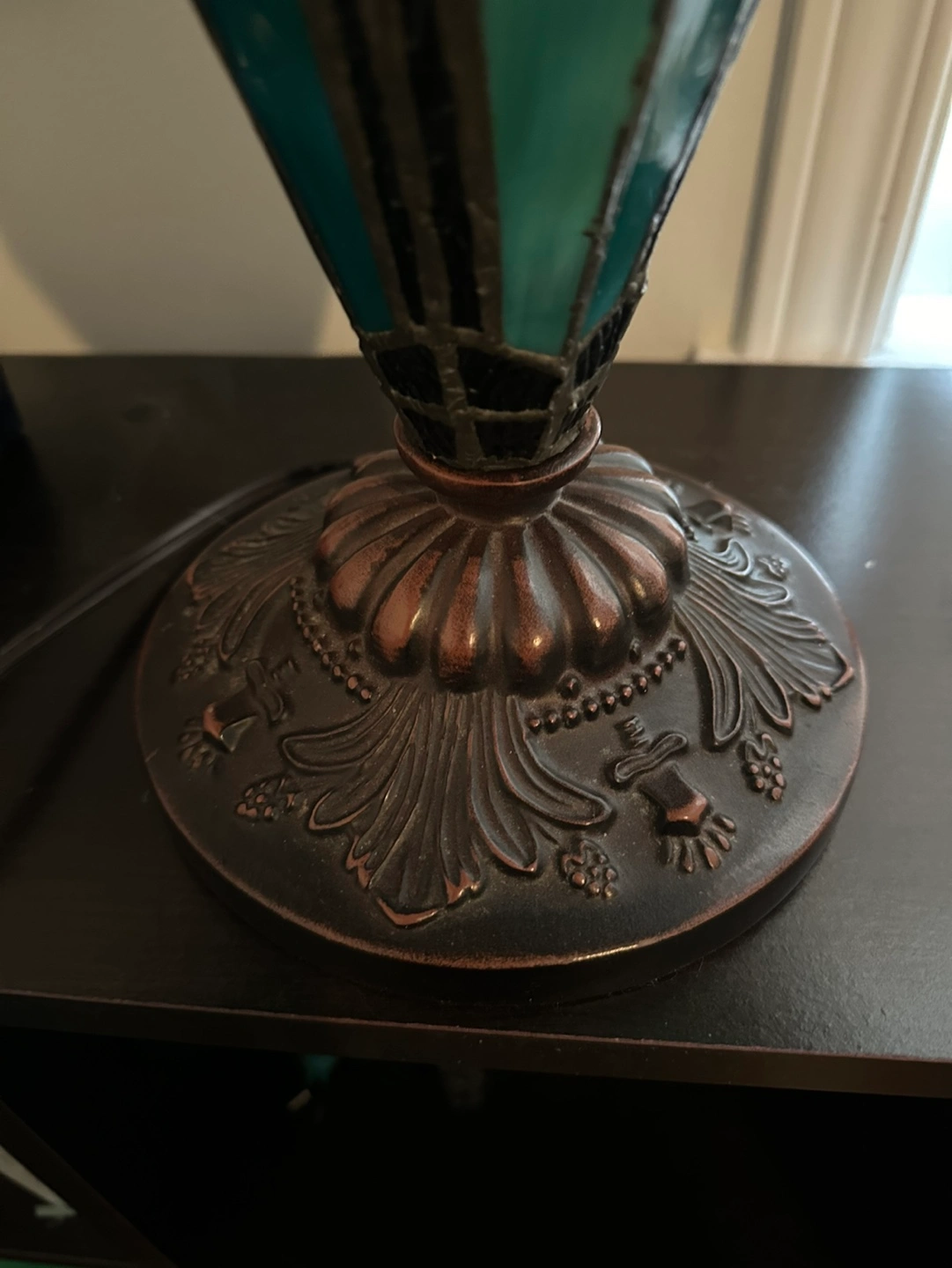 Beautiful Large Tiffany style stained glass table lamp with a green, blue, and purple floral pattern. Features a round base with a bulbous shaped shade and bronze base. The lamp has a chain pull for turning the light on and off or can use the switch on the cord. No chips or cracks in the glass cord has some slight damage see photo 8 but lamp is fully functional. Takes two light bulbs but can use one only depending on wattage, one brand new 40 watt bulb included. Retails for over $300. Smoke free home.