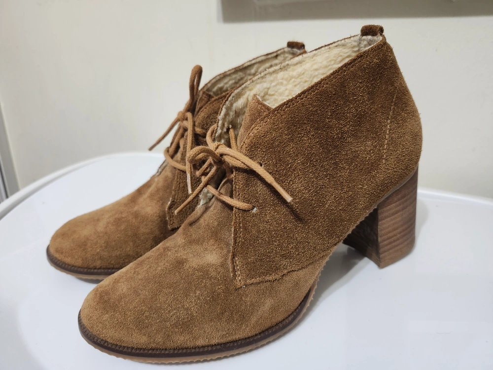 Suede ankle boots with a block heel and lace up closure. Furry lining. Very good condition.