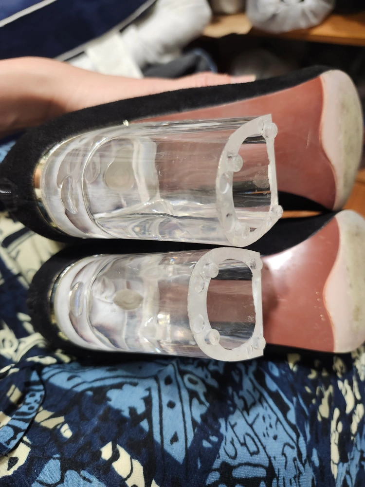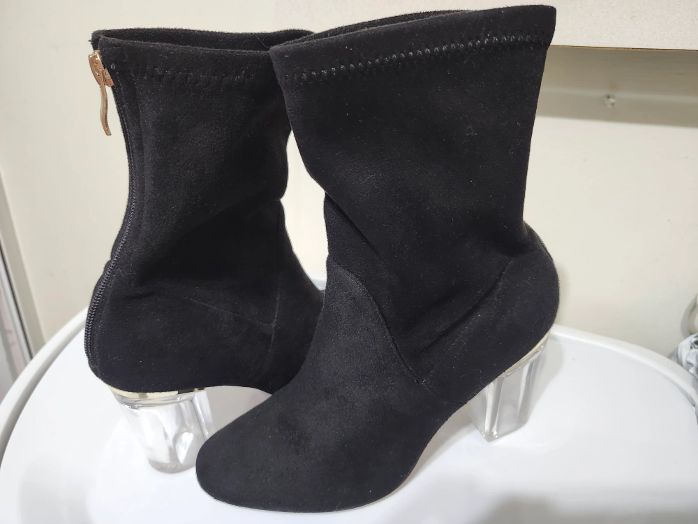 Black suede booties with a clear block heel. Gold zipper on the side. Size 6. needs rubber cover under the heels.