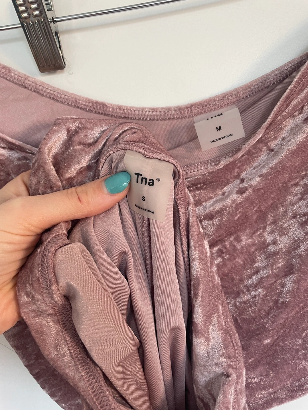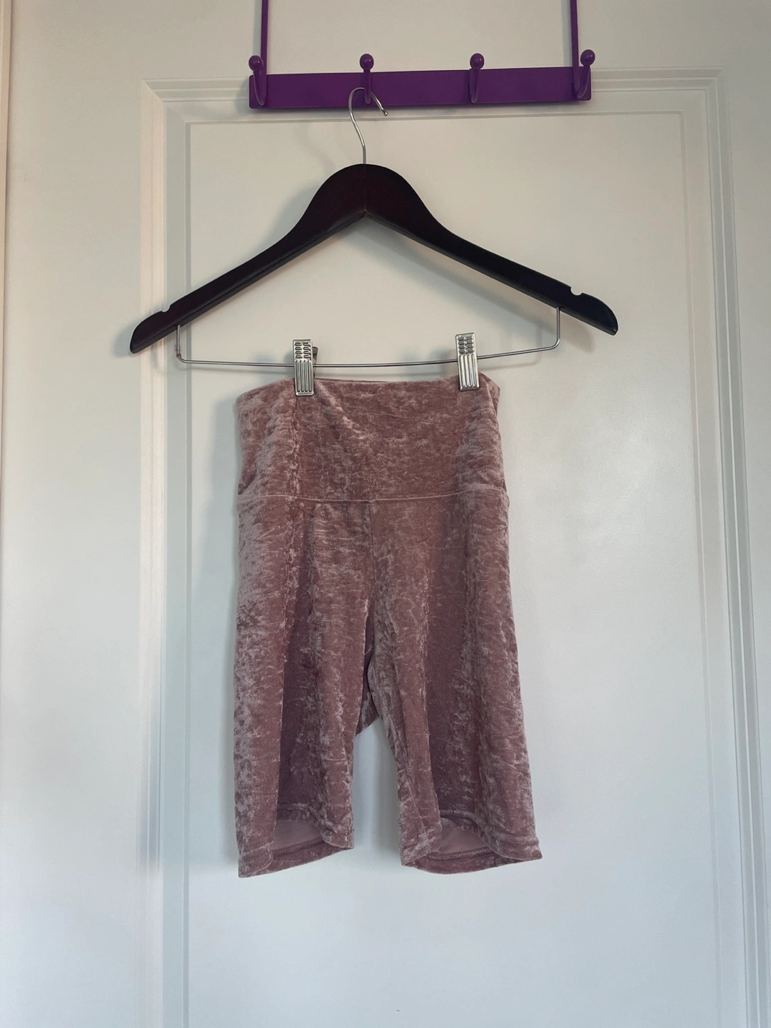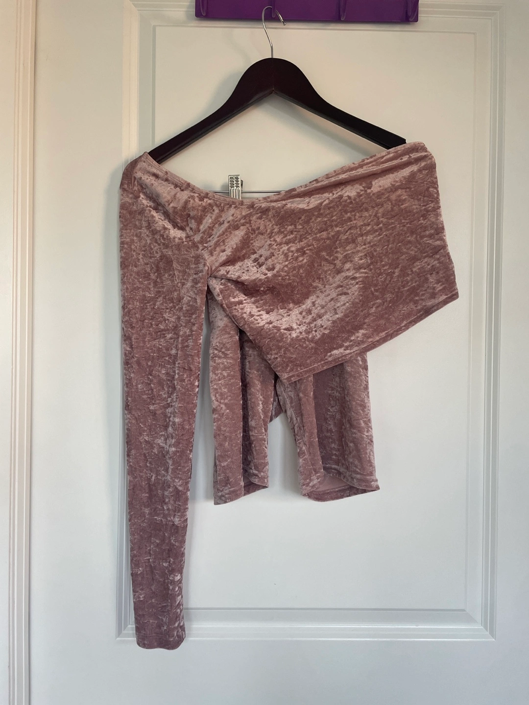 One-shoulder crop top and biker shorts set in a dusty rose colour. The top has one long sleeve and the shorts have an elastic waistband. Both are made of a soft velvet fabric - super stretchy and comfy! The shorts are size S and the top is size M. Pickup near Woodbine Station only. First come first serve.
