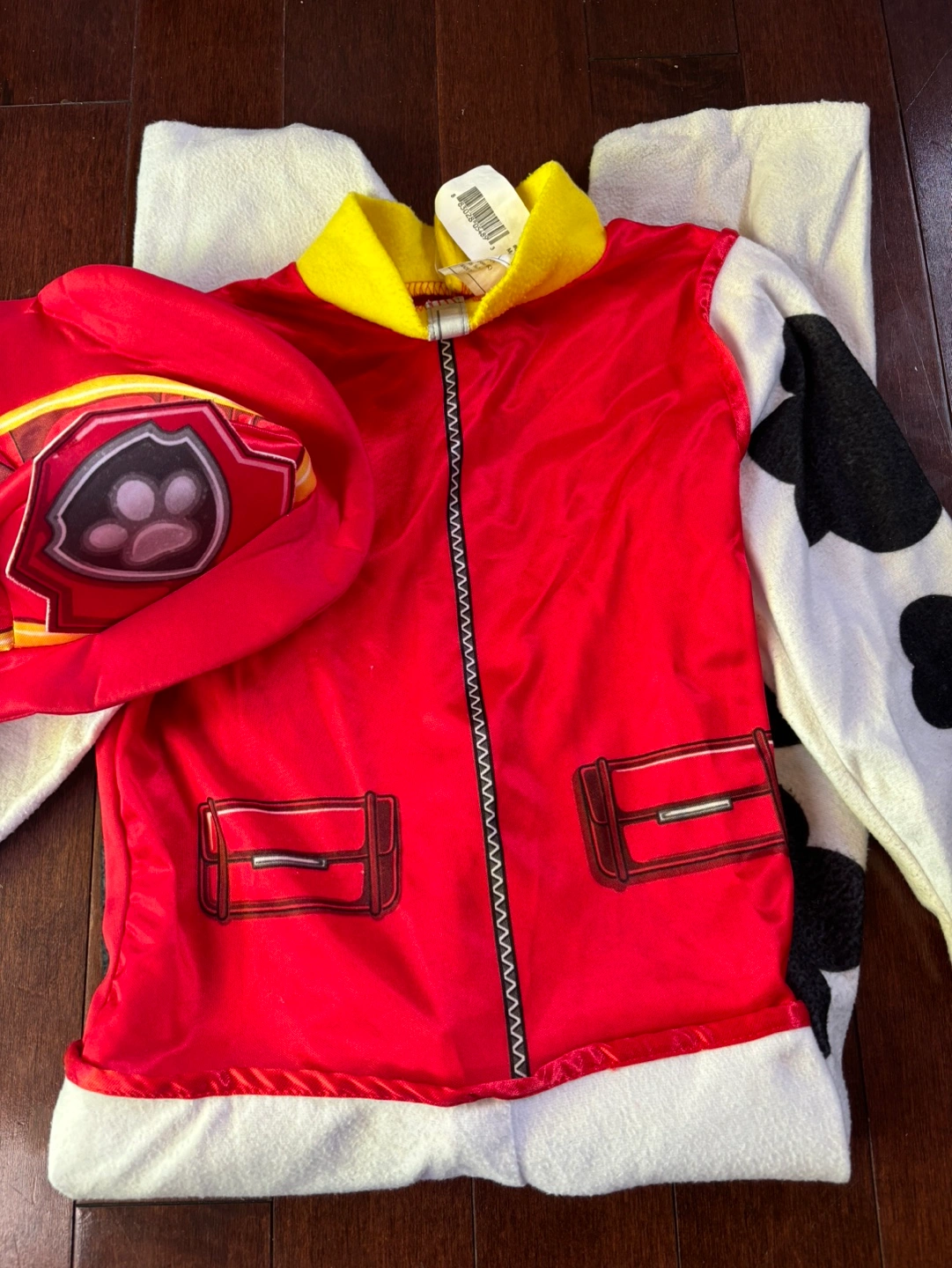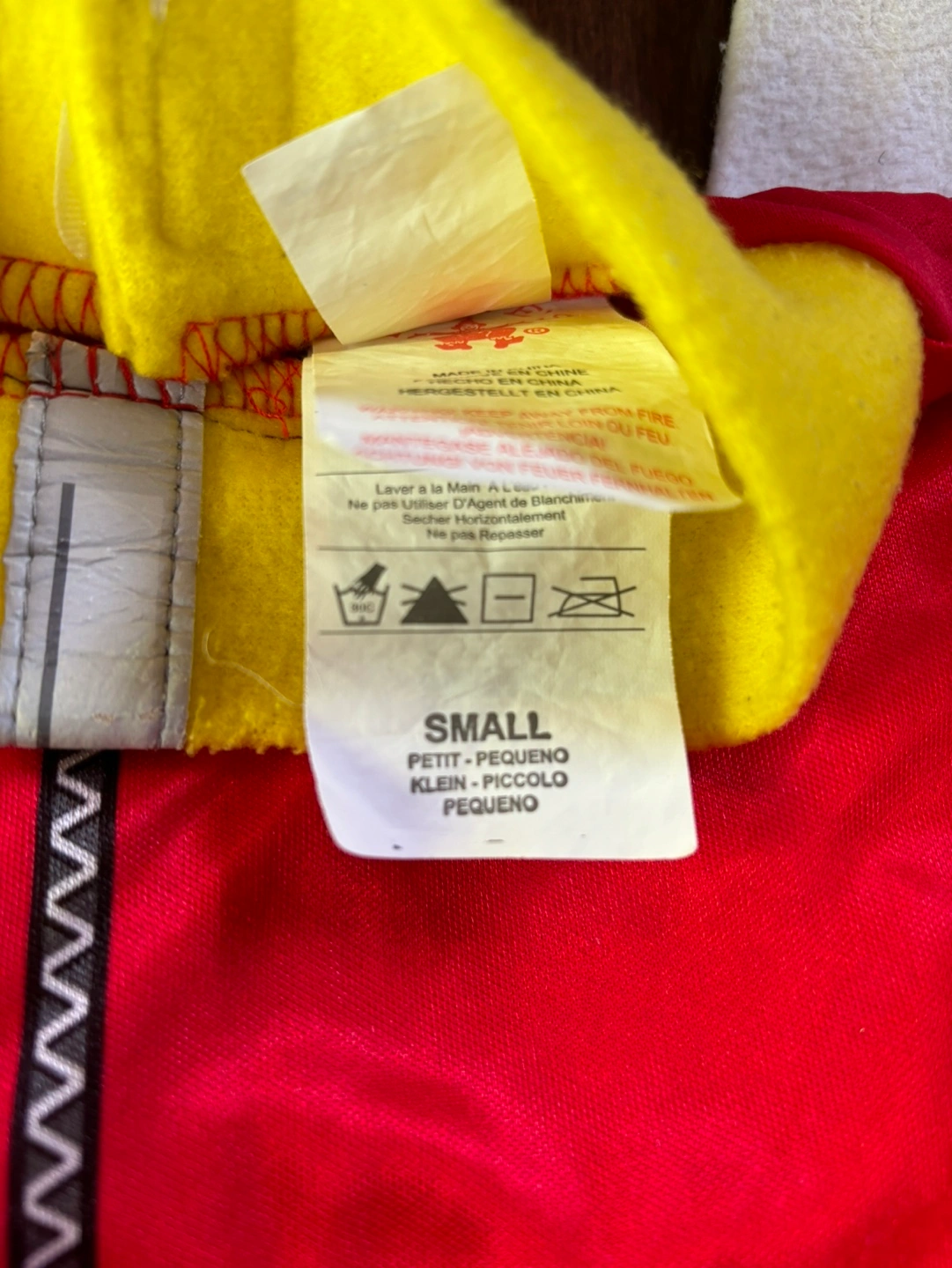 Size Small. Red and white fleece jumpsuit with a red hat.