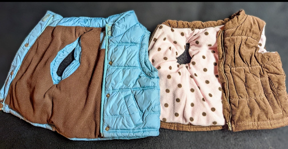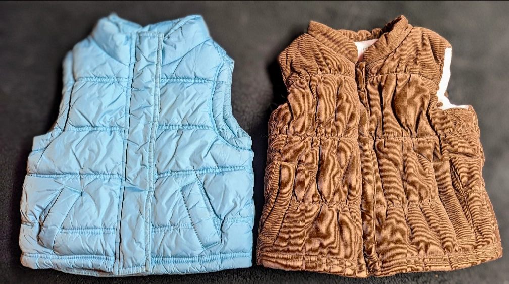 Two great puffer vests with warm lining, pockets, zipper and velcro closure. Would fit anywhere from 18m to 2T. Great for layering and transitional weather in fall or spring. Asking $5 each. Happy to offer together or separately.