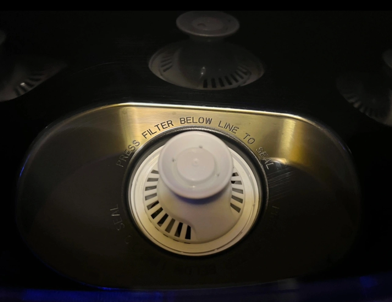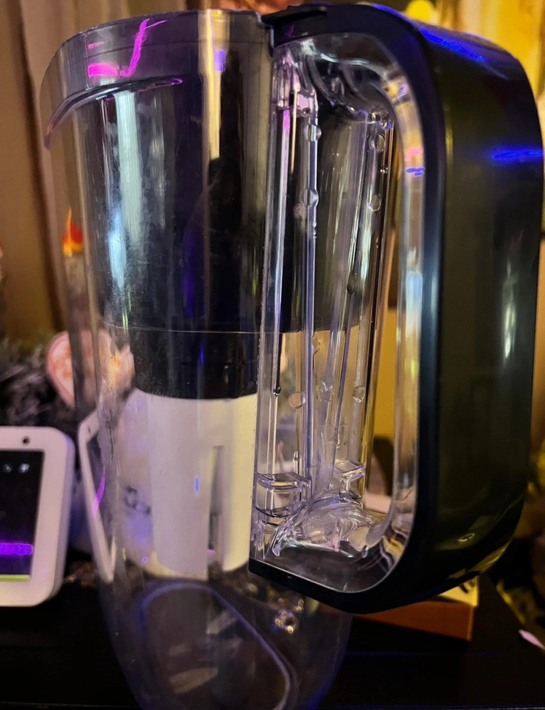 Water filter pitcher with replaceable filter. Includes a reset button for the filter. Clear plastic pitcher with black lid and handle.