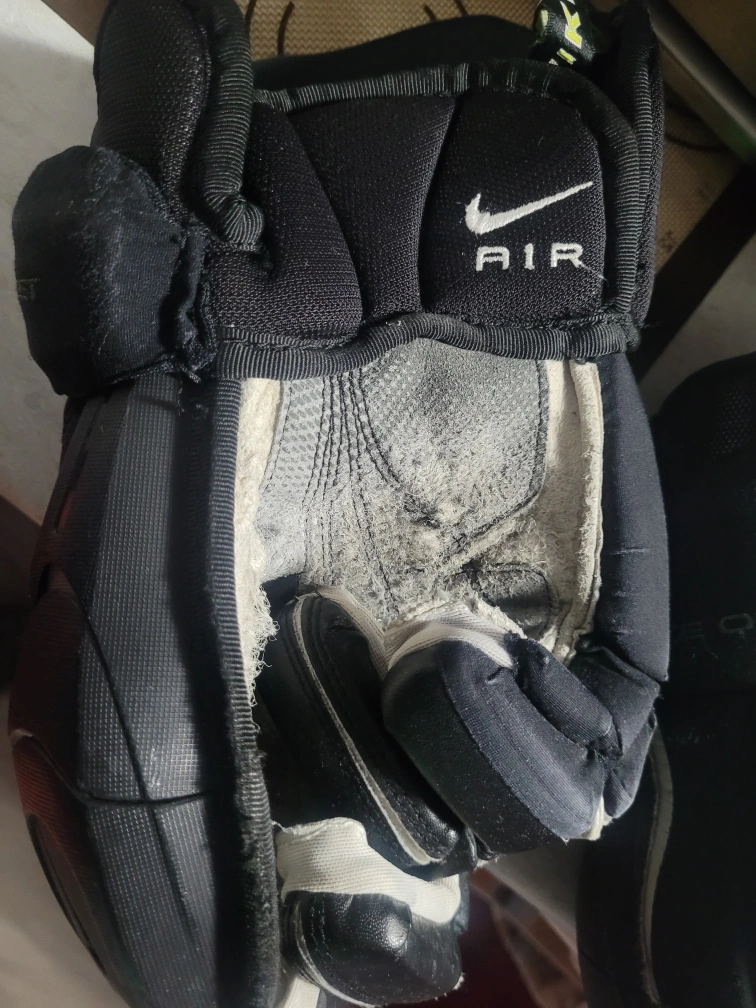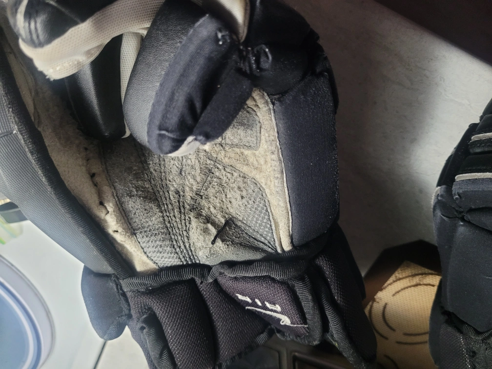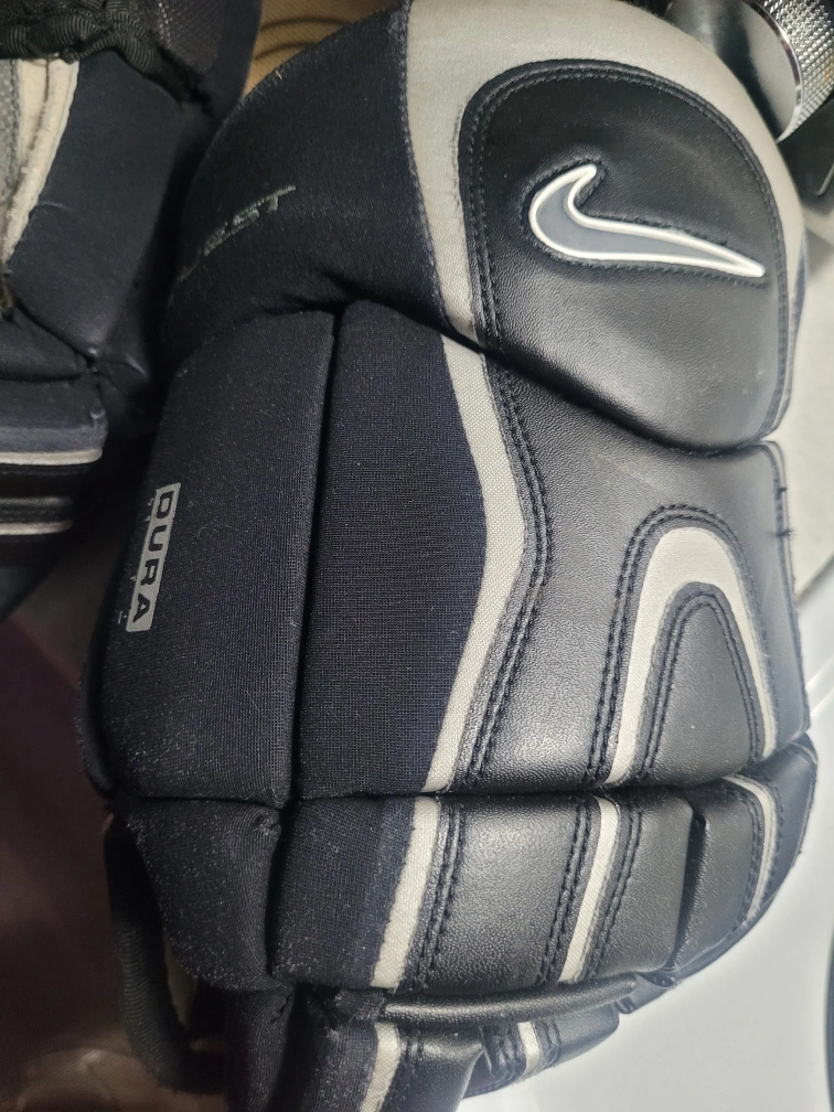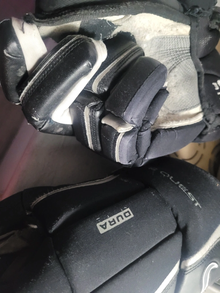 Black hockey gloves with white accents. Dura-feel palm has been worn our a bit, but still great for using as practice or fun hockey.