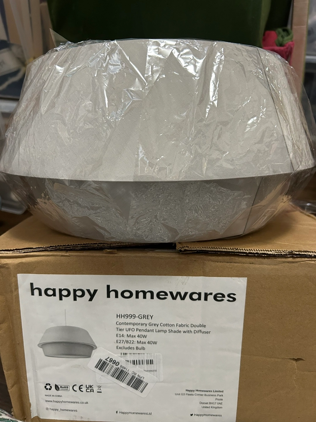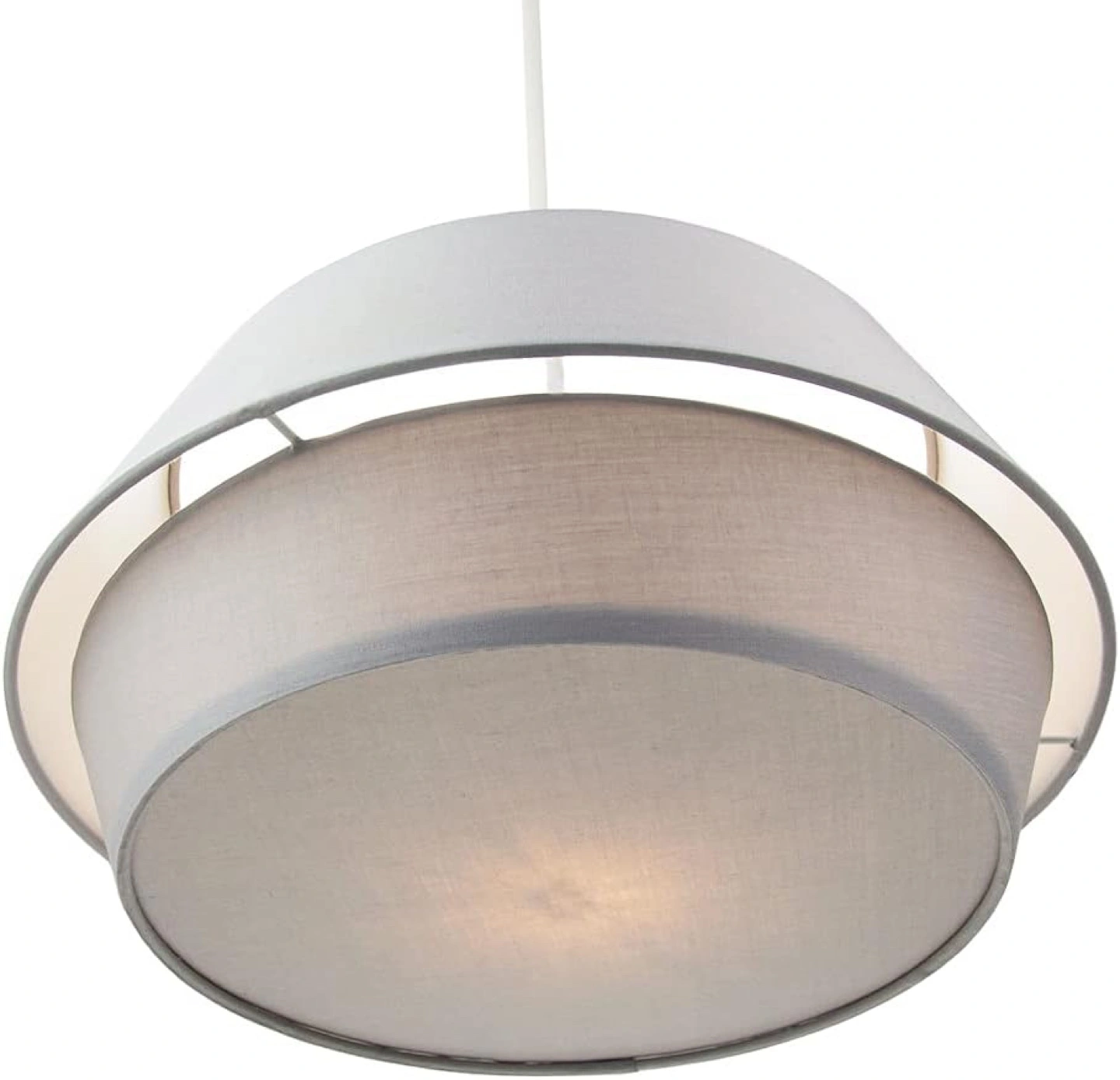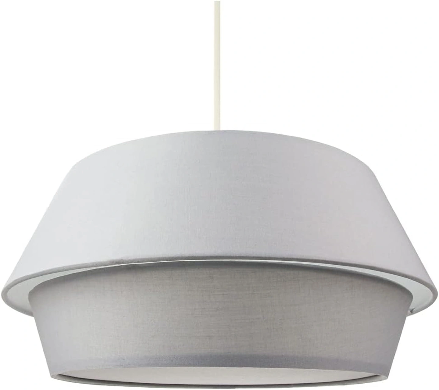 This is a contemporary grey linen lampshade, designed to be hung from the ceiling. Has an interesting shape described as 'ufo', with a two teir shape to the lampshade. Includes a light diffuser as well (can be removed). Only lampshade included, not materials to hang it. Height - 16cm, Top diameter - 35cm, Bottom diameter - 27cm