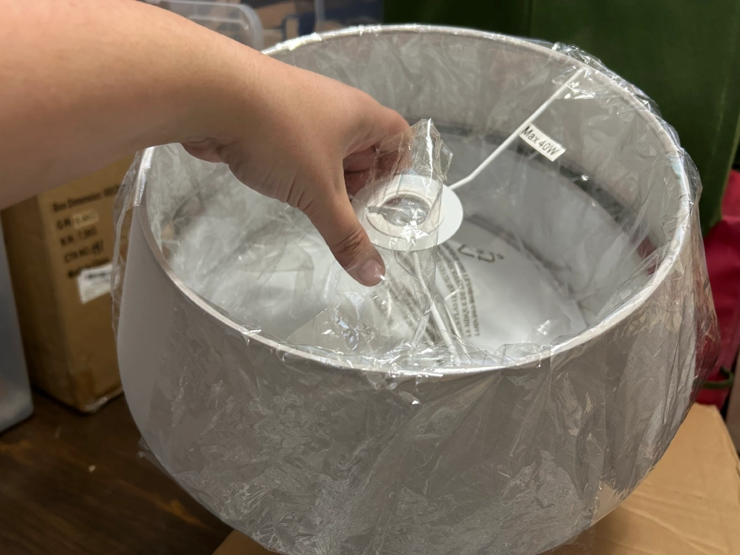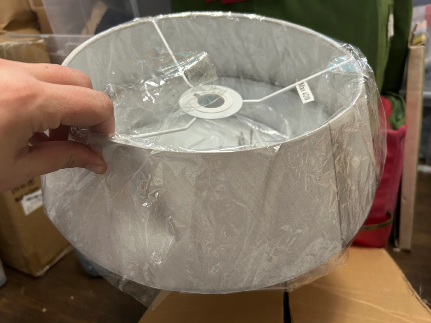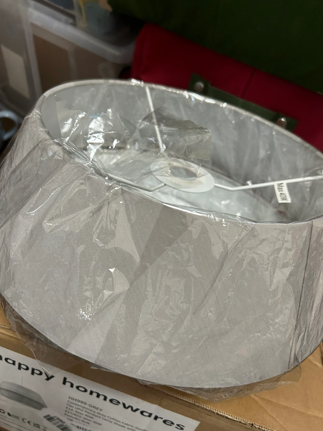 This is a contemporary grey linen lampshade, designed to be hung from the ceiling. Has an interesting shape described as 'ufo', with a two teir shape to the lampshade. Includes a light diffuser as well (can be removed). Only lampshade included, not materials to hang it. Height - 16cm, Top diameter - 35cm, Bottom diameter - 27cm