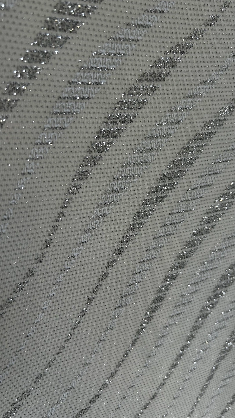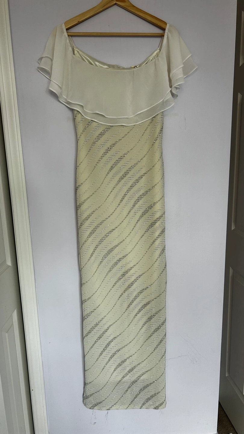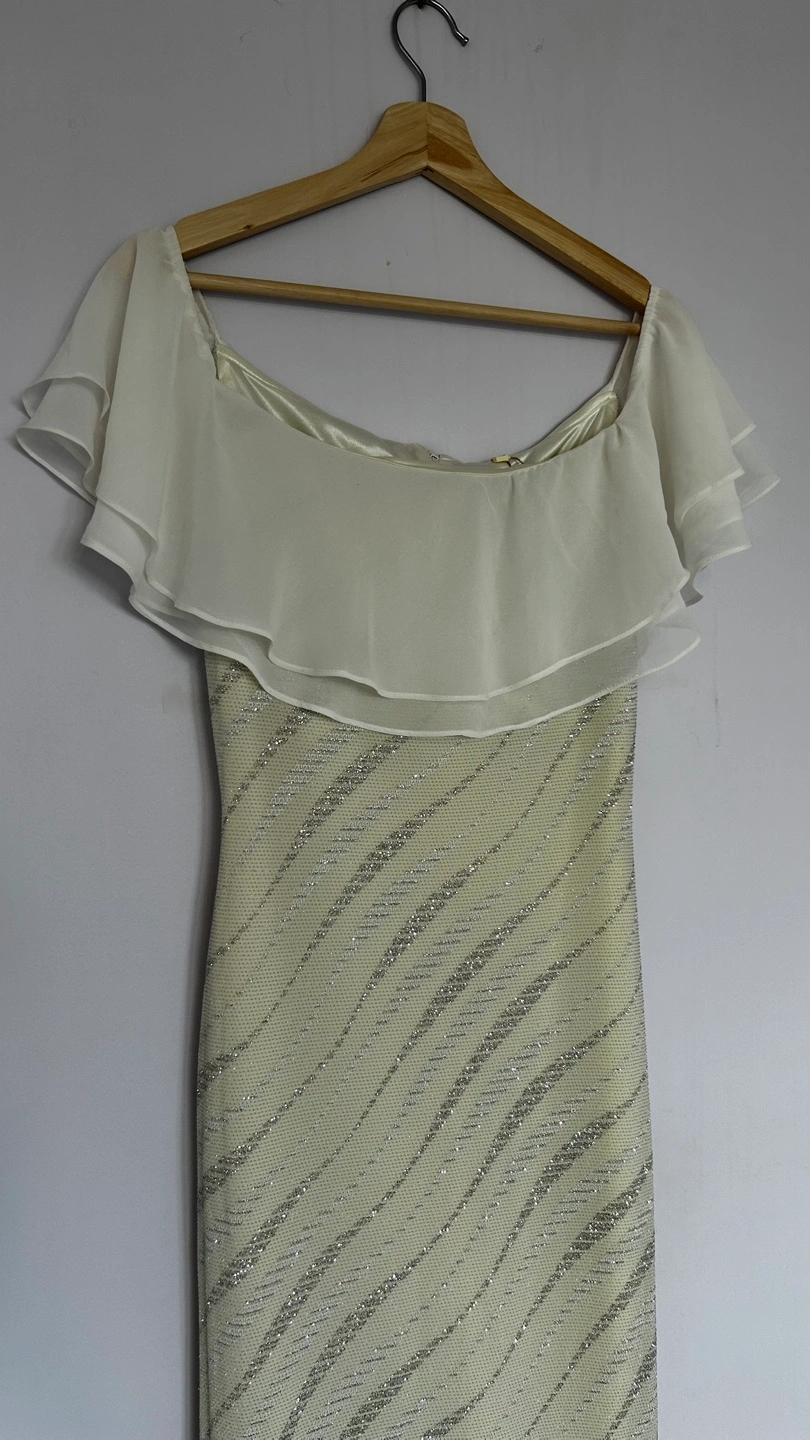 White dress with a silver shimmer and off-the-shoulder detail.