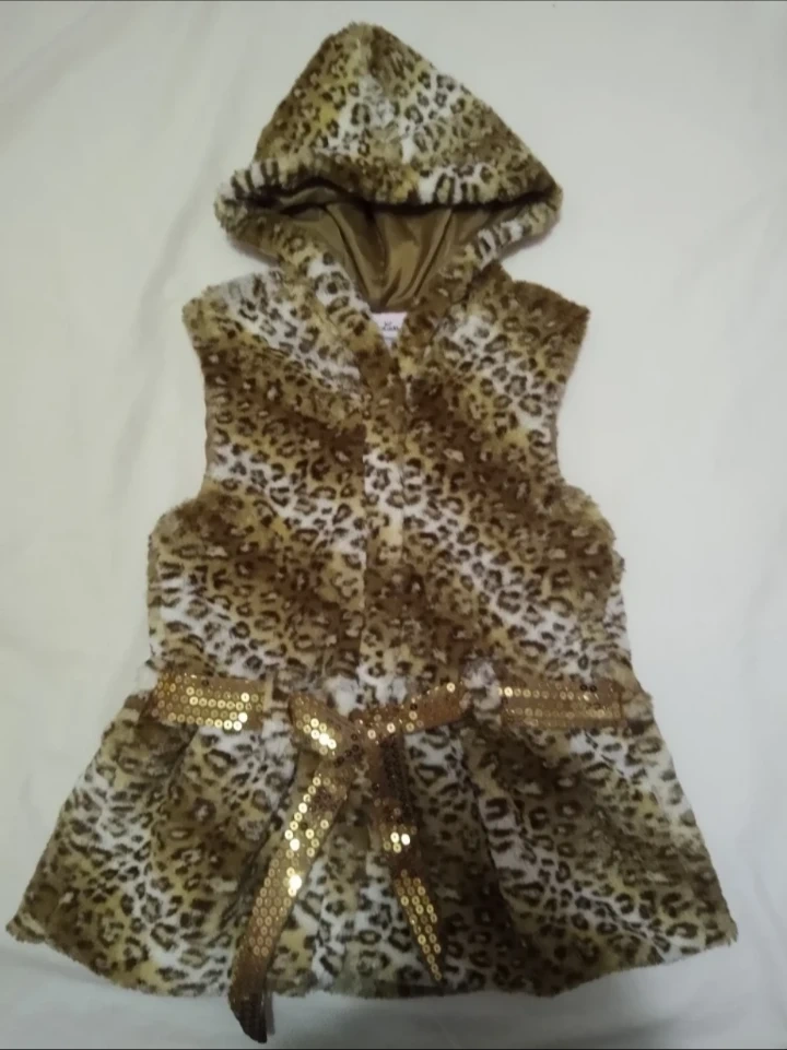 Leopard print vest with a hood and a sequined belt. Sleeveless. Girl's size 6X soft faux fur animal print lined vest with attached hood and sequined belt tie.