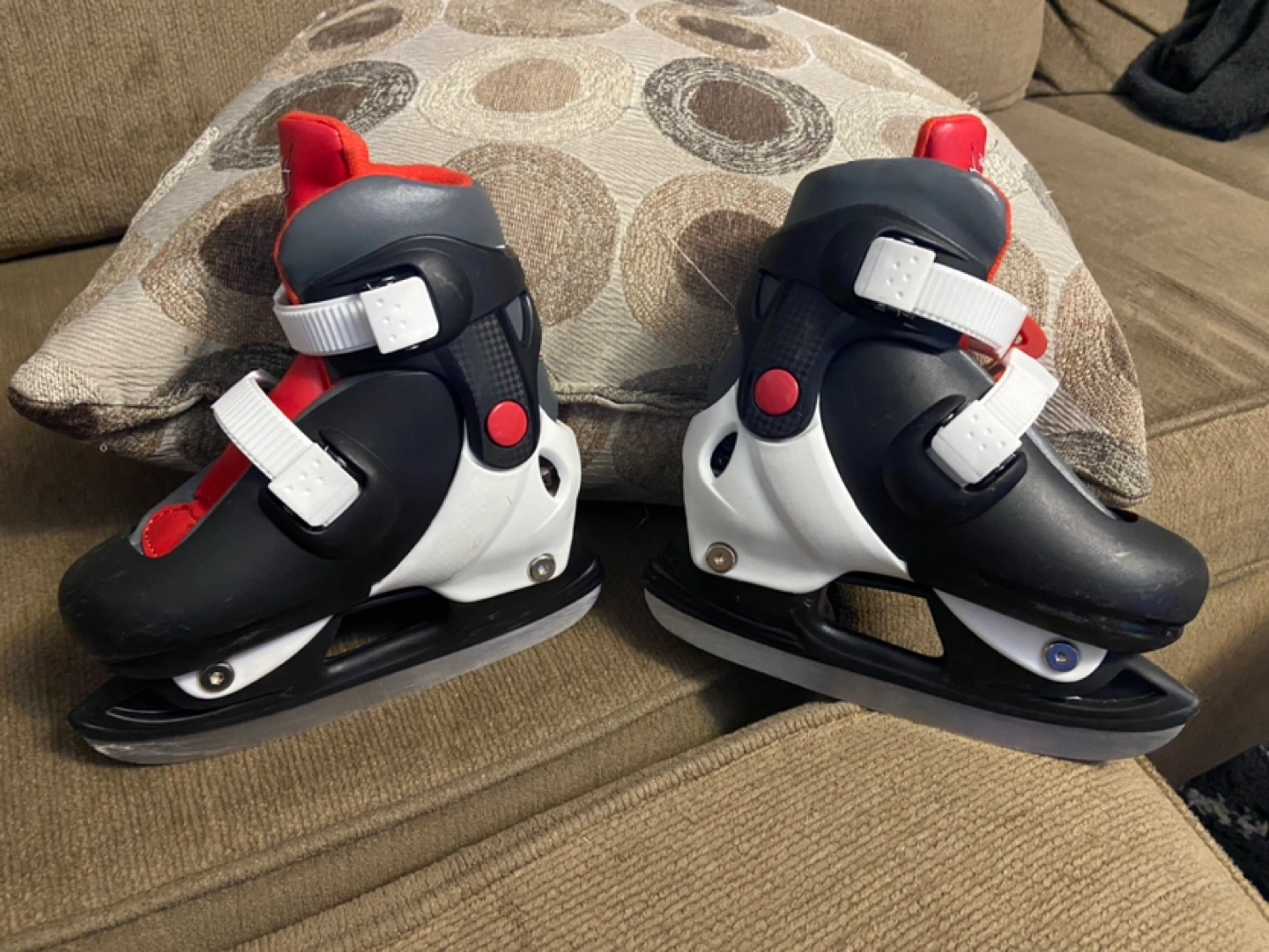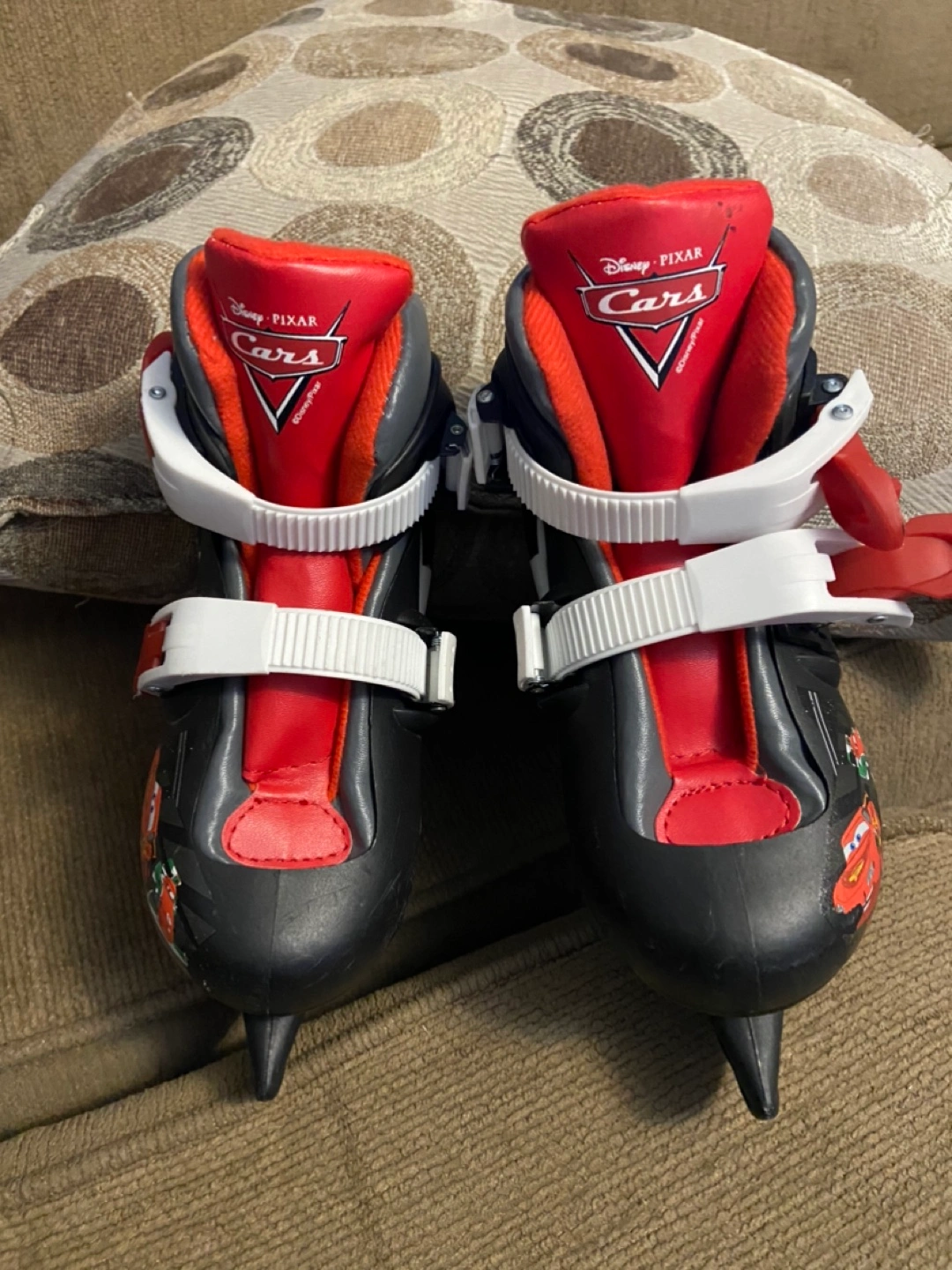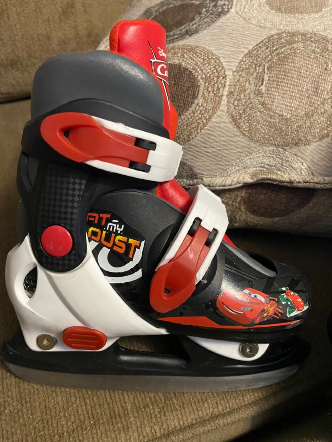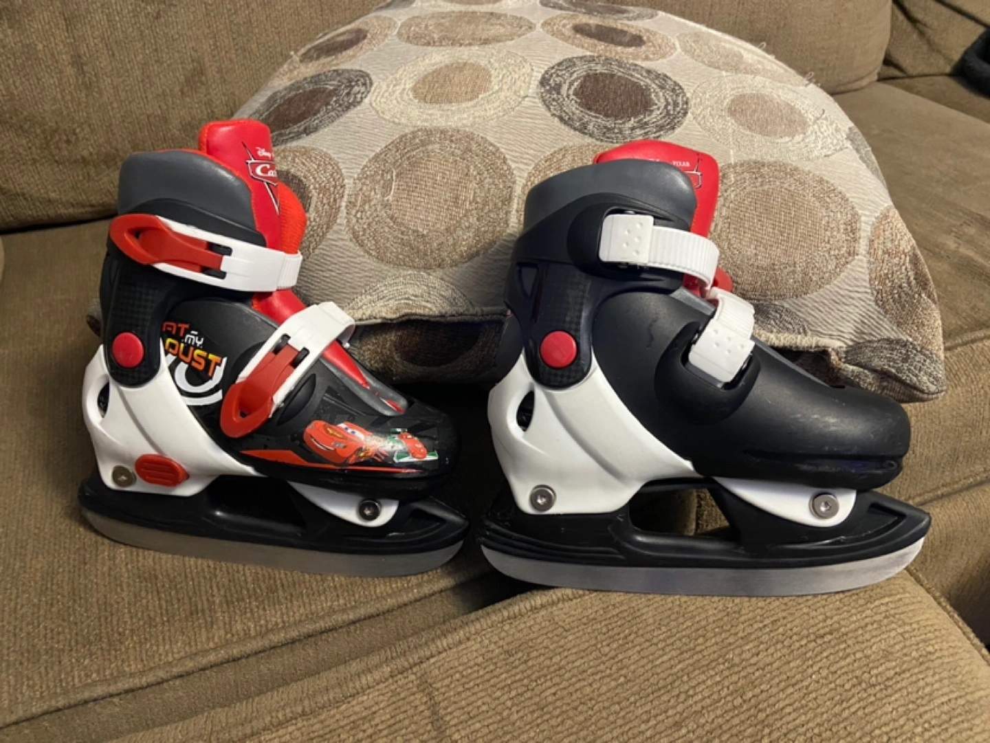Black ice skates with red and white accents. Feature a Cars design. Adjustable to 4 sizes. Reg $49 Had sharpened for my grandson last year but never used.