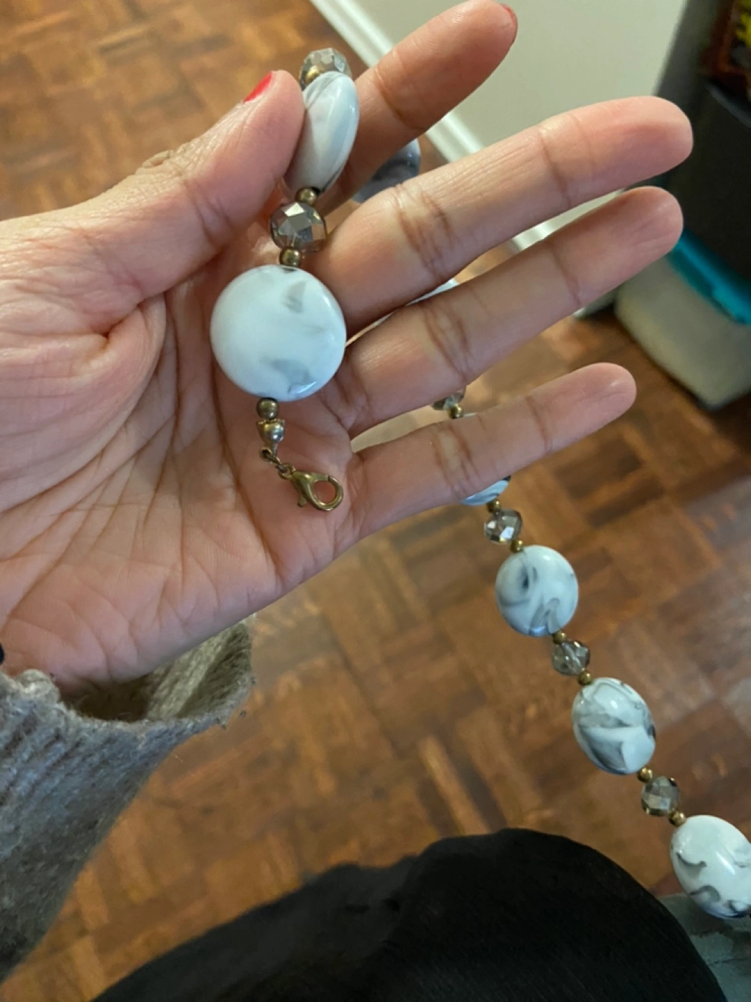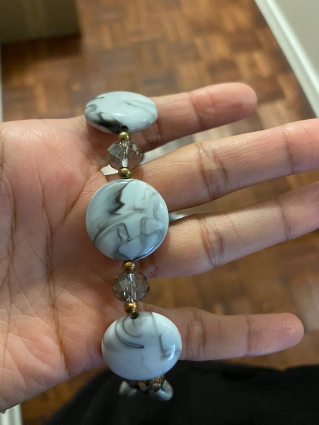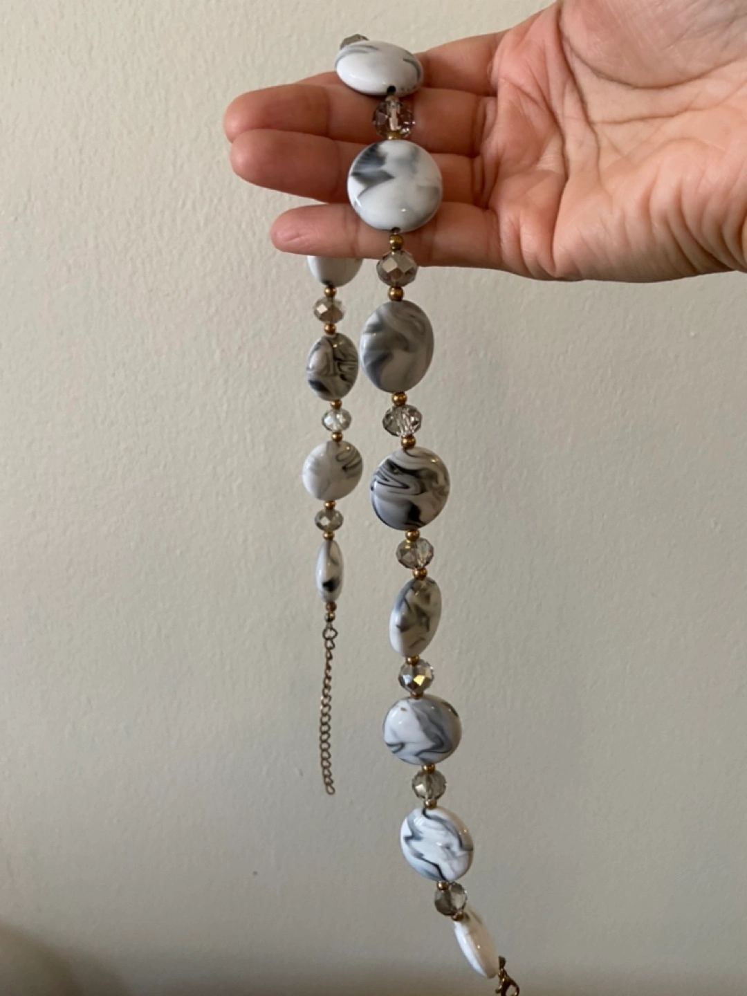 Grey and white marbled beads with gold accents and clear crystal beads.