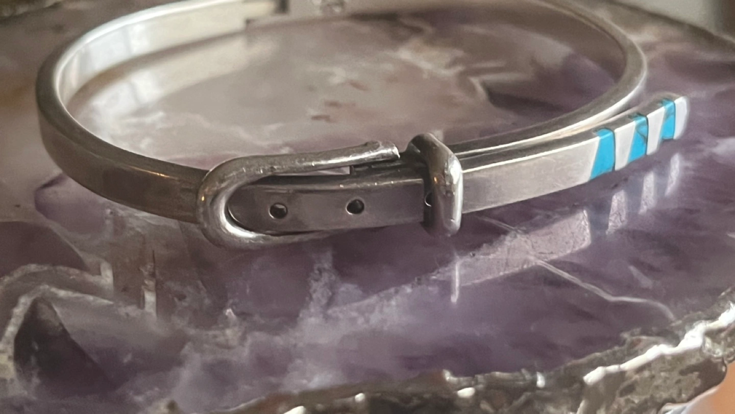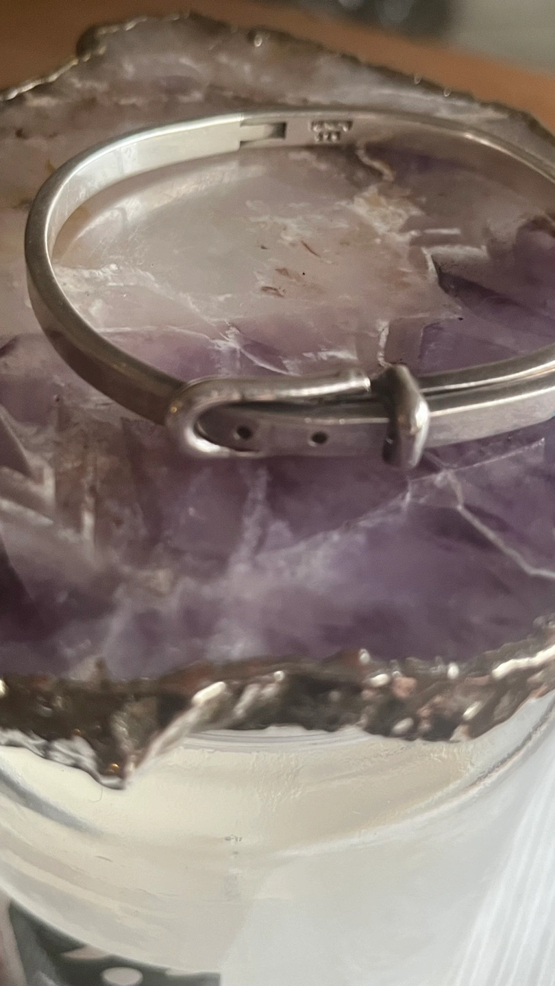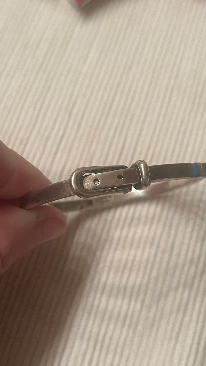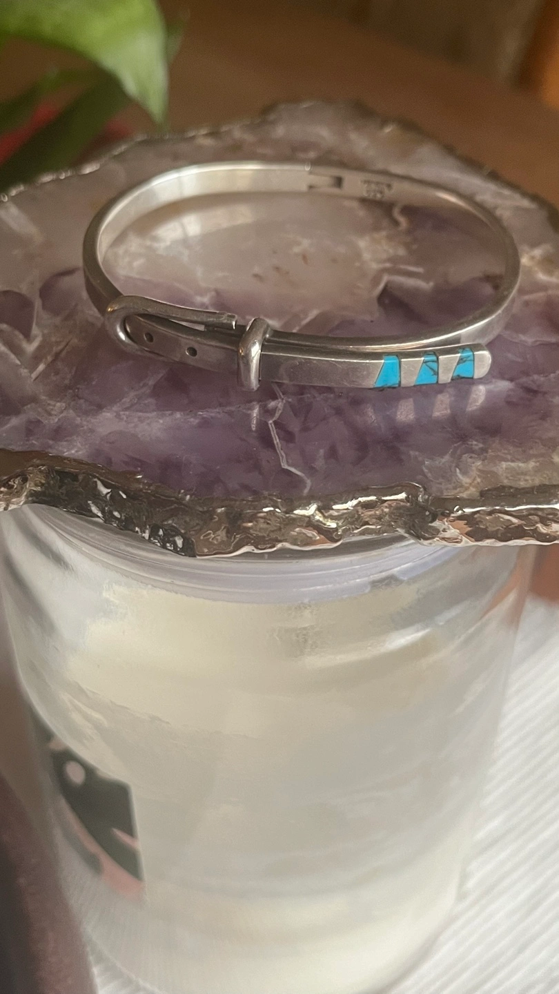 Adjustable Sterling Silver bangle bracelet with a turquoise inlay and belt buckle closure. Marked .925.