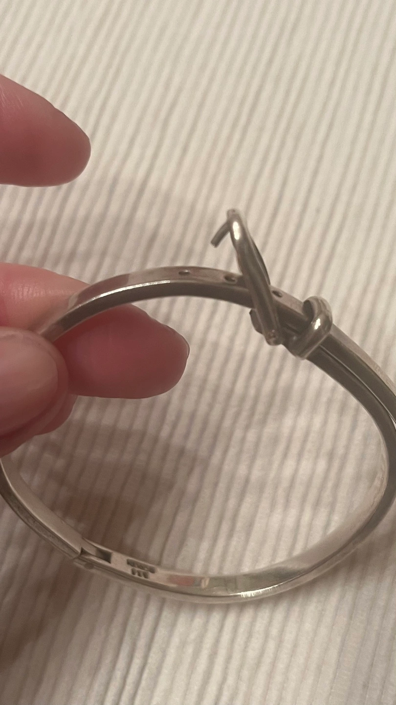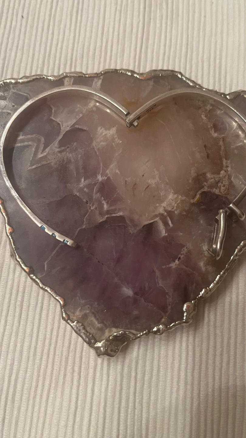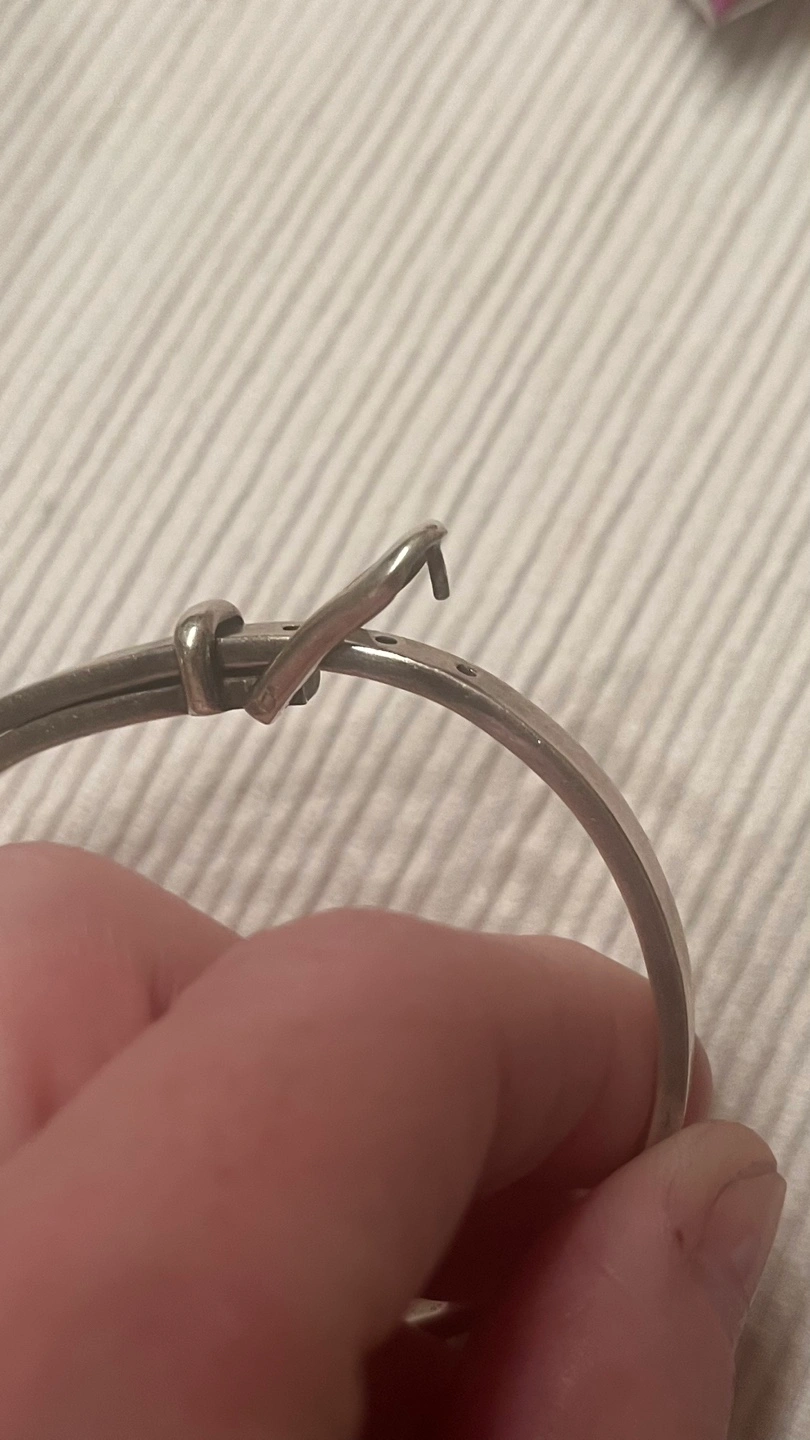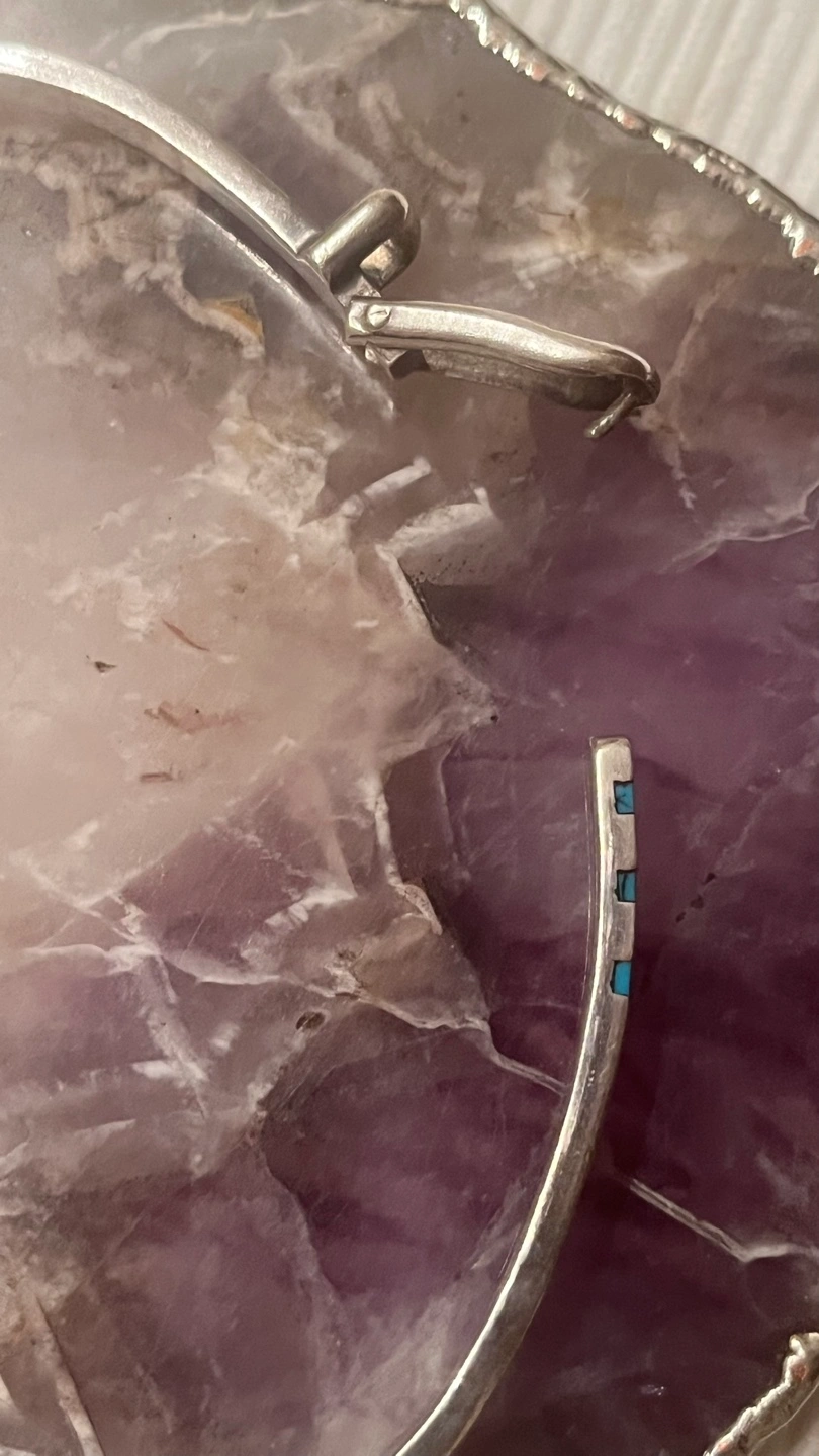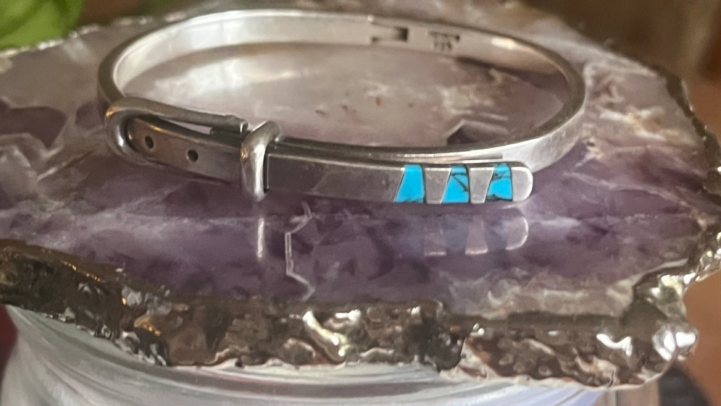 Adjustable Sterling Silver bangle bracelet with a turquoise inlay and belt buckle closure. Marked .925.