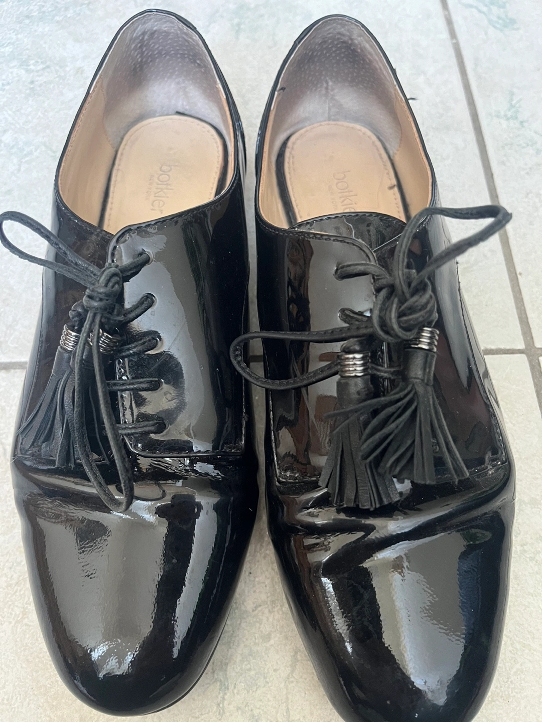 Black patent leather oxfords with a tassel detail. Lace-up closure.