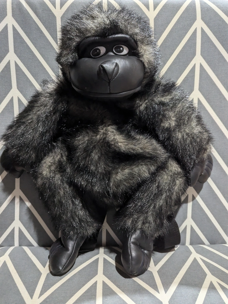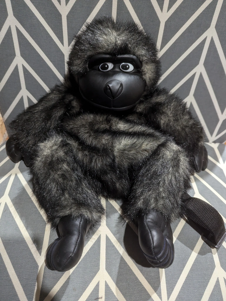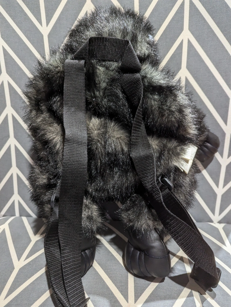 Plush backpack with gorilla design. Features black fur and a zippered pocket. Adjustable straps.