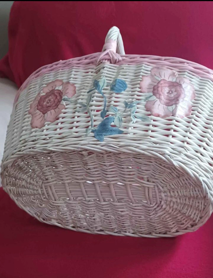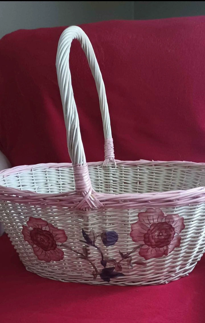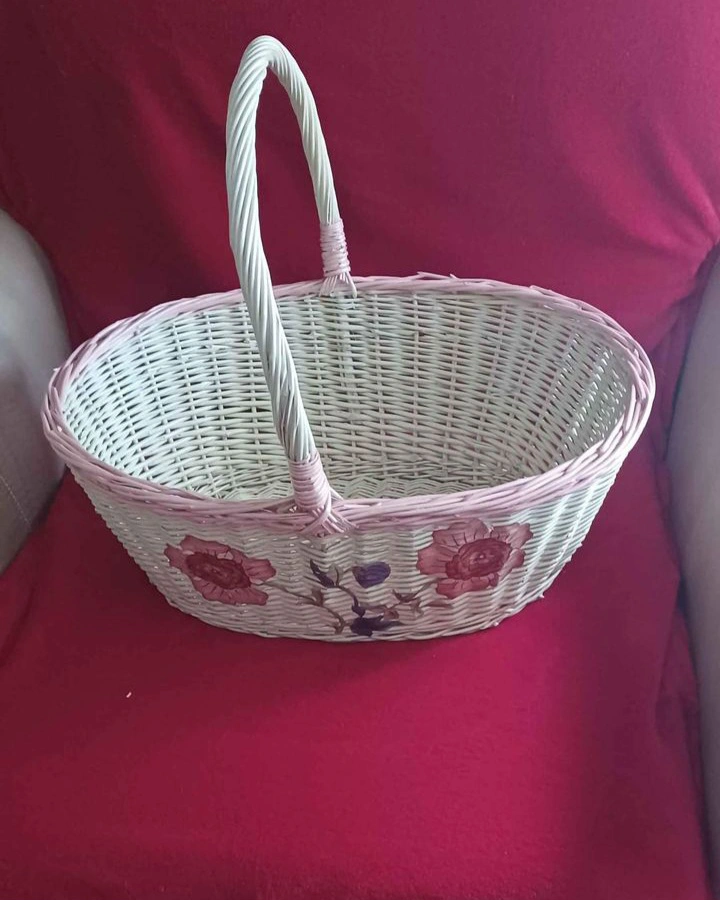 Oval wicker basket with a pink trim and floral design. I used to put my yarn on Dimension 19x13.5x8 Great for gifts basket Nothing wrong Location Eastmall and Rathburn