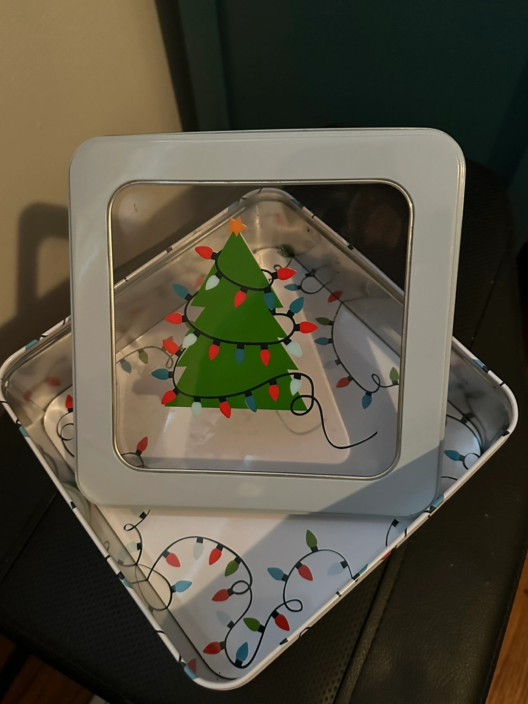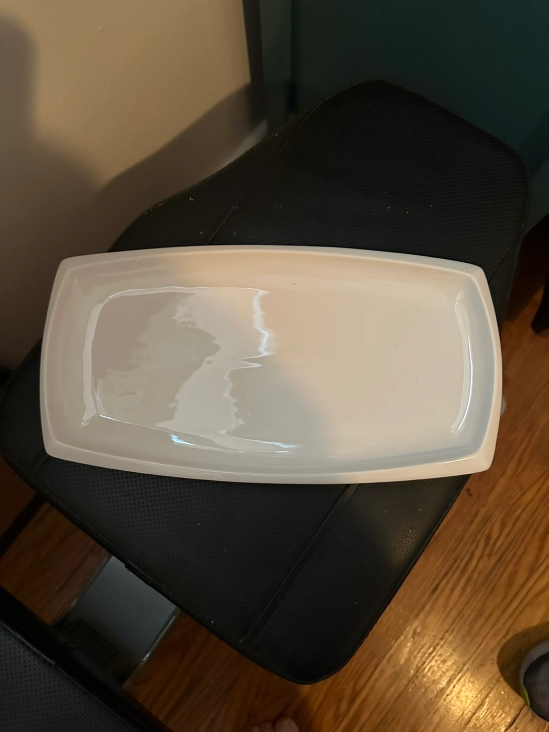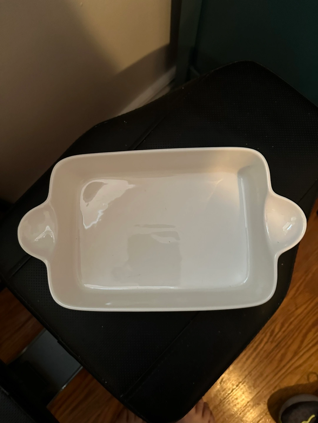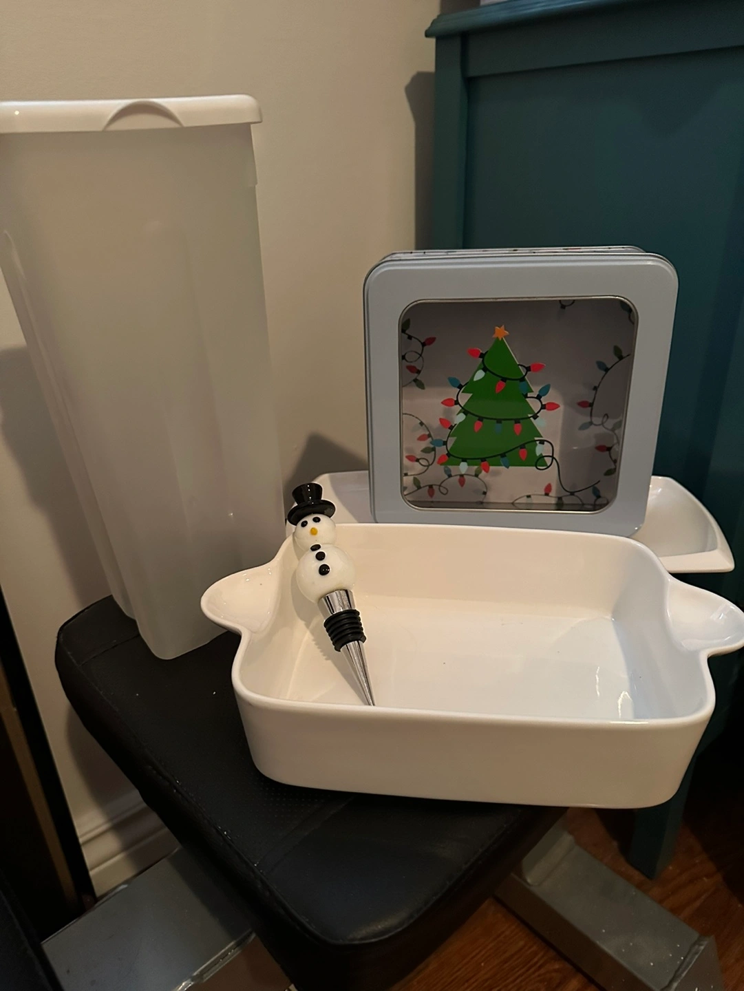 White serving platter and baking dish, both with handles. One is made by Joshua Maxwell Studio and the other is made by M. Mann. Also included holiday theme snowman wine bottle stopper and a tall Tupperware container perfect for pasta, cereal or oats etc and a Christmas tin that can be used for holiday cookies/candies. All are in excellent condition no chips or cracks in any of the items, smoke free home.