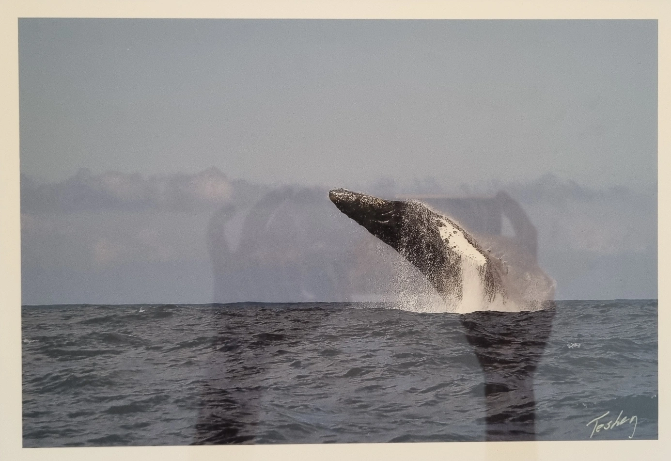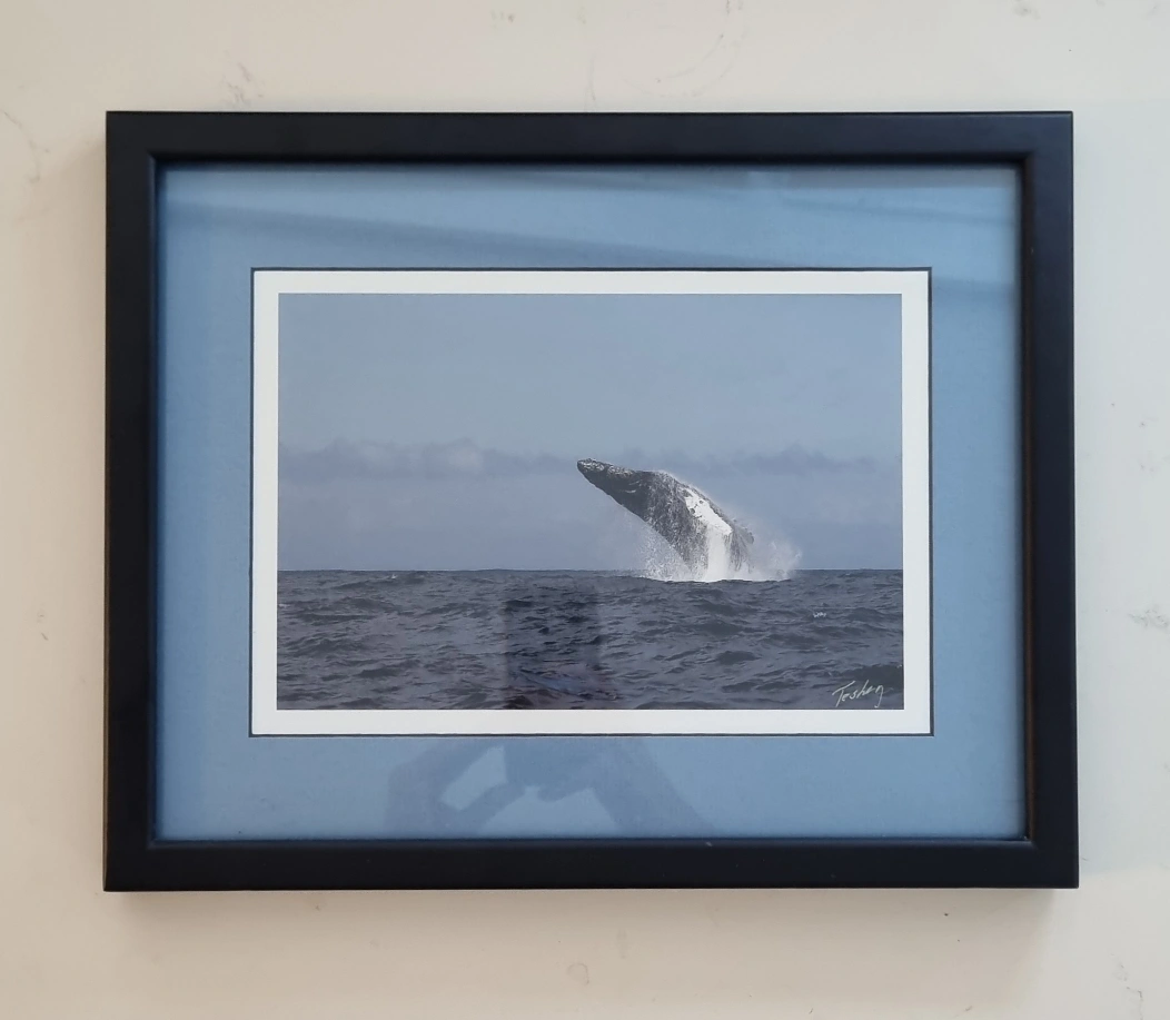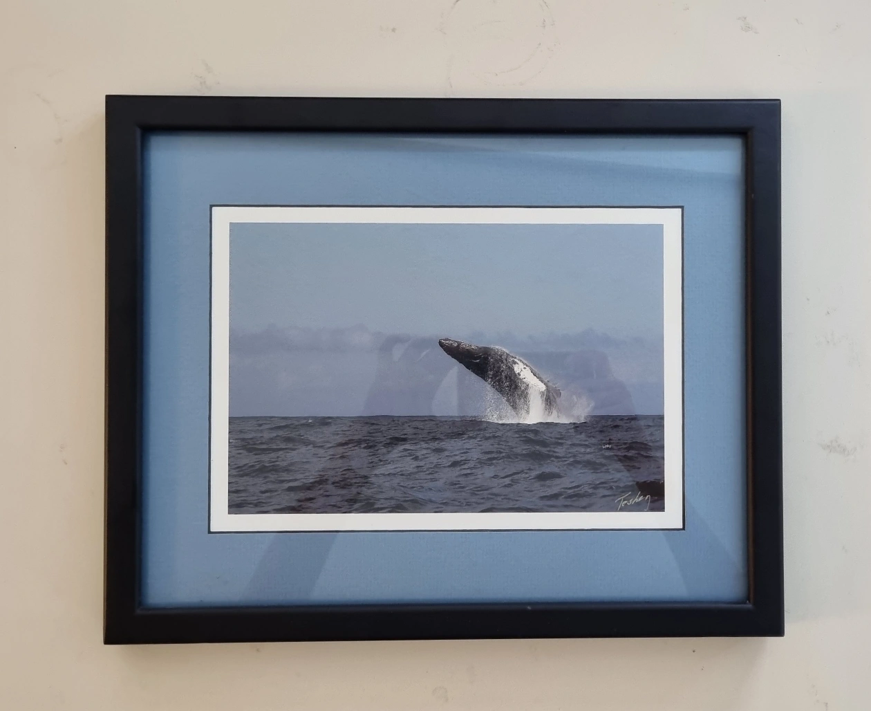 Framed photograph of a whale breaching. Black frame with a blue mat.
