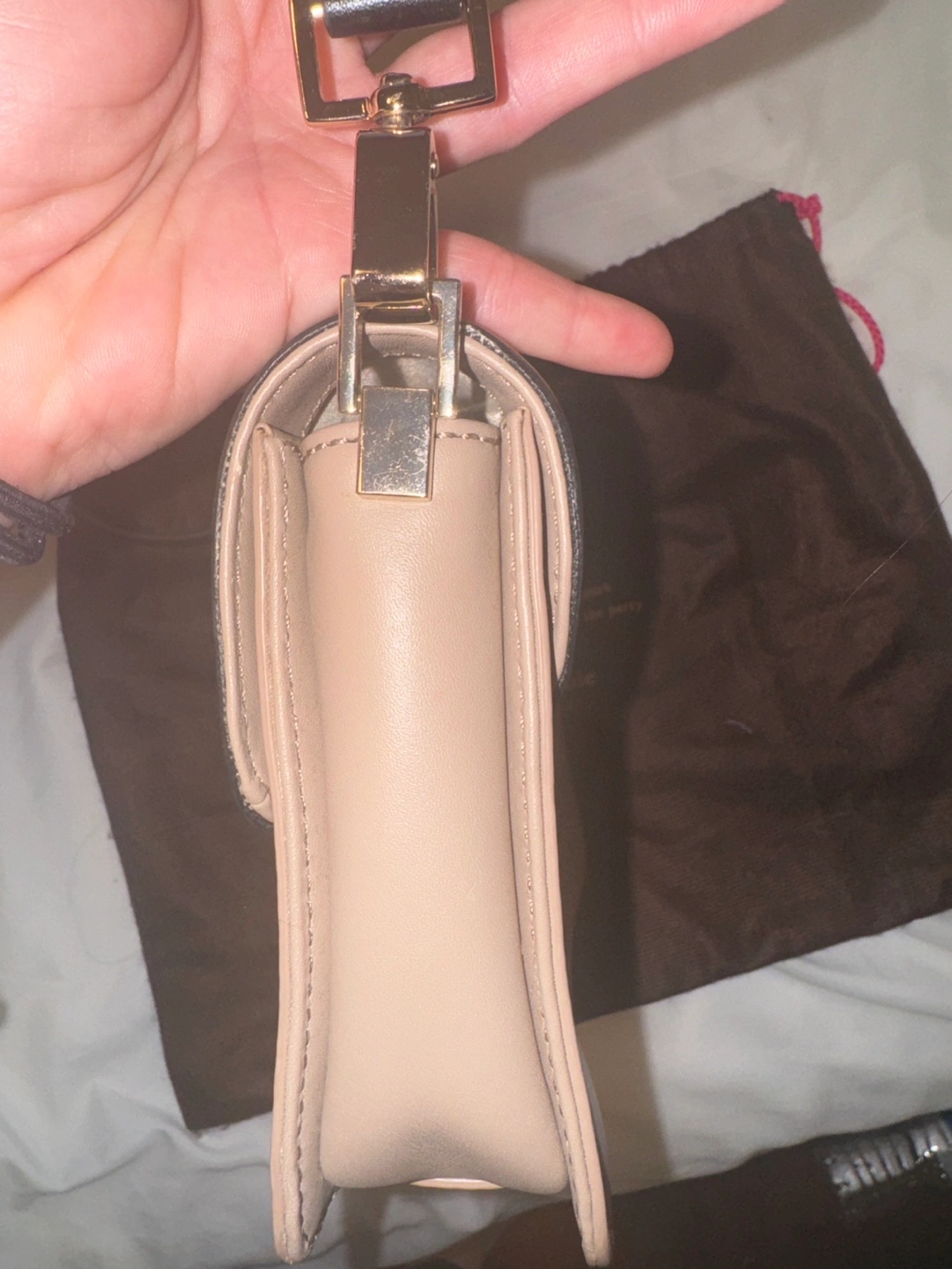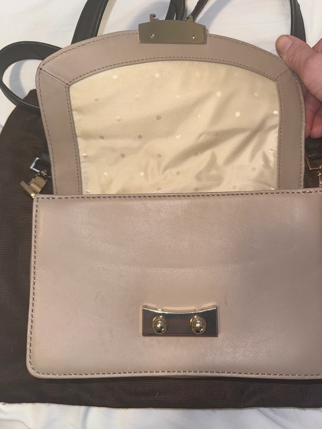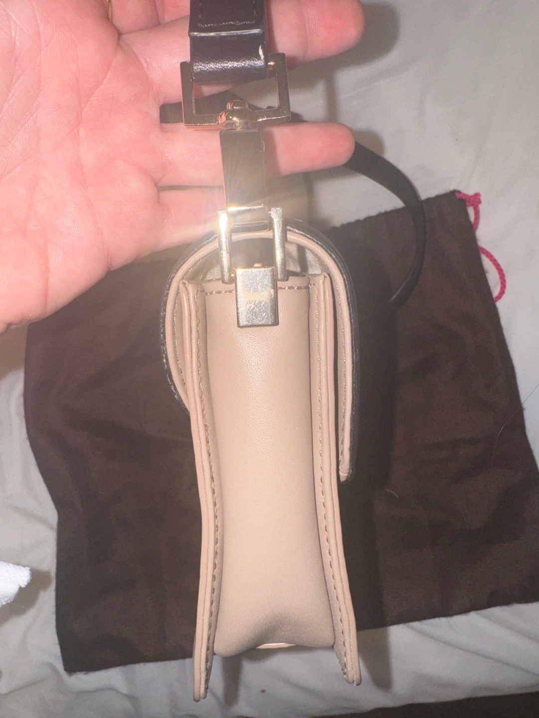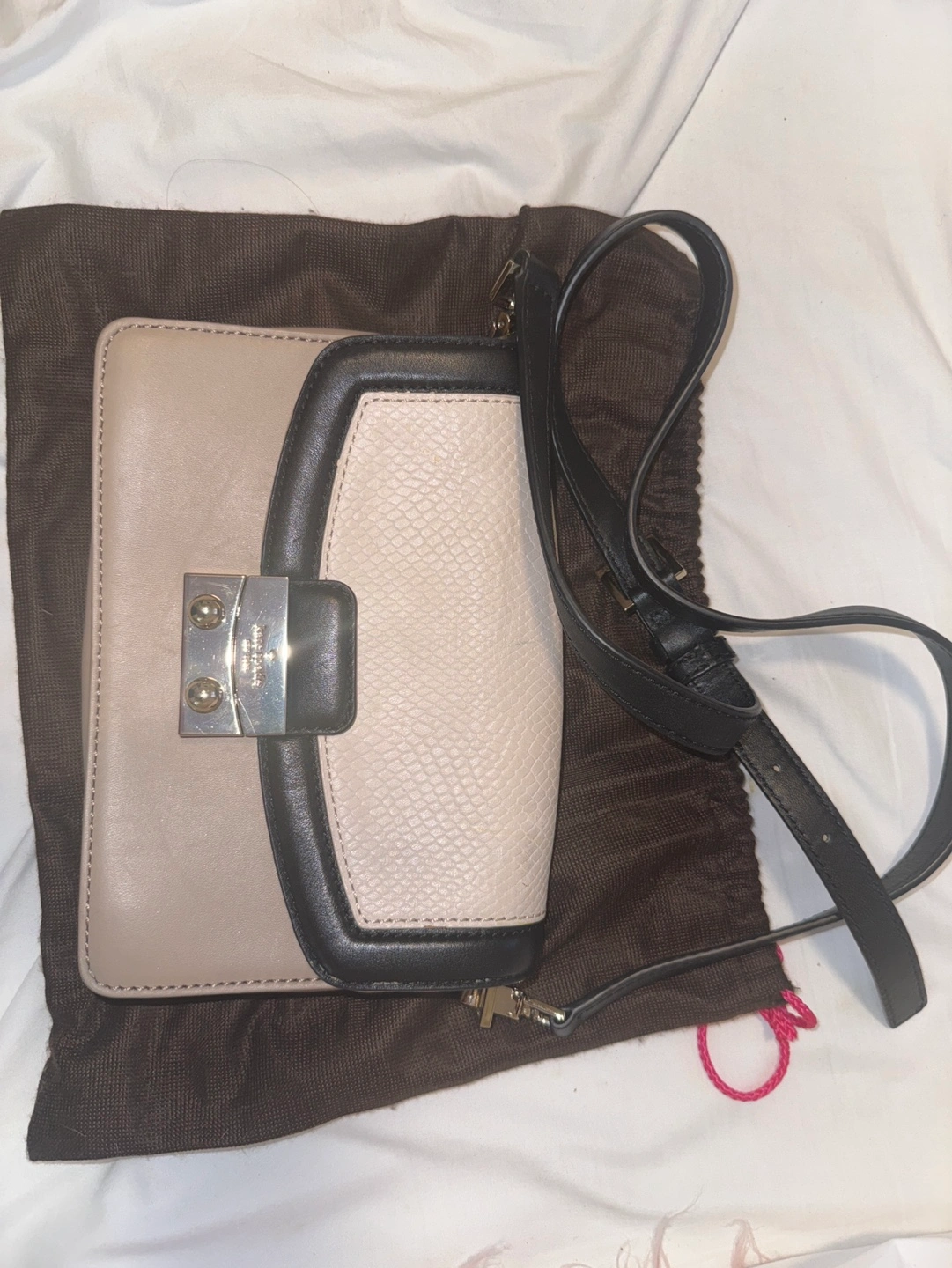 Small crossbody bag with a black and beige colour scheme. Features a gold-tone closure and hardware. Comes with a dust bag.