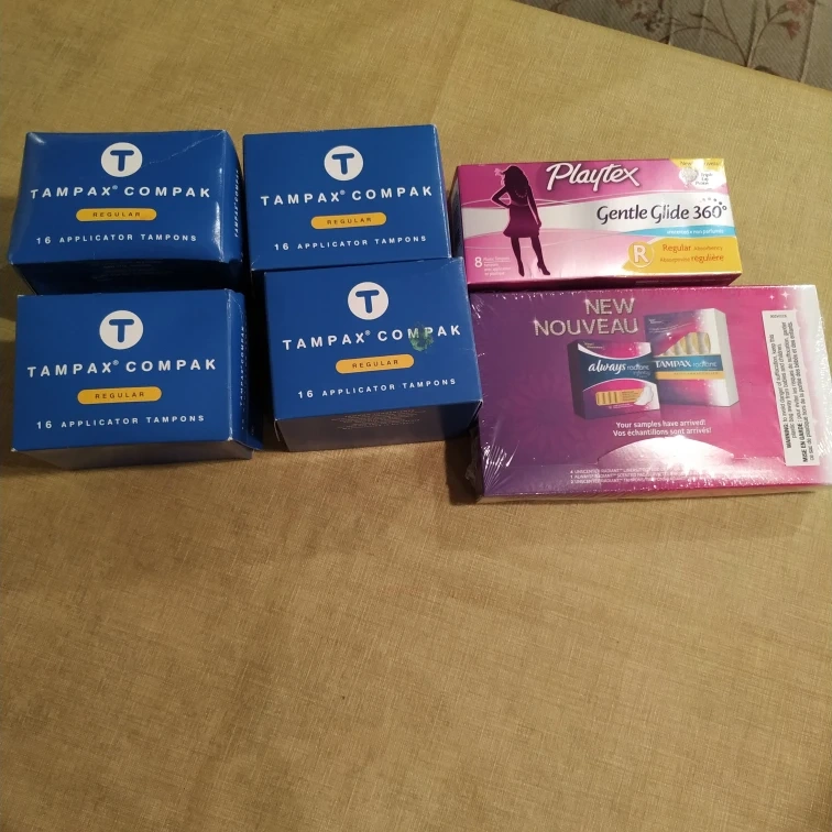 4 boxes of Tampax Compac Regular Applicator Tampons. Each box contains 16 tampons. plus play text and always tampons samples take everything for $10