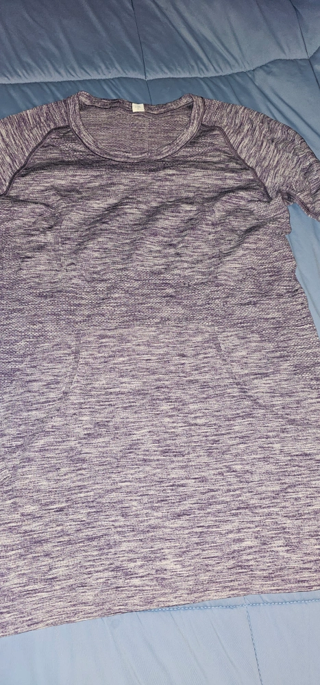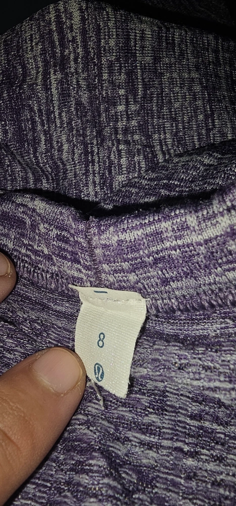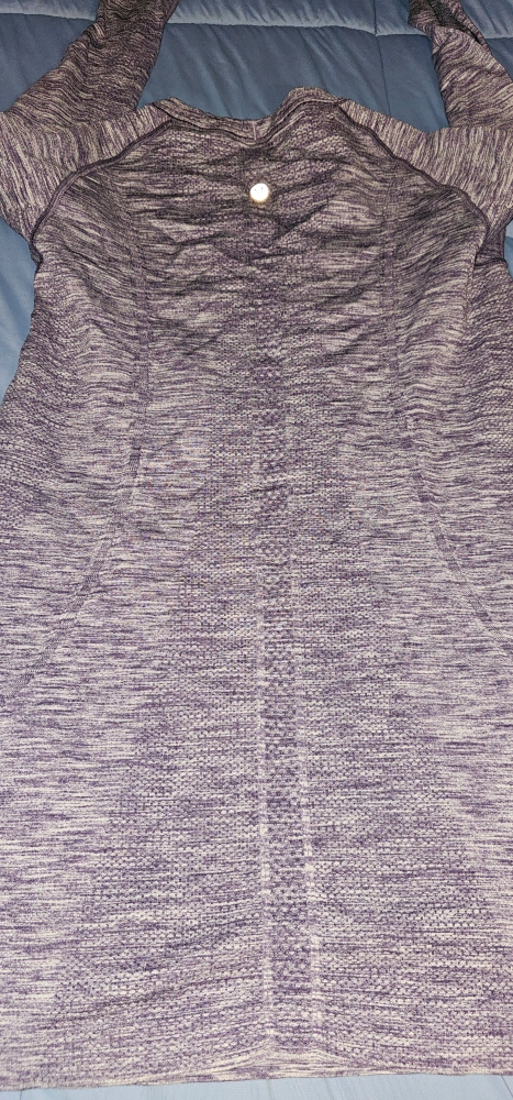 Long-sleeved shirt, purple and white, size 8. Has thumb holes. In very good condition; nothing wrong with it, just too small for me.