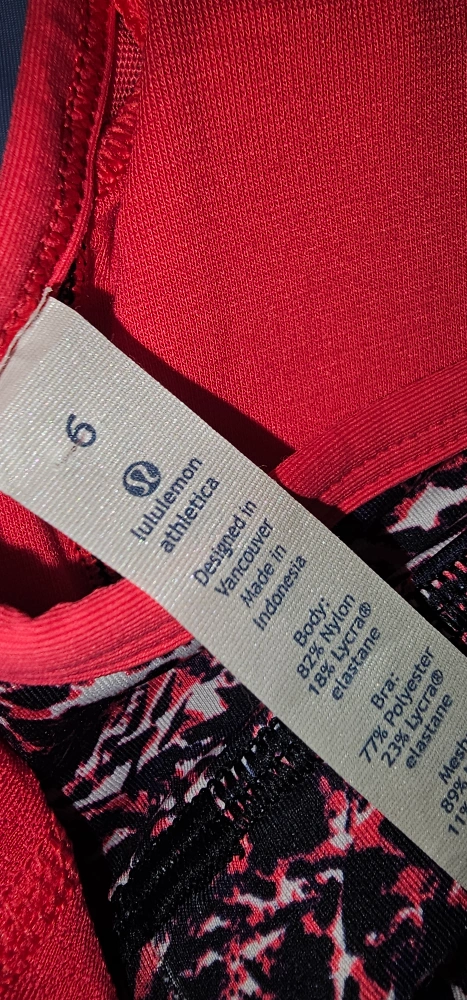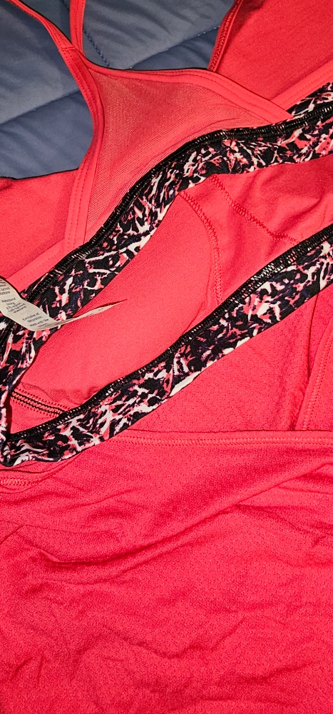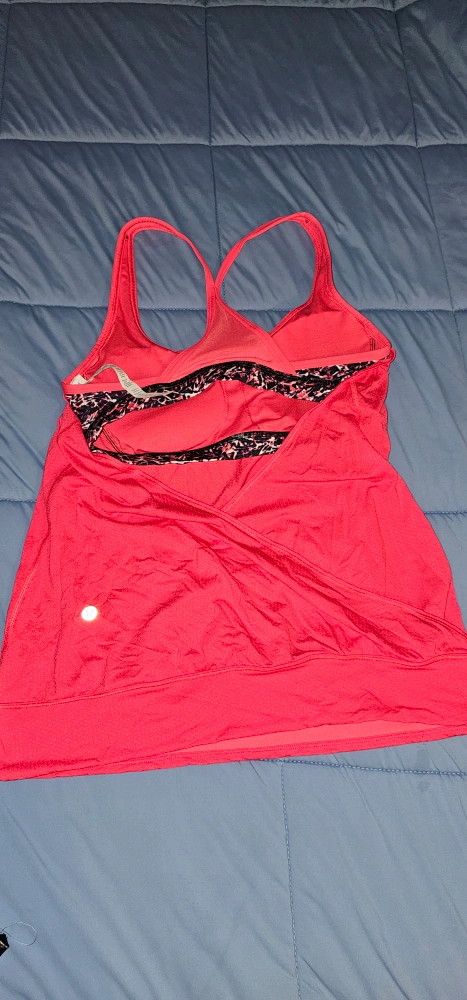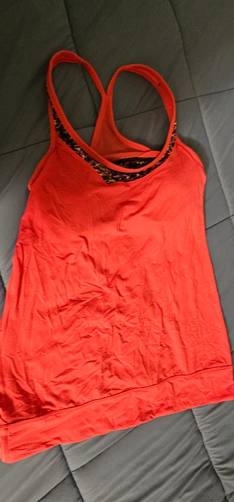 Red tank top with built-in bra. Size 6. Has some cool print detail at the top.