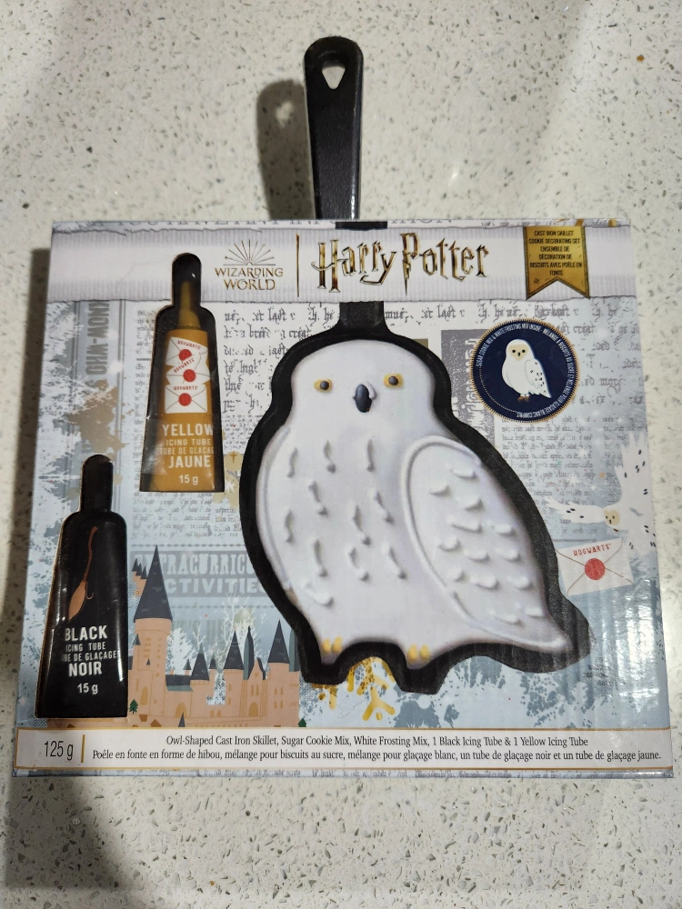 Owl shaped cast iron skillet, sugar cookie mix, white frosting mix, black icing tube and yellow icing tube.