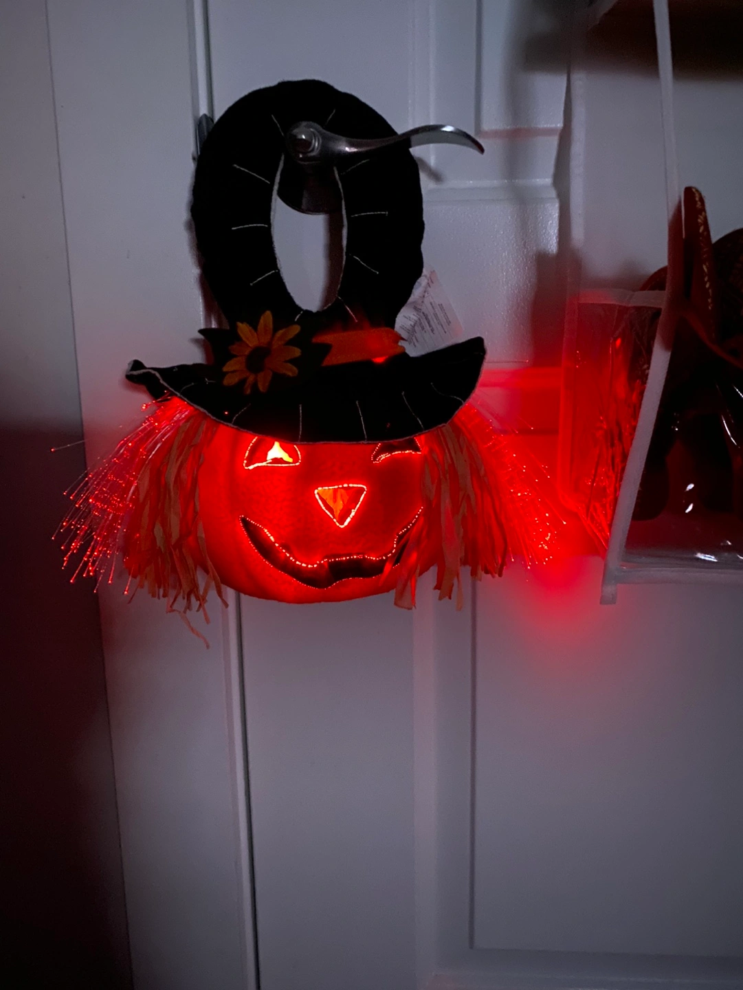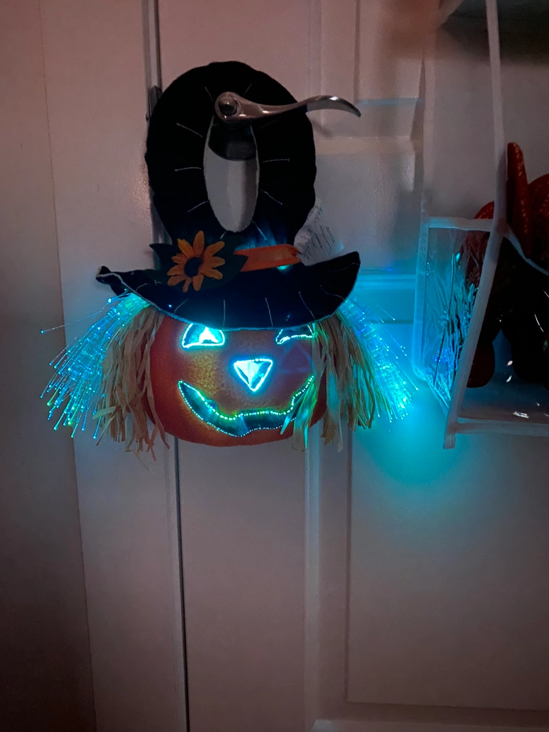 Light up pumpkin decoration. Has a black witch hat with a sunflower on it. Has a light up feature that changes colours. Lights up red, blue, and green, purple, etc. 3 AAA batteries included Can be used to hang on door knob or door hook for wreath, or on table counter tops, etc Pick up 34th E Ave & Victoria Drive, Vancouver