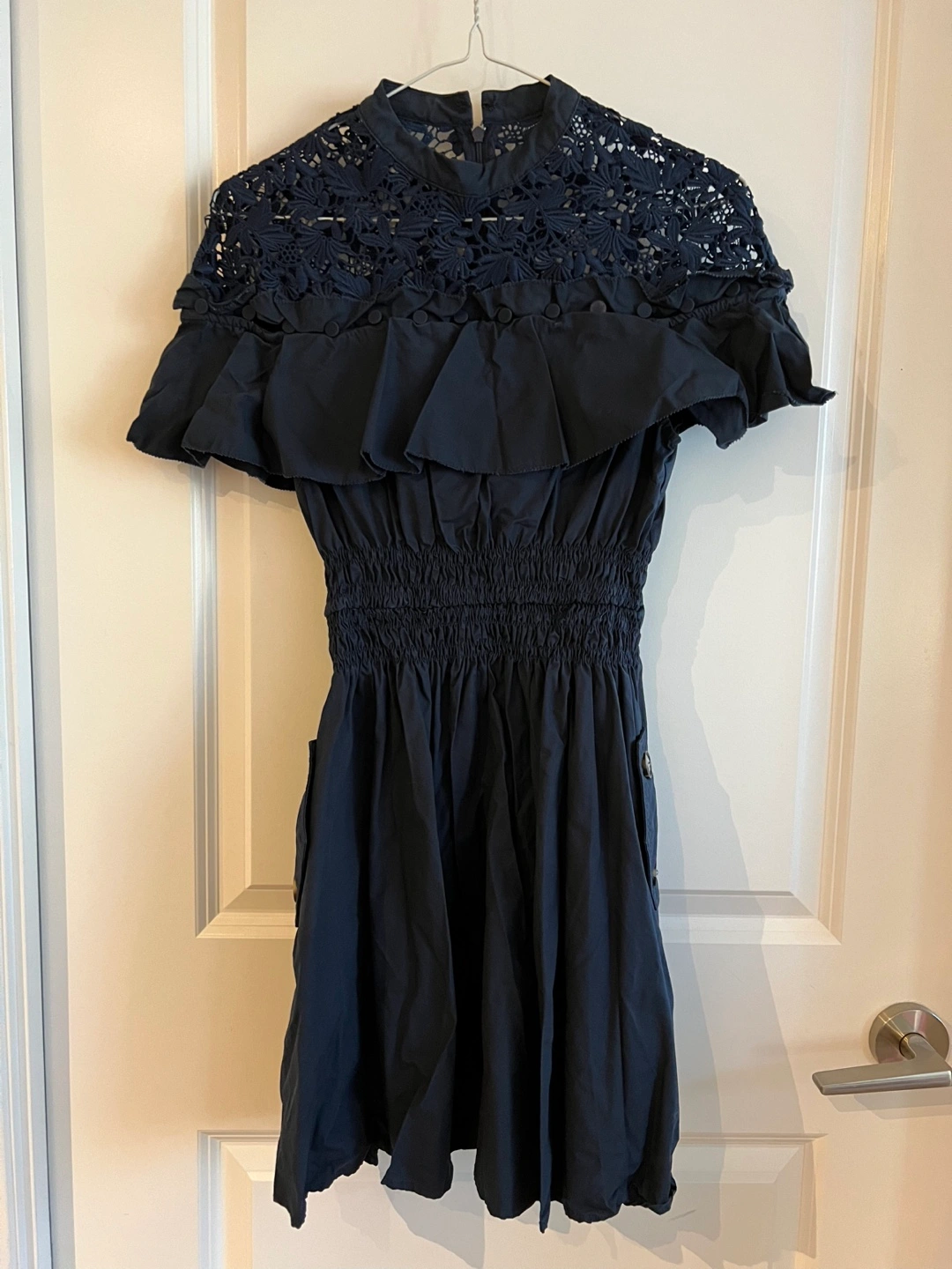 Short sleeve, navy blue, mini dress with lace detailing. Features an elastic waist and a ruffle detail. mint condition cash & pick up only