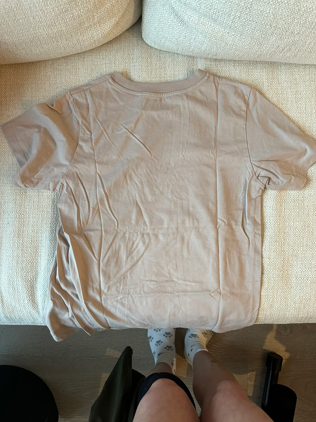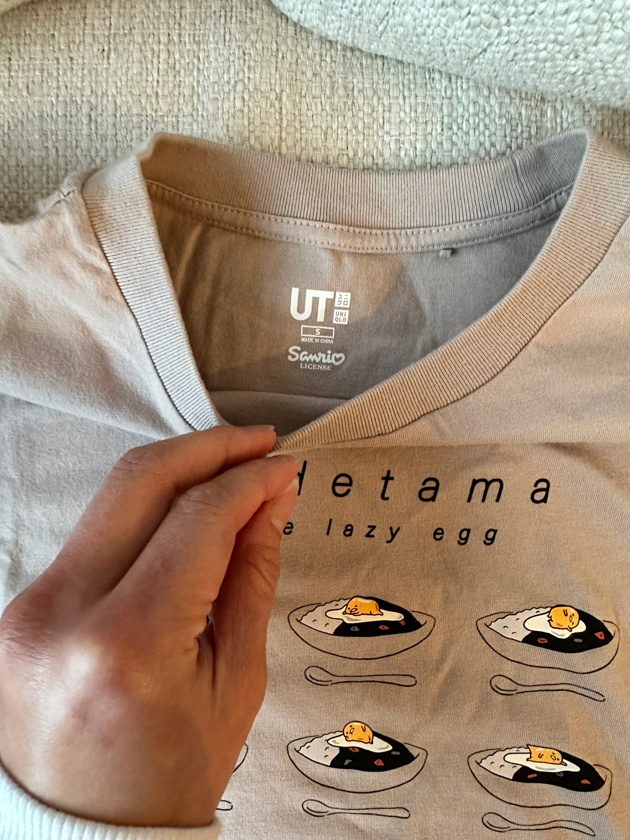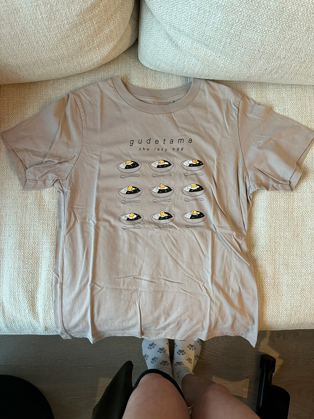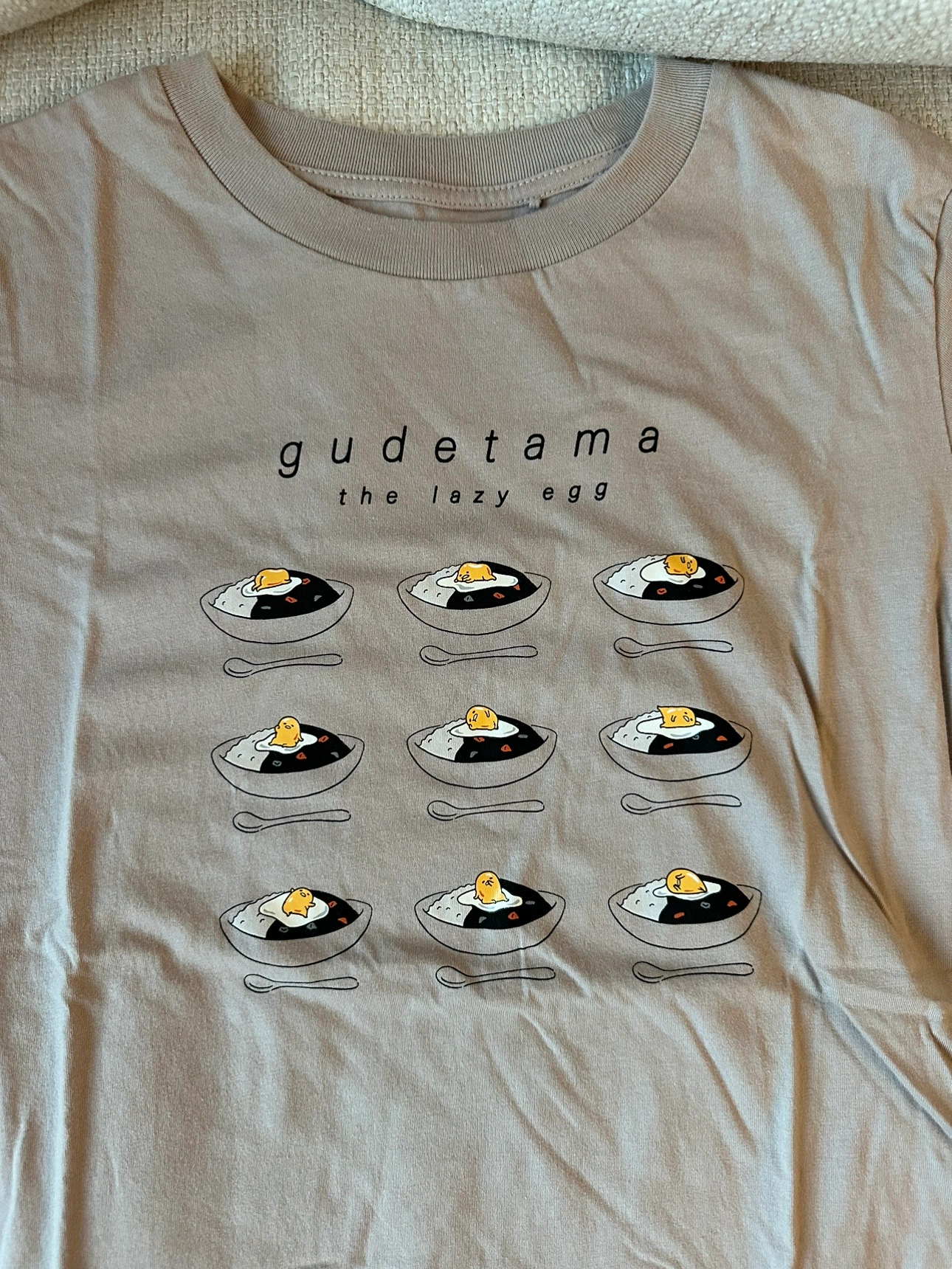 Tan coloured short-sleeved T-shirt featuring a Gudetama design. The front of the shirt has a graphic of Gudetama in a bowl of rice, with a black and white colour scheme. Worn once, washed. Excellent condition. No pets, non-smoking. Pickup near Yonge/King.