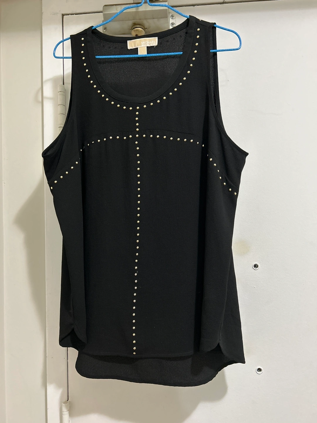 Black sleeveless tank top with gold studs. Round neckline. Slightly longer in the back.