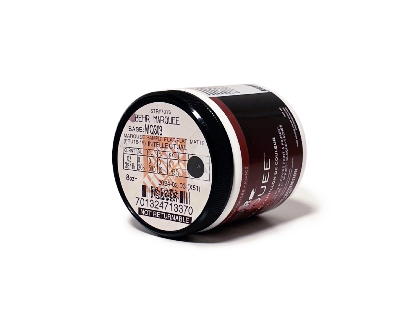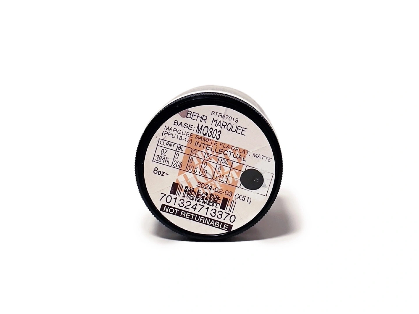 New Behr Marquee interior matte paint and primer. Mixed at Home Depot on February 3, 2024. Minimum shelf life is 2 years. Comes from a smoke-free, pet-free household. Hue: PPU18-19 Intellectual (One-Coat Hide) Size: 8oz sample Purchased for $7 “Grey colour family. The thinking person's paint, Intellectual is as bold and eye-catching as a brilliant idea. It is a deep gray made rich with the slightest undertone of warm leathery brown.” (behr.ca)