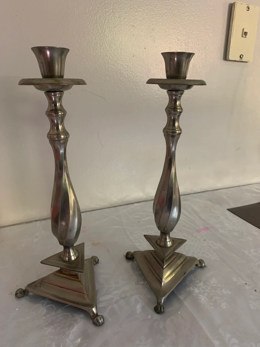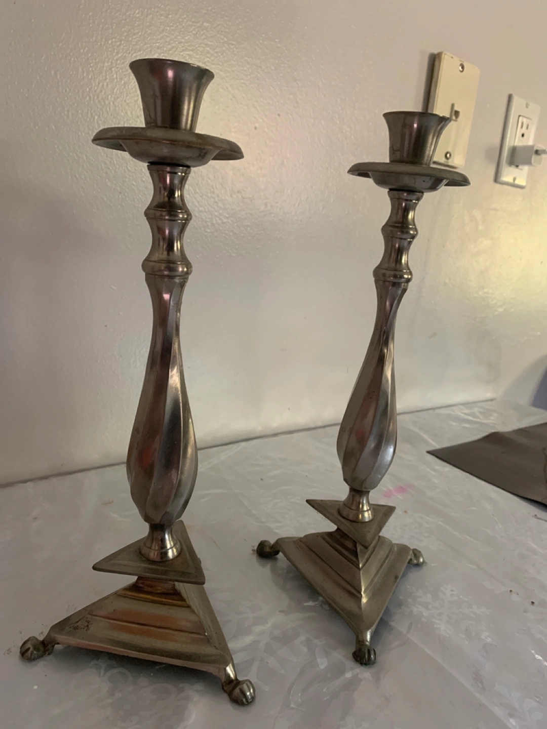 Set of two silver candle holders. They have a triangular base and a unique design. In good condition.