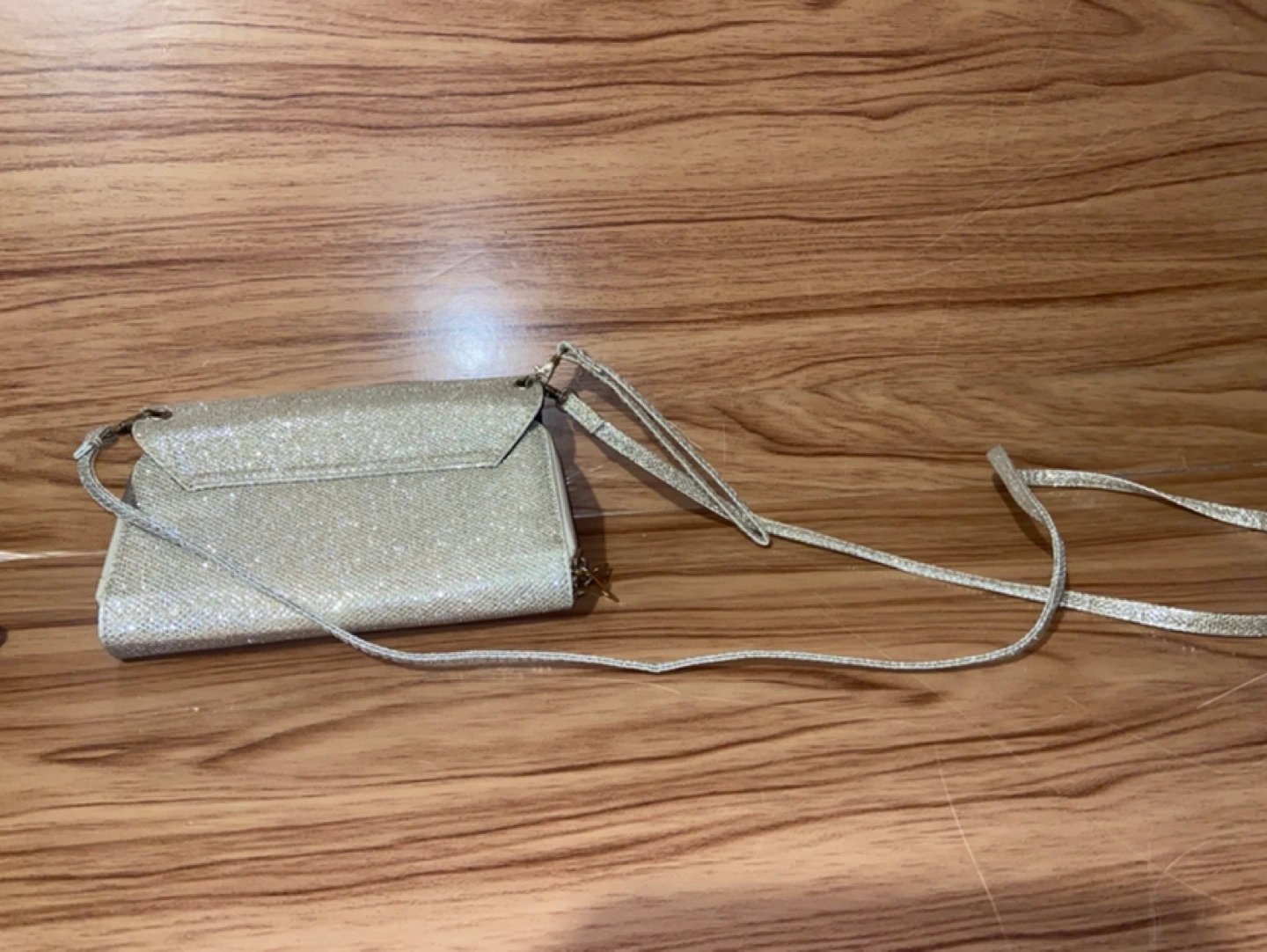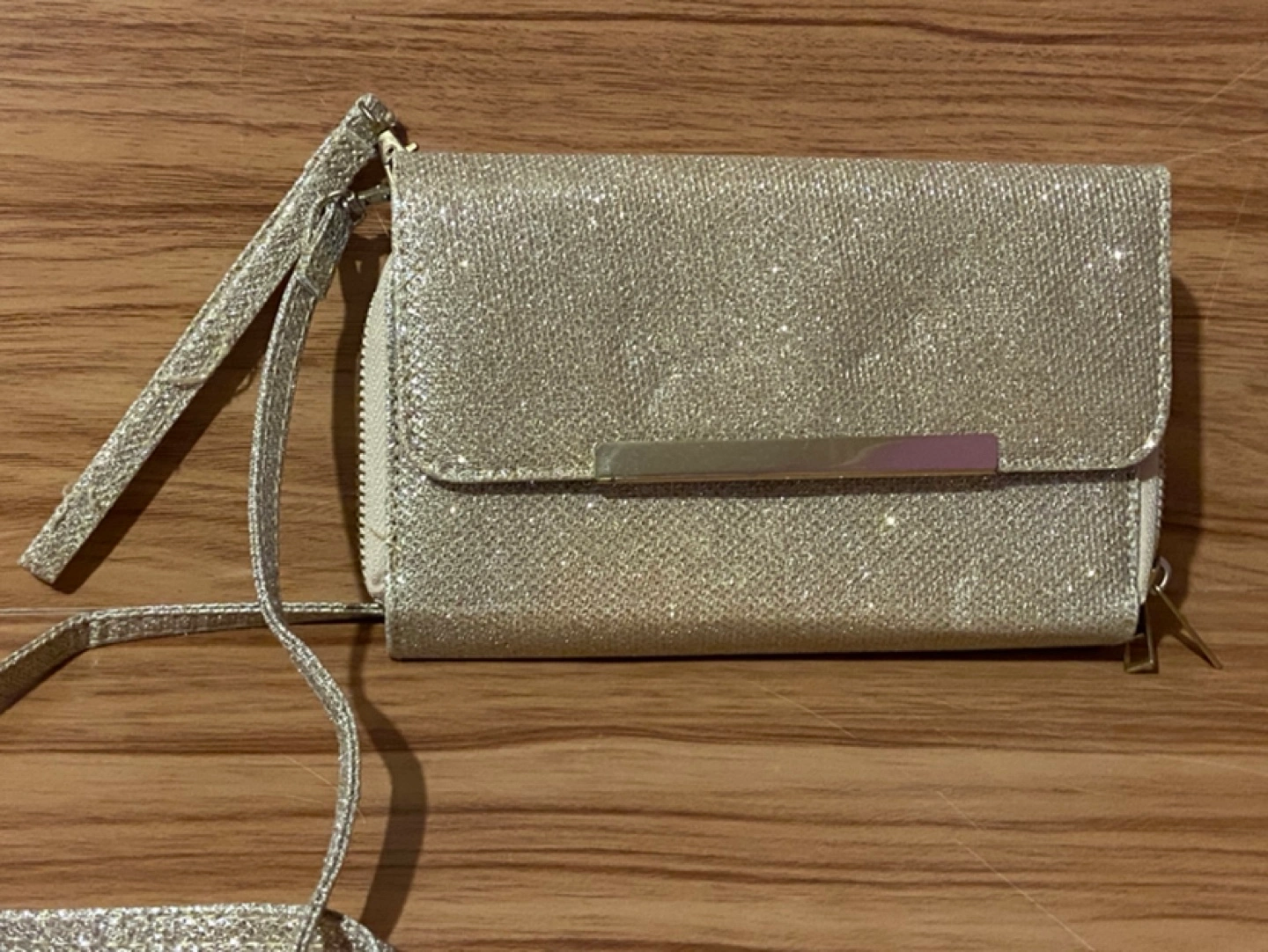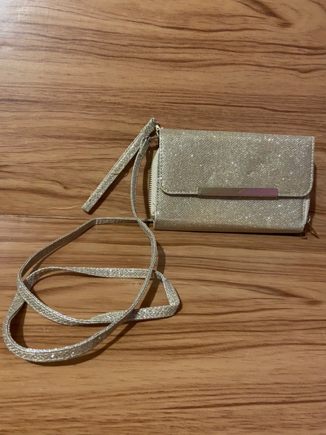 Condition- used once In very good condition and shape Zippers works No rips, no wear or tear Colour- gold with sparkles Can be use as a wristlet, cross over the shoulder, side of the shoulder. Pocket for coins Slots for cards Approximately measurements Length 8 inches Width 1 1/2 inches Height 4 1/2 inches Cash Payment No Refunds / Exchange No try ons, No trading No holds. All purchases are Finally Sale From a Smoke Free home First come, First Serve Price-$5 Cash only Pick up only