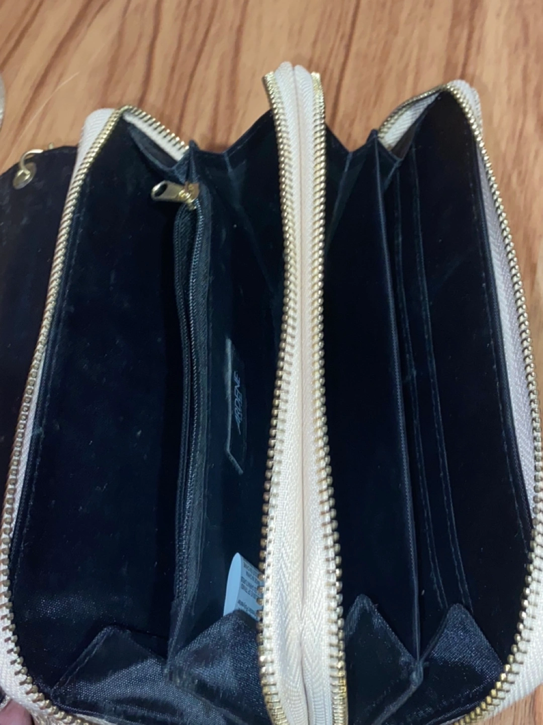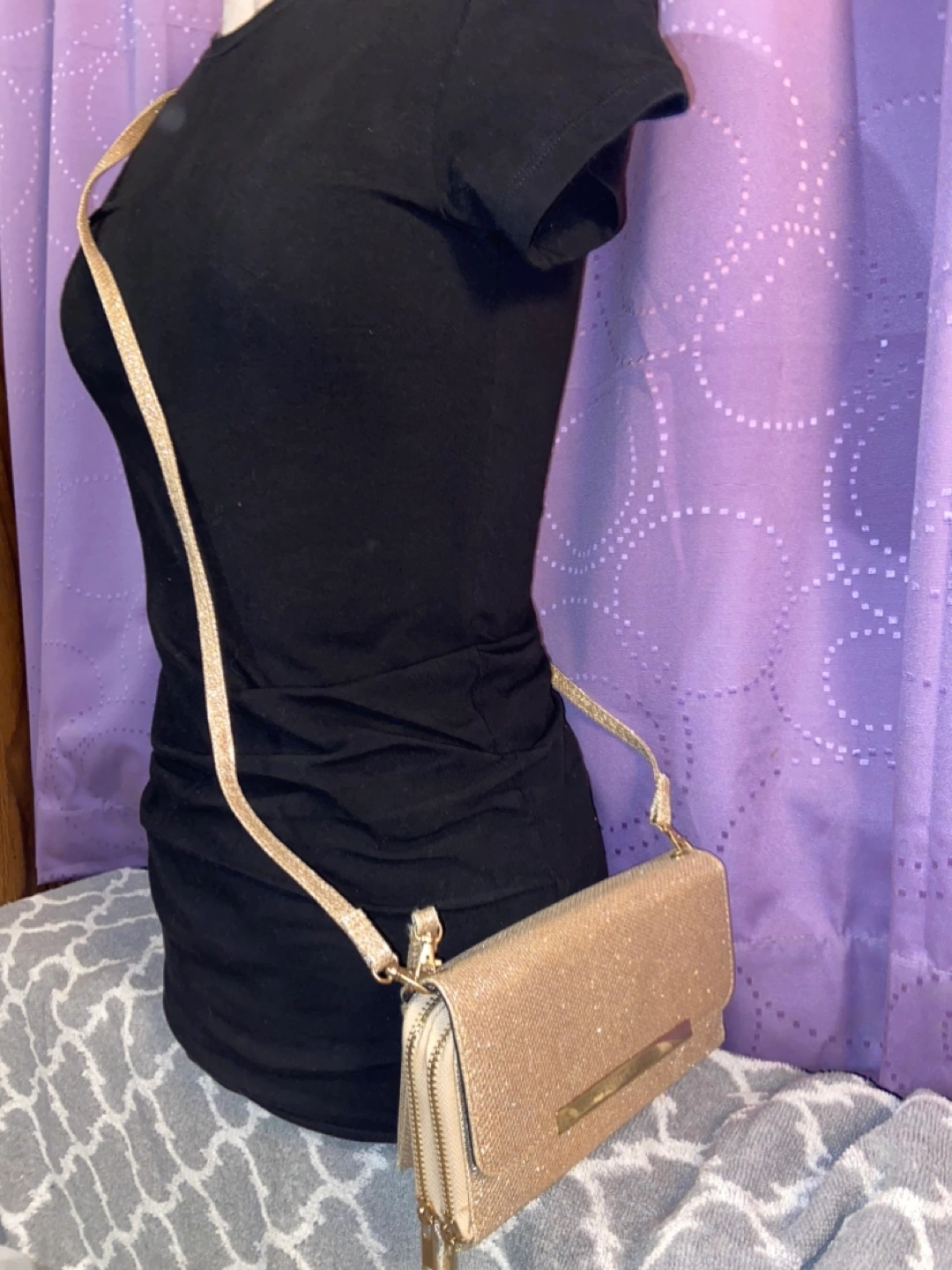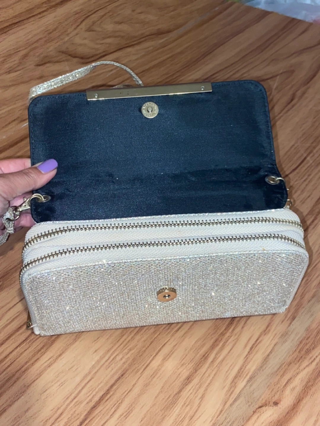 Condition- used once In very good condition and shape Zippers works No rips, no wear or tear Colour- gold with sparkles Can be use as a wristlet, cross over the shoulder, side of the shoulder. Pocket for coins Slots for cards Approximately measurements Length 8 inches Width 1 1/2 inches Height 4 1/2 inches Cash Payment No Refunds / Exchange No try ons, No trading No holds. All purchases are Finally Sale From a Smoke Free home First come, First Serve Price-$5 Cash only Pick up only
