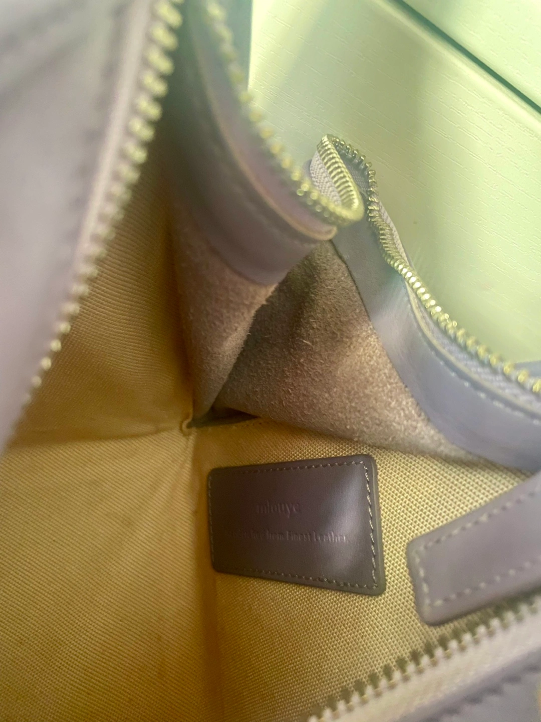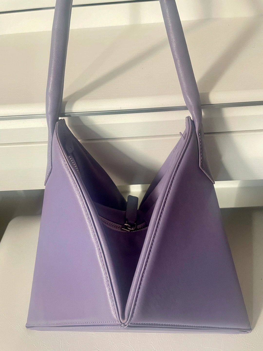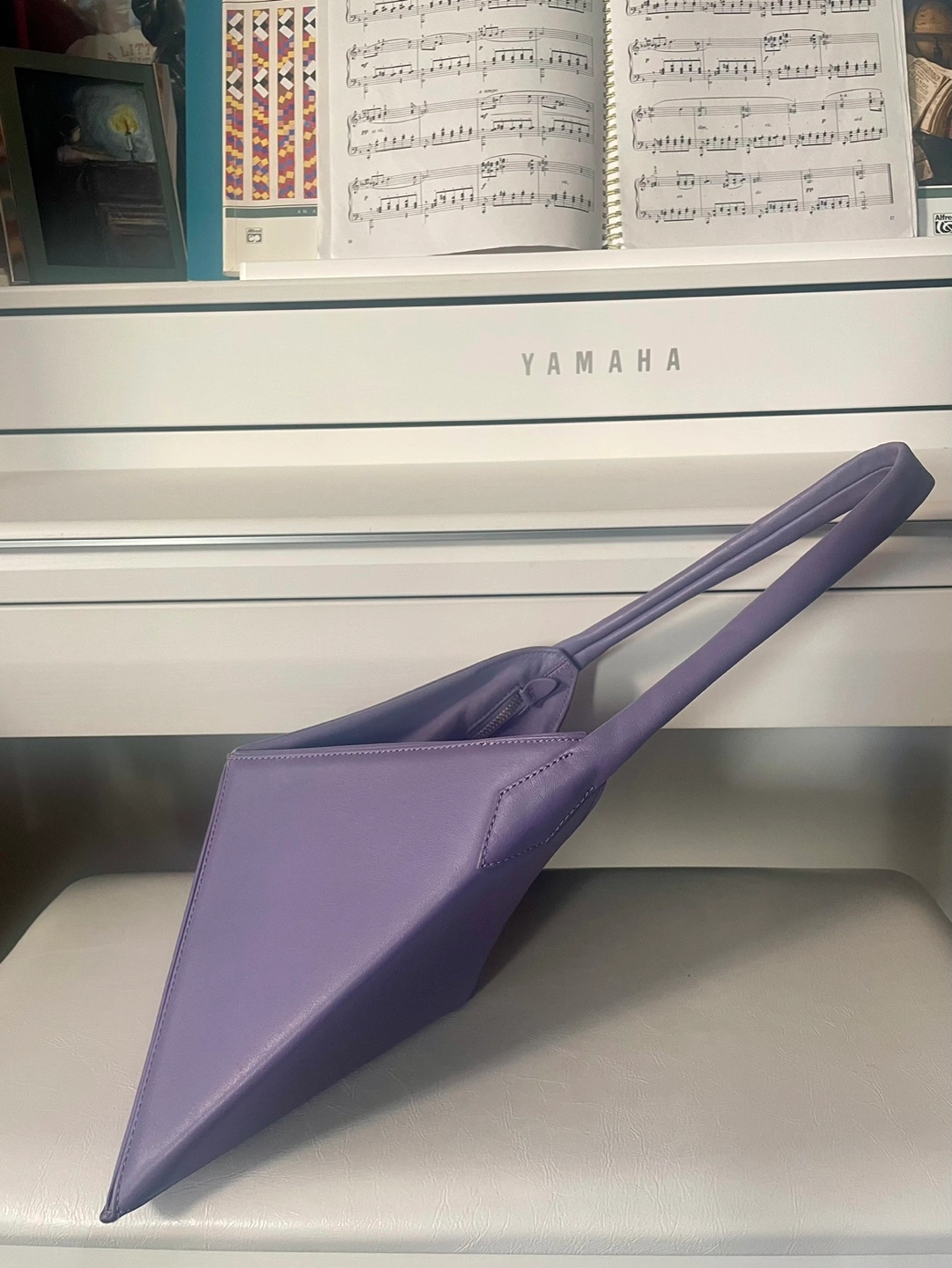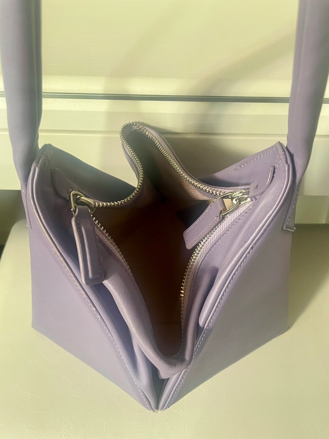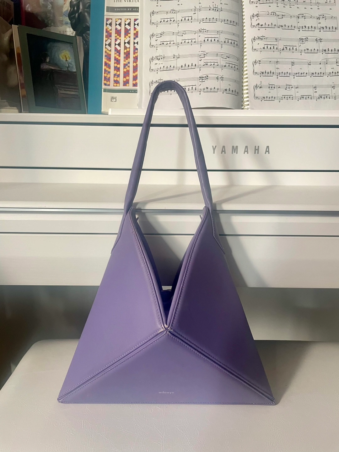 Gently used Mlouye shoulder leather bag, lavender coloured with geometric design, chic and timeless! In great condition, original dust bag included. 10 1/2” H x 12 1/4” W Pick up around Sherbourne/ Wellesley Could ship/ deliver for a fee