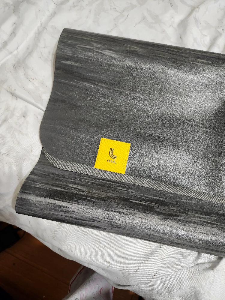 Grey yoga mat with a wood-grain pattern. Lole brand.