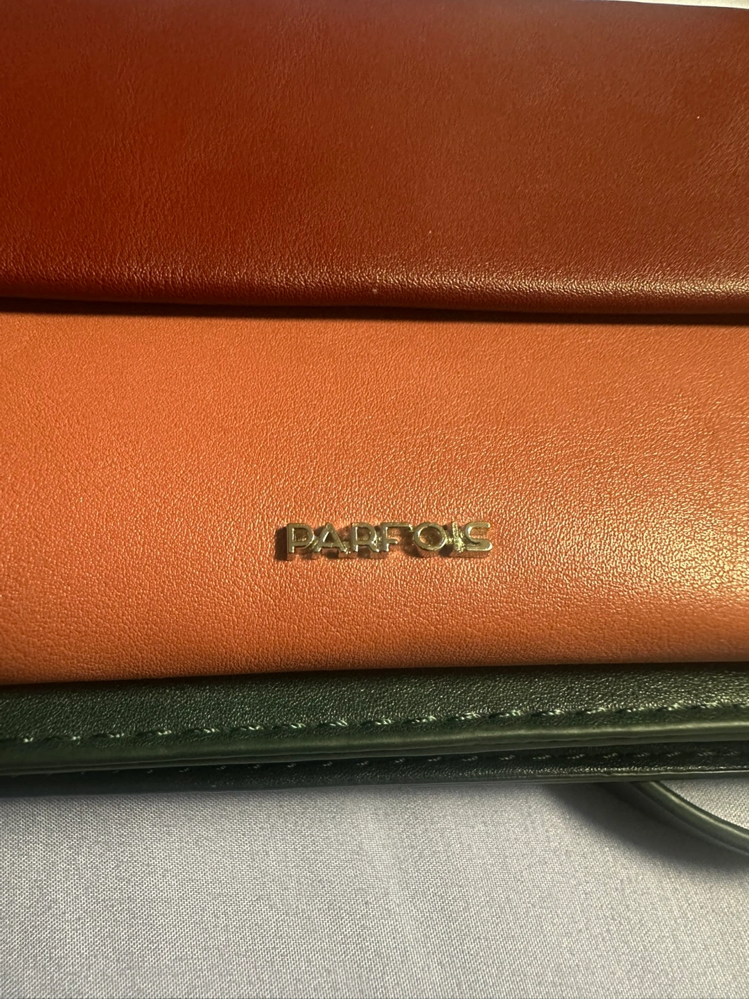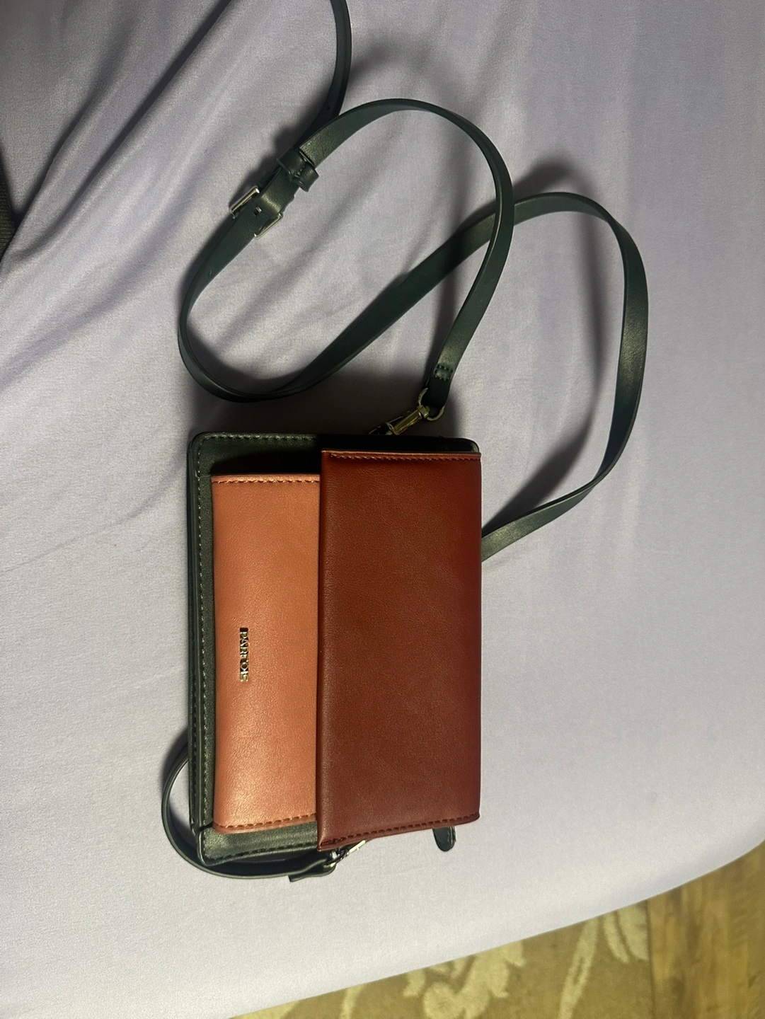 Small crossbody bag with a long strap. Green, red and pink coloured leather with a gold zipper and clasp.