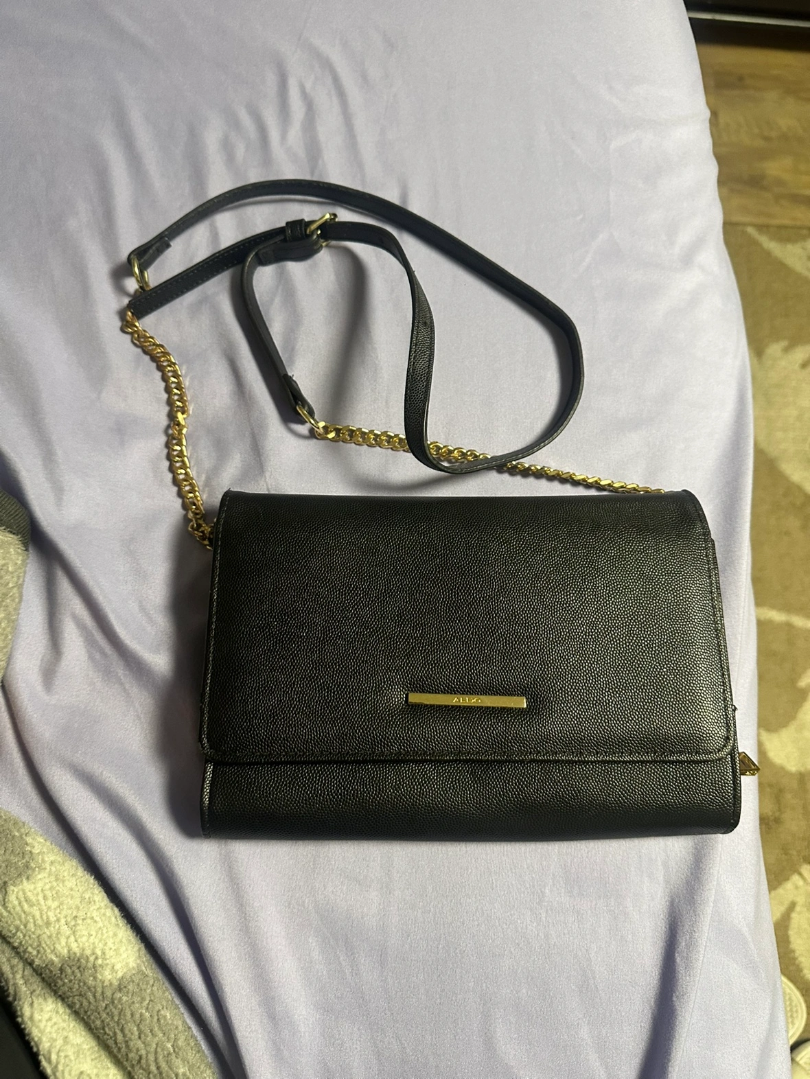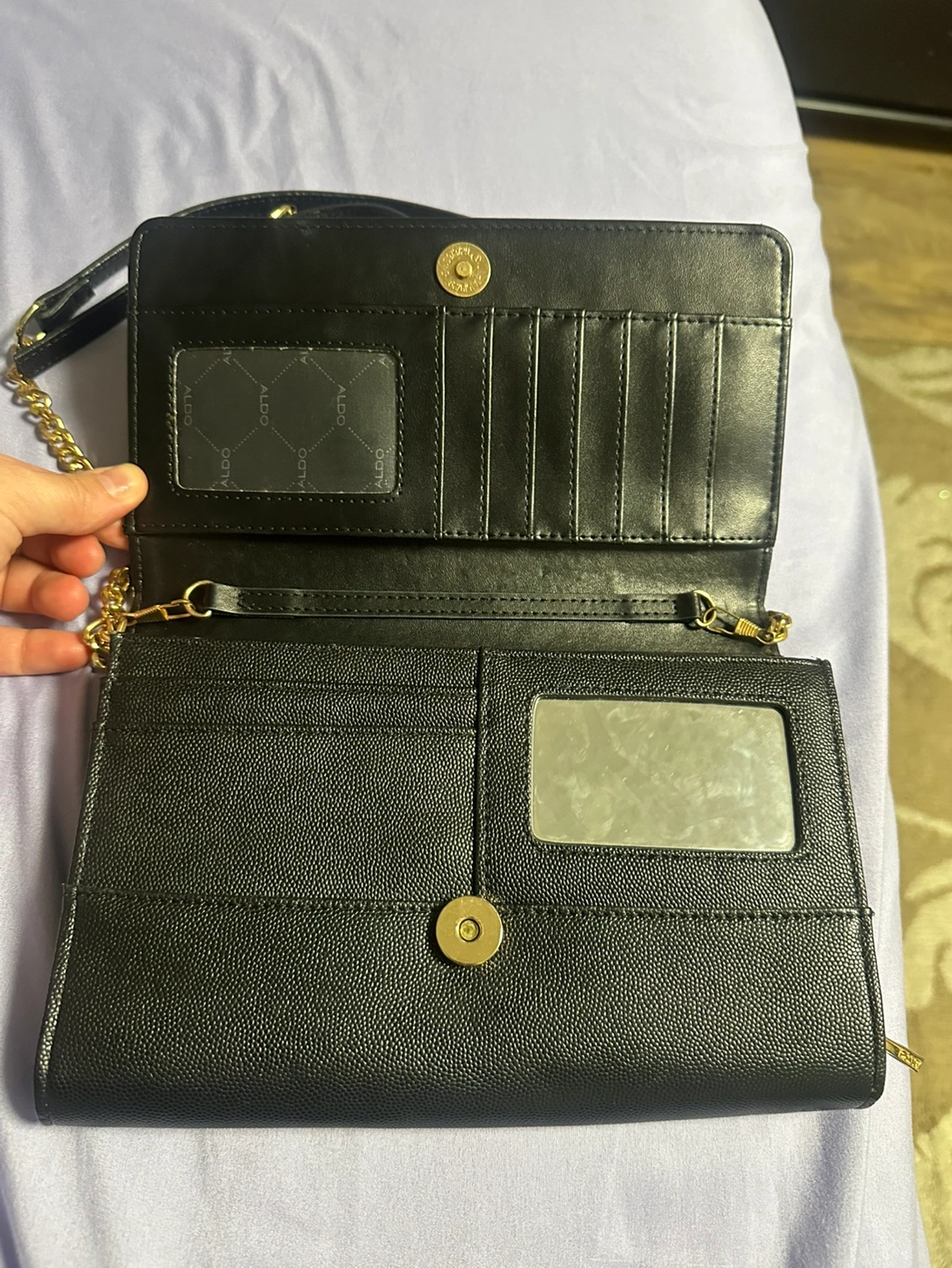 Black wallet purse with a gold chain strap. Has multiple card slots and a zipper compartment.