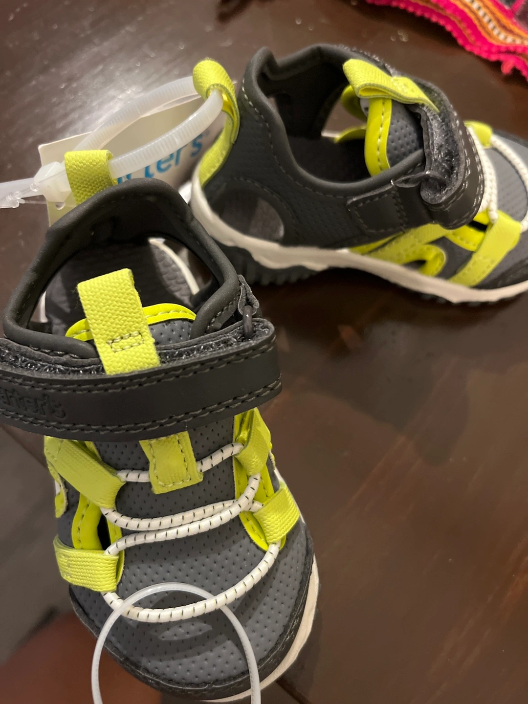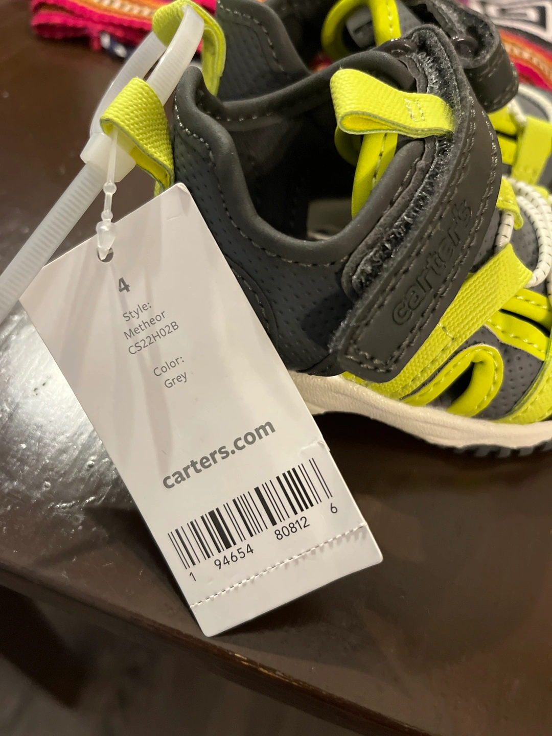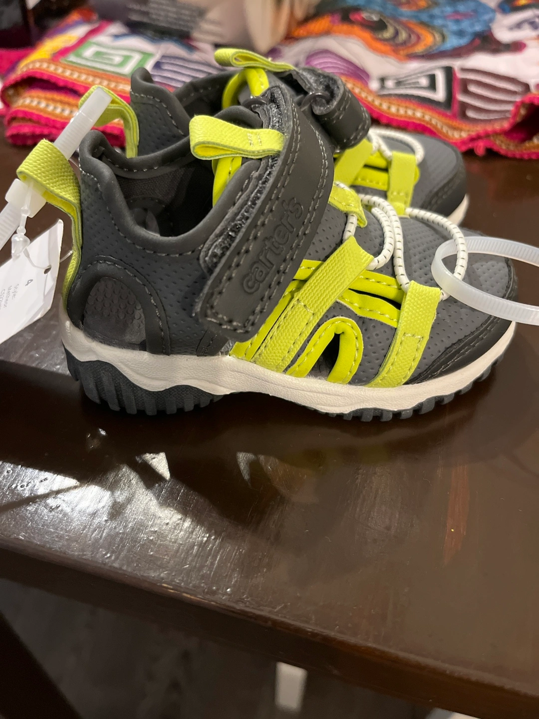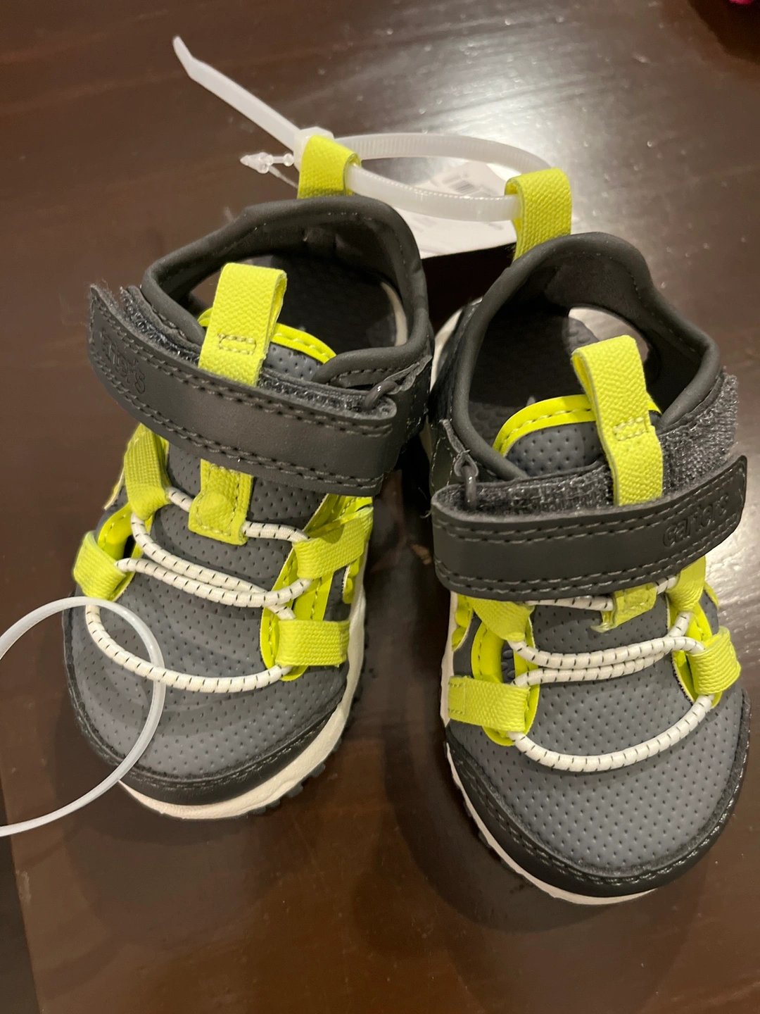 Grey and neon green baby sandals with velcro closures. Size 4. Original price 34cad