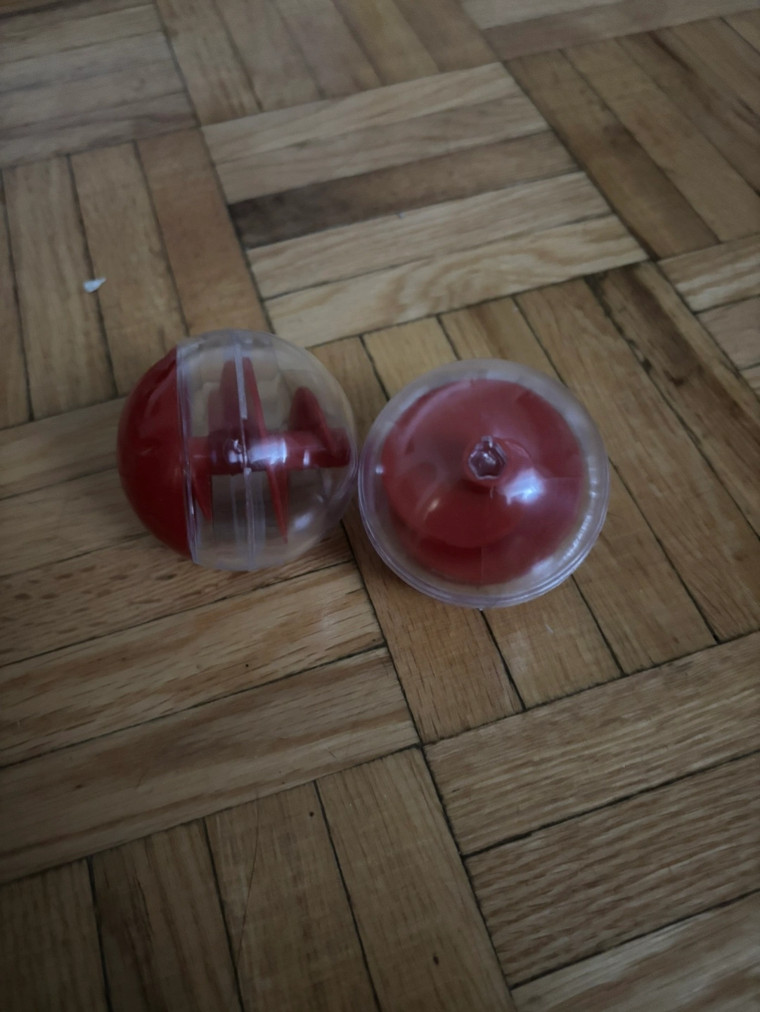 Two clear plastic balls with red bottoms. One ball has a spinning inner part and the other has a flat red bottom.