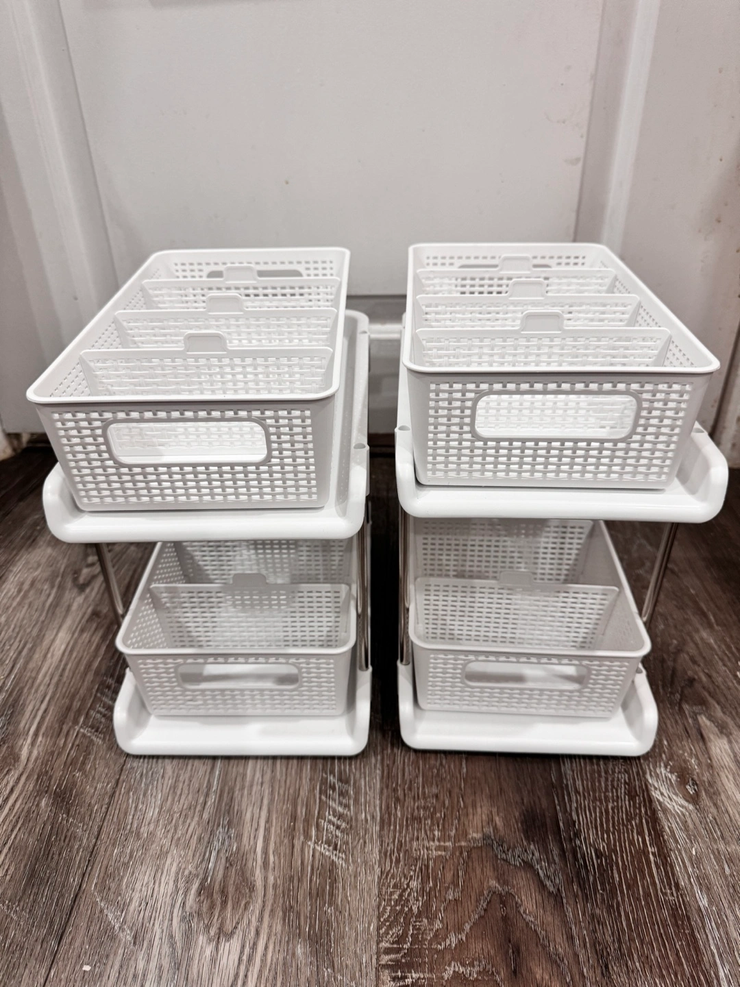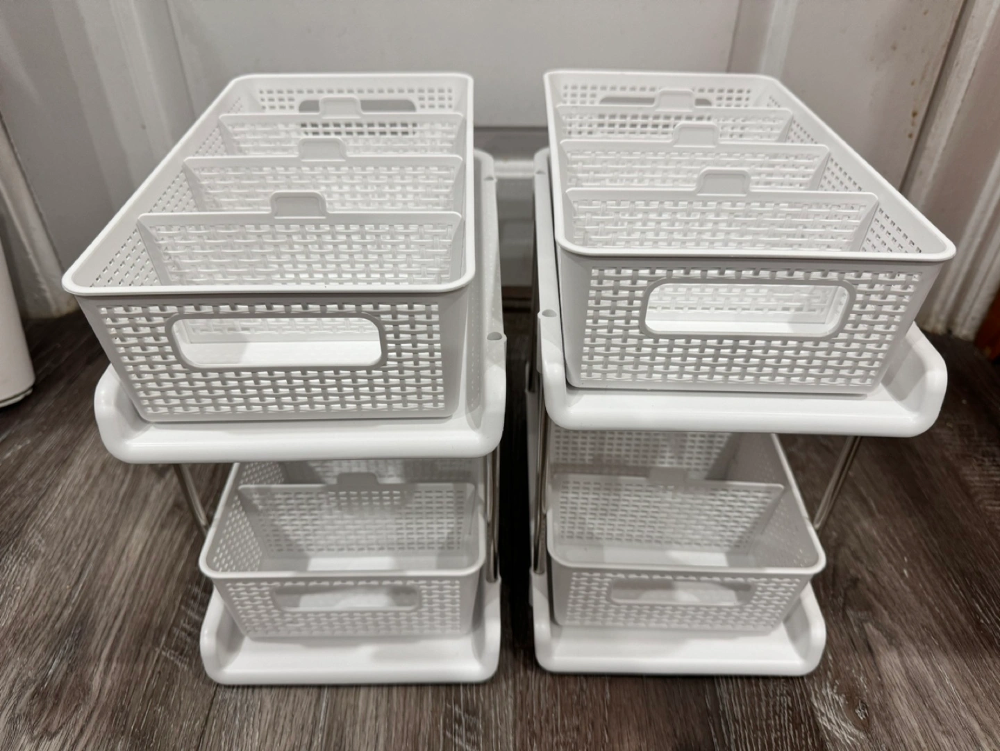 New- Set of 2 2 Tier pull out Tray Sliding Drawer/Storage. Each basket has dividers that can be removed or rearranged. One single retails online for 30$ Size: 14.4"L X 8.25"W X 9.9"H (36.6 cm L x 21.0 cm W x 25.1 cm H). Pickup at Sherboune and Dundas Fastest pickup preferred