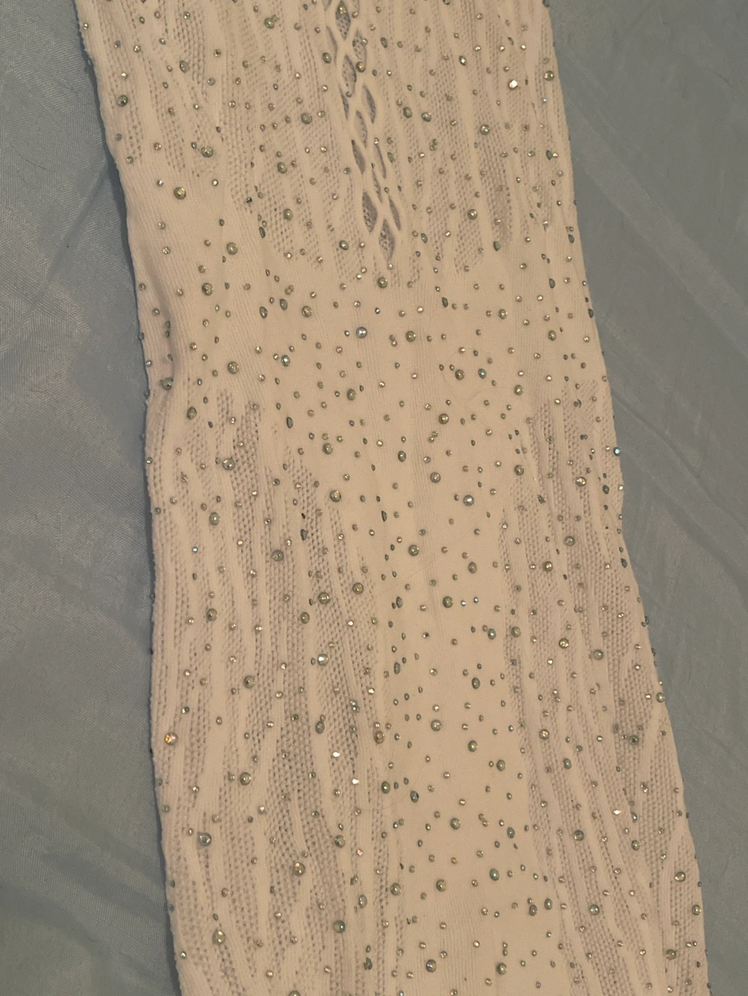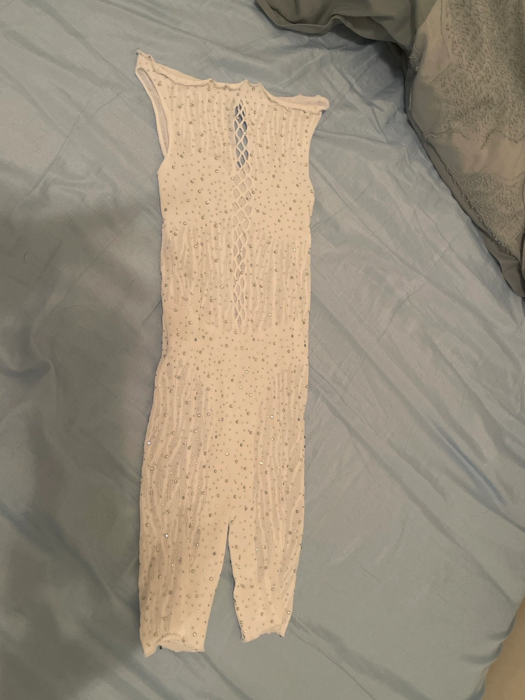White bodysuit with rhinestones. Sleeveless and features a keyhole neckline. Buy three items from my listings and get one under 10 for free! Multiple purchases come with decent discounts!