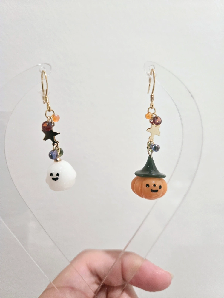 Cute Halloween earrings featuring a pumpkin and a ghost. Gold tone with colourful beads. Pick up at Metrotown Cash Only