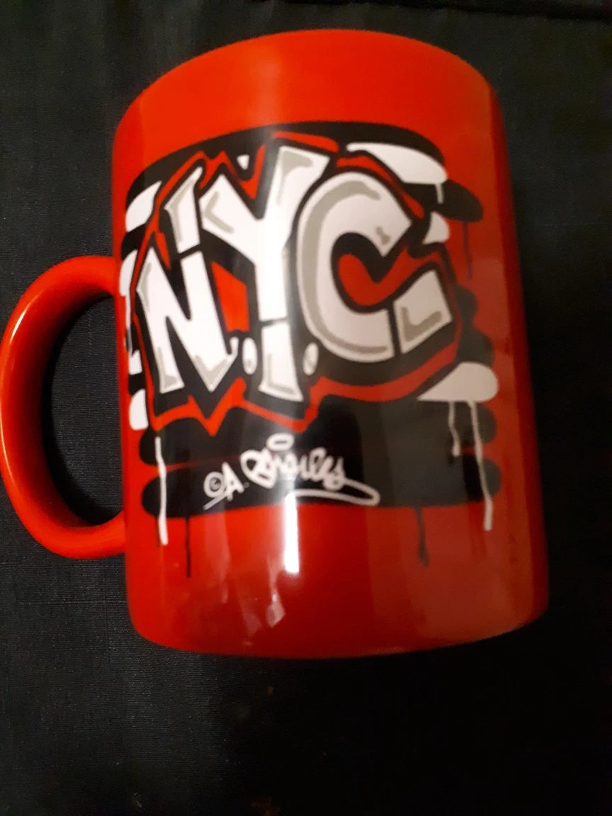 Red mug with black and white NYC graffiti design. Signature at the bottom.